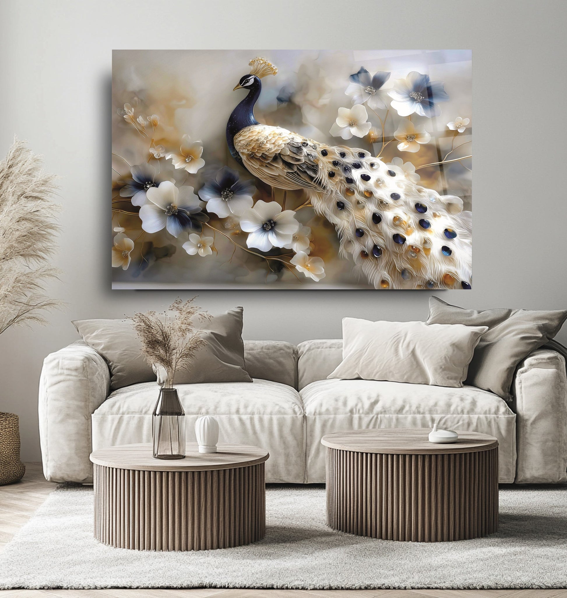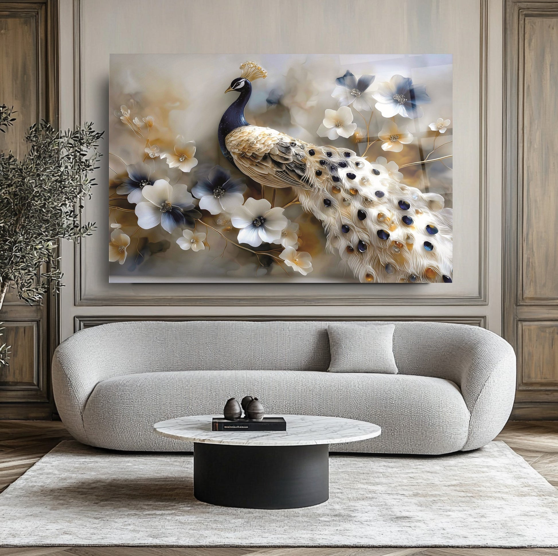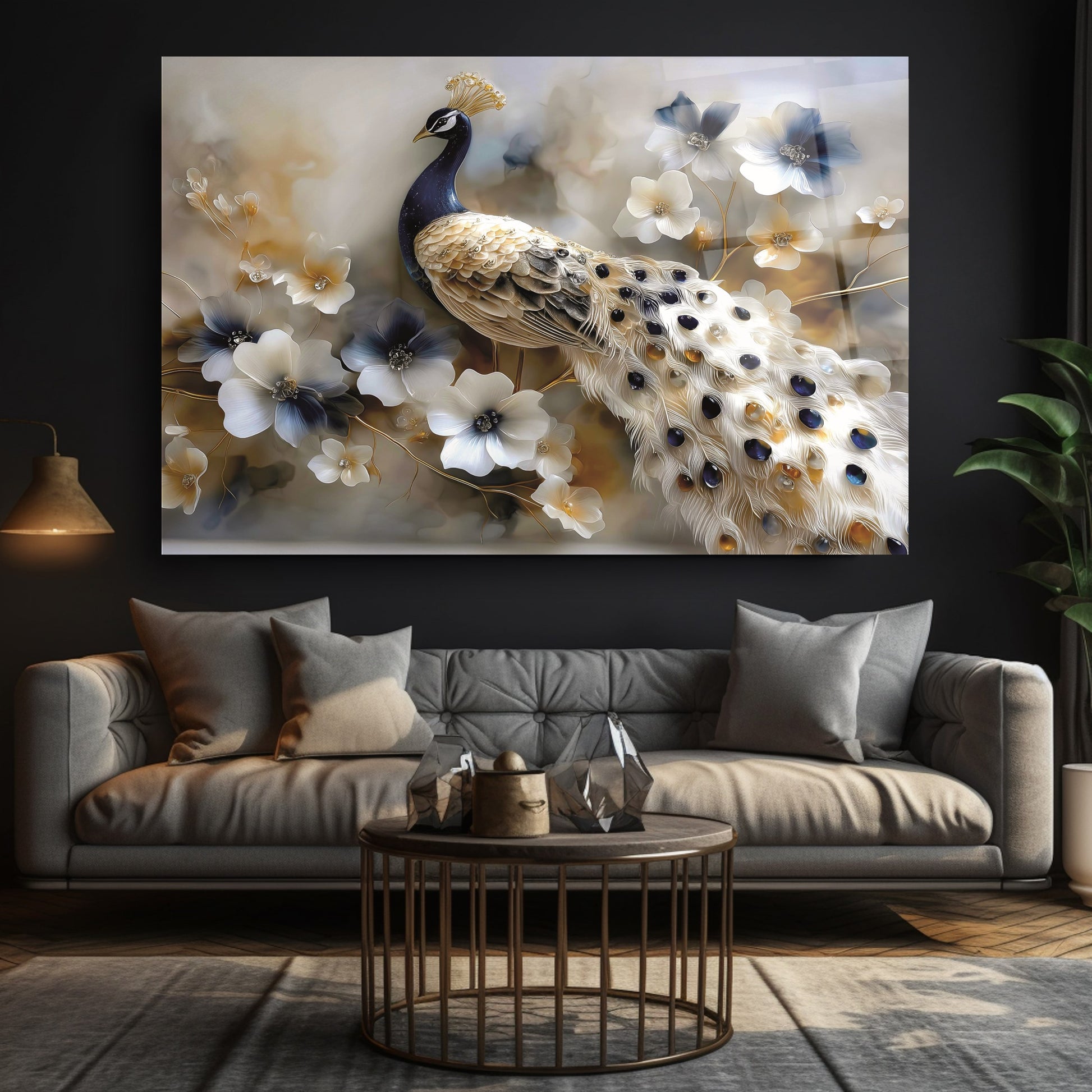 Mekanlarınıza Rengarenk Bir Zarafet: Mavi Beyaz Çiçekli Tavus Kuşu Cam Tablo
