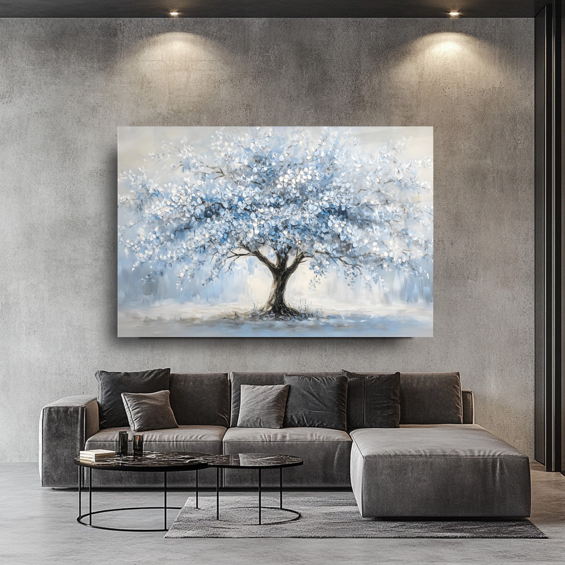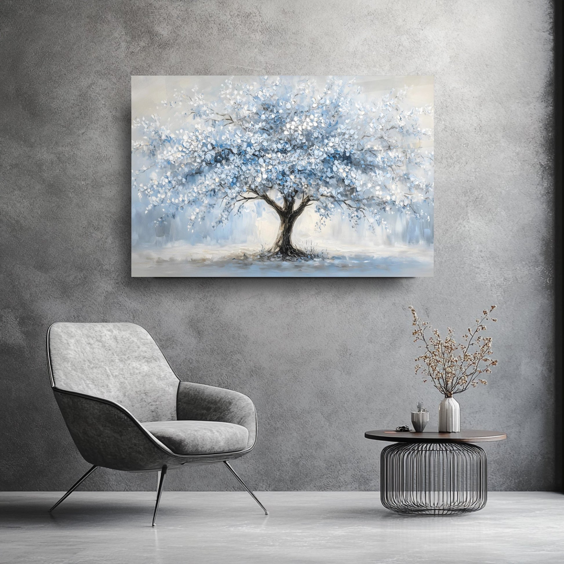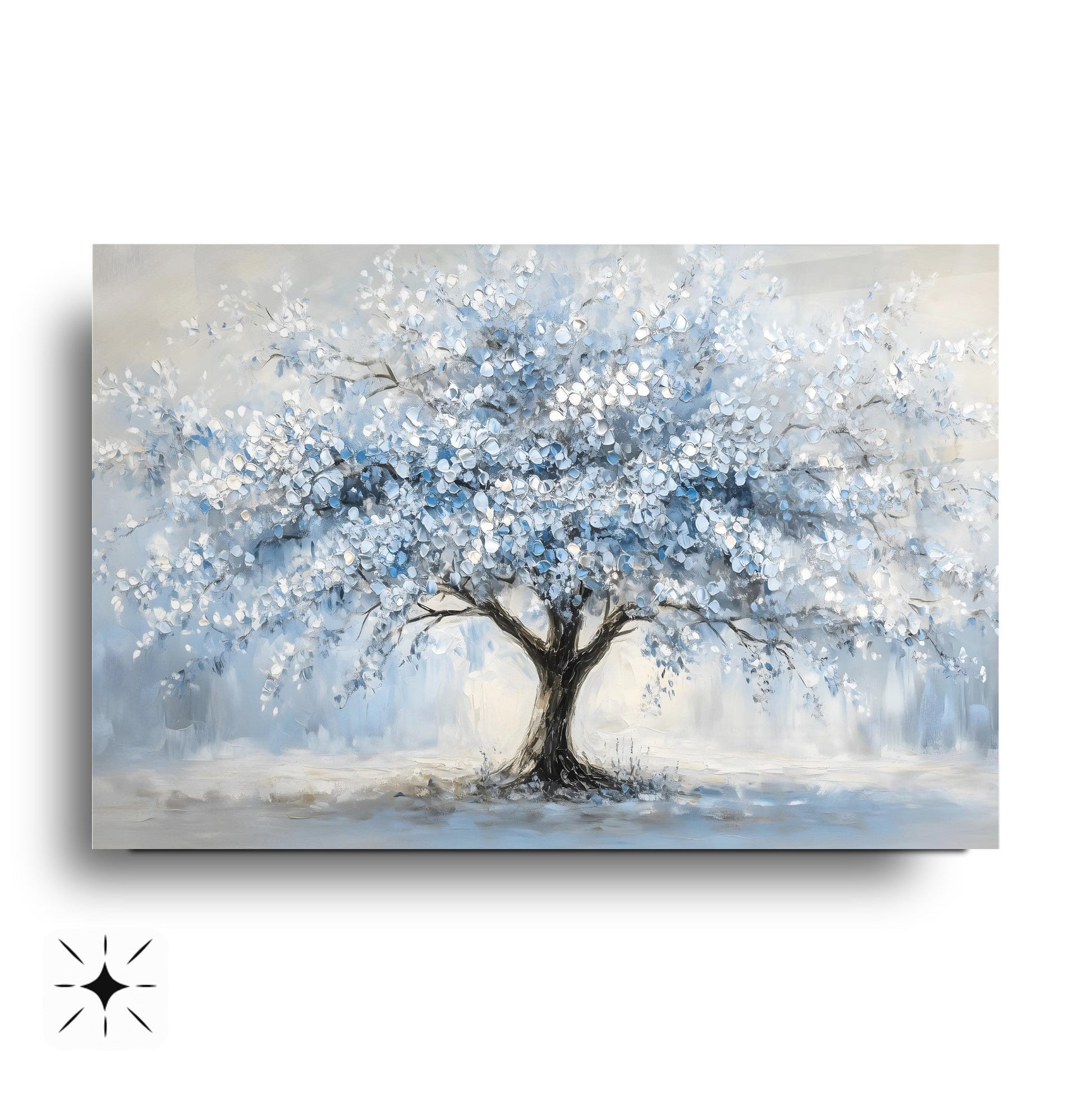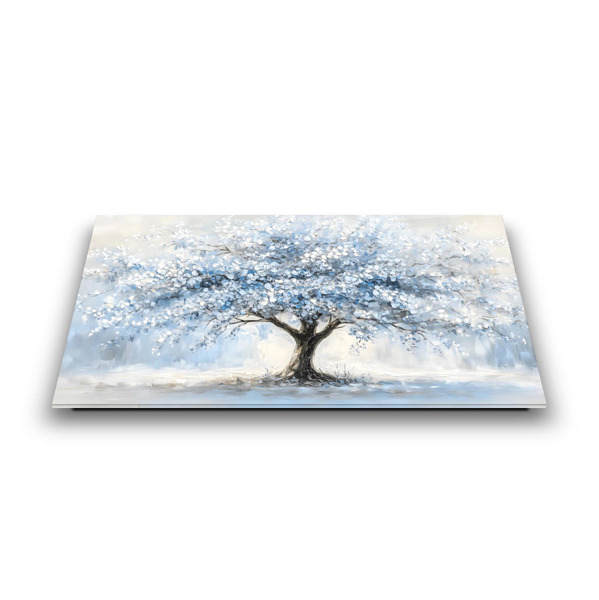 Bu zarif cam tablo, mavi ve beyaz yapraklarla kaplı hayat ağacı deseniyle her yaşam alanına huzur ve dinginlik katıyor. Altın yaldızlı tonlar, dekorasyona sofistike bir hava eklerken, detaylı dallar mekâna derinlik hissi kazandırıyor. 4 mm temperli cam ve HD UV baskı teknolojisi sayesinde renkler solmadan uzun süre korunur. Çerçevesiz, minimalist tasarımı salon, yatak odası veya ofiste estetik ve modern bir vurgu arayanlara hitap ediyor. Doğa temalı, şık ve kalite arayanlar için mükemmel bir seçimdir.