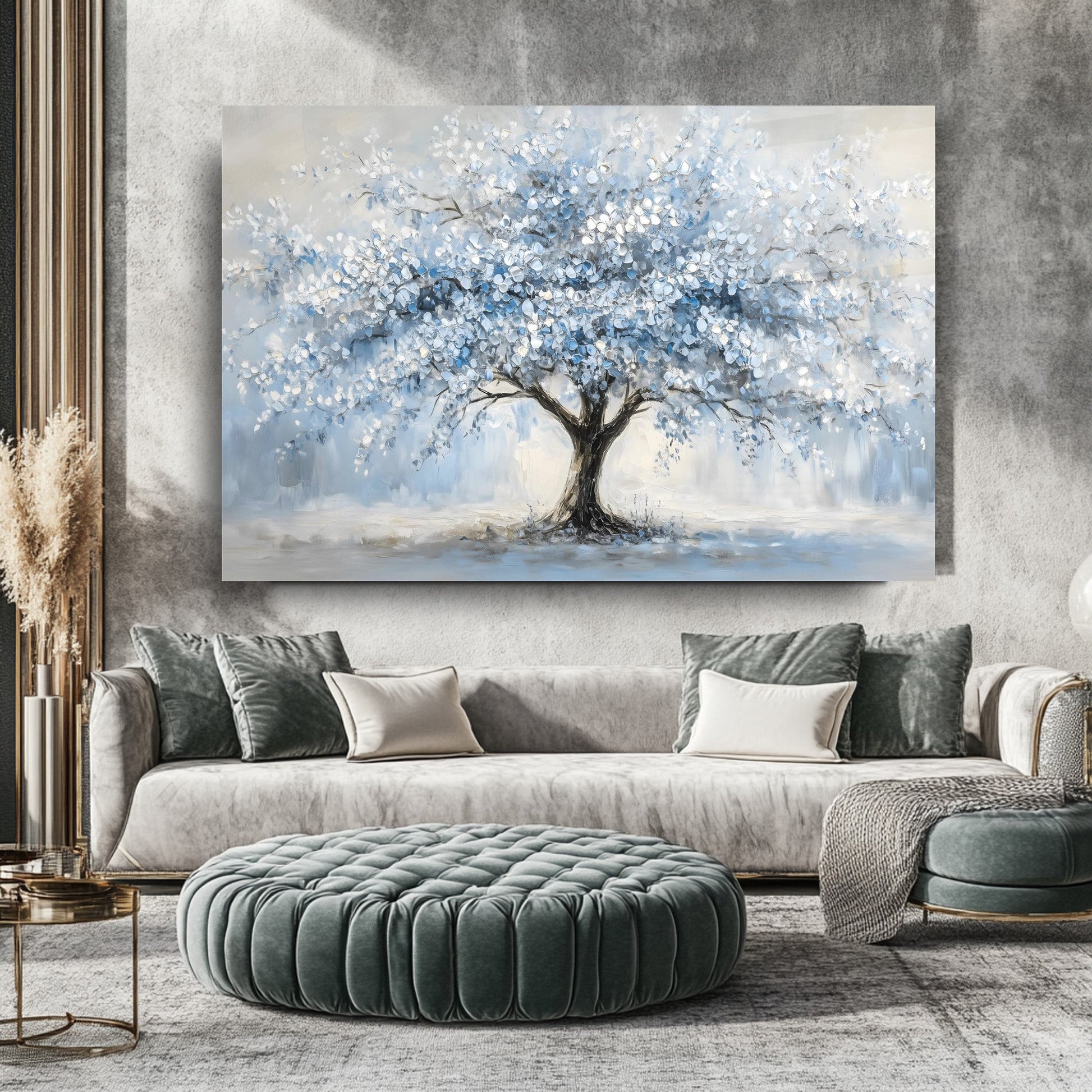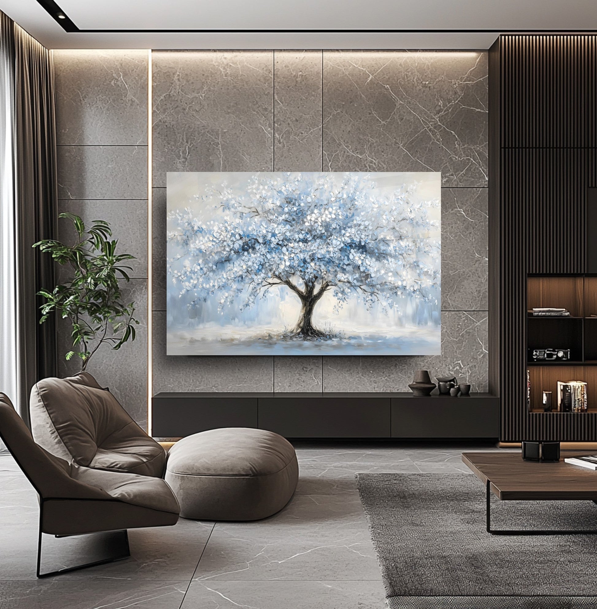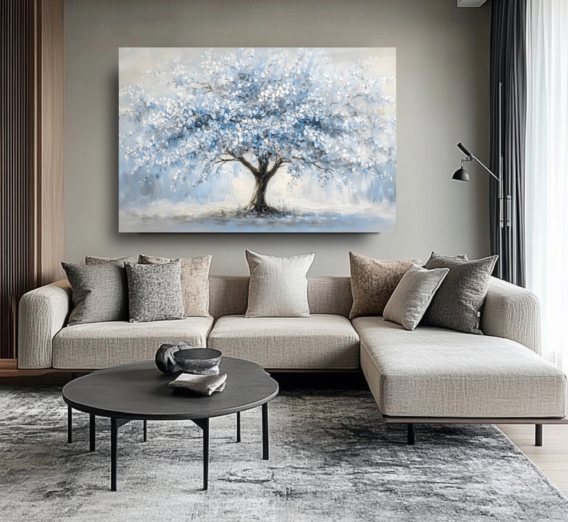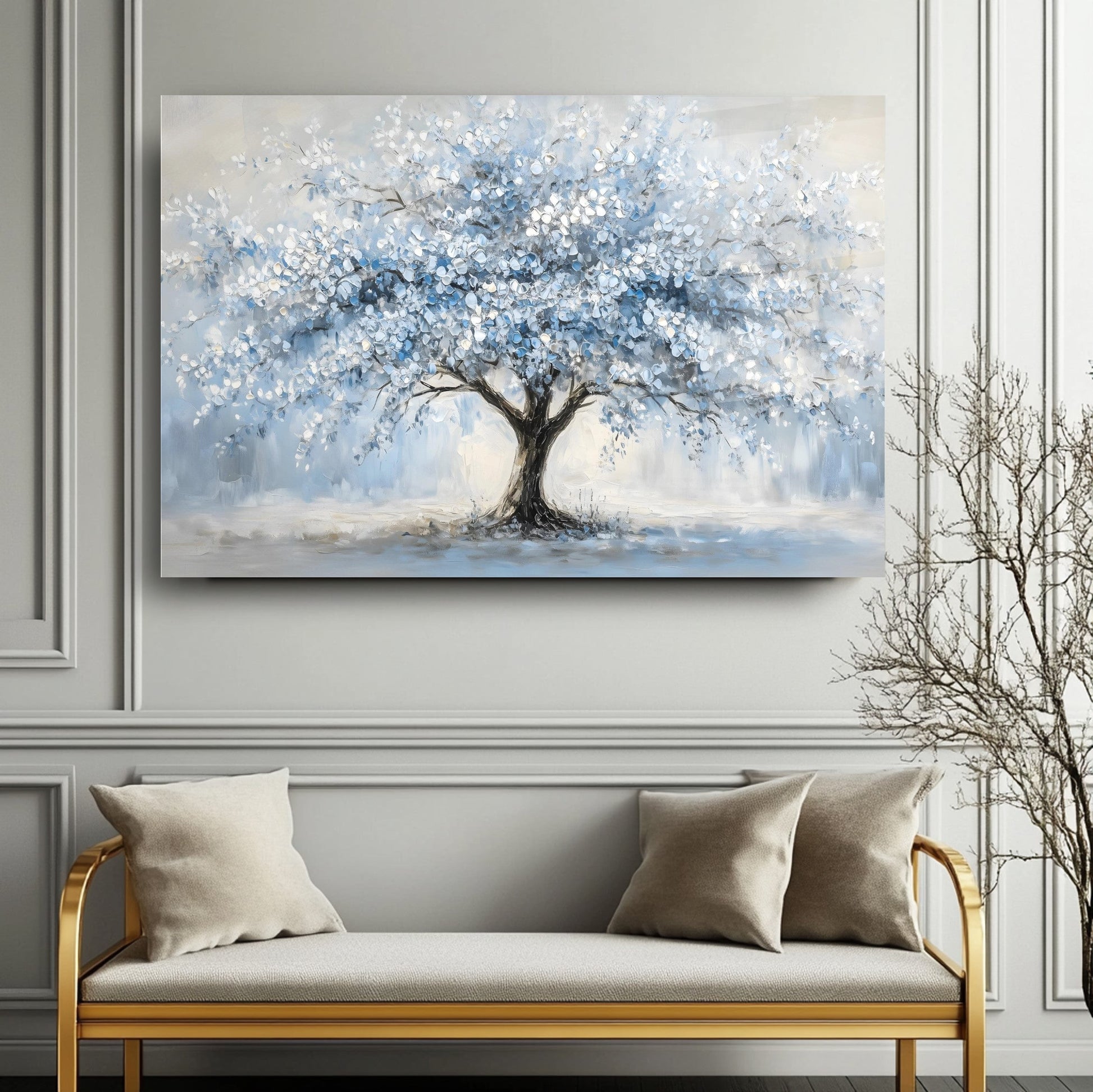 Bu zarif cam tablo, mavi ve beyaz yapraklarla kaplı hayat ağacı deseniyle her yaşam alanına huzur ve dinginlik katıyor. Altın yaldızlı tonlar, dekorasyona sofistike bir hava eklerken, detaylı dallar mekâna derinlik hissi kazandırıyor. 4 mm temperli cam ve HD UV baskı teknolojisi sayesinde renkler solmadan uzun süre korunur. Çerçevesiz, minimalist tasarımı salon, yatak odası veya ofiste estetik ve modern bir vurgu arayanlara hitap ediyor. Doğa temalı, şık ve kalite arayanlar için mükemmel bir seçimdir.