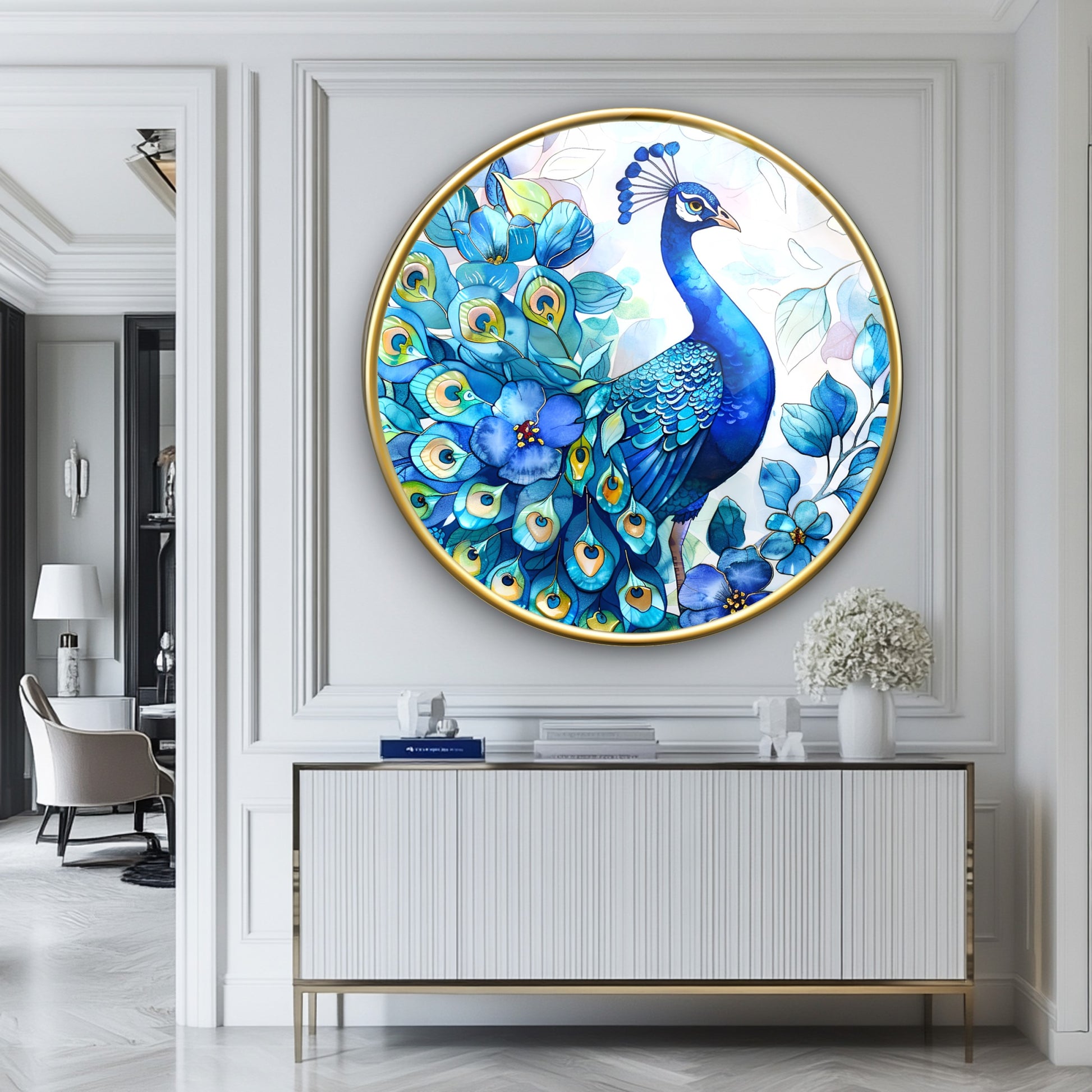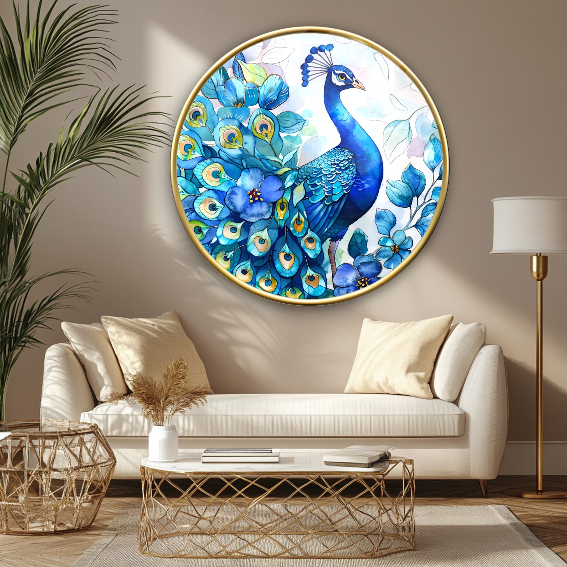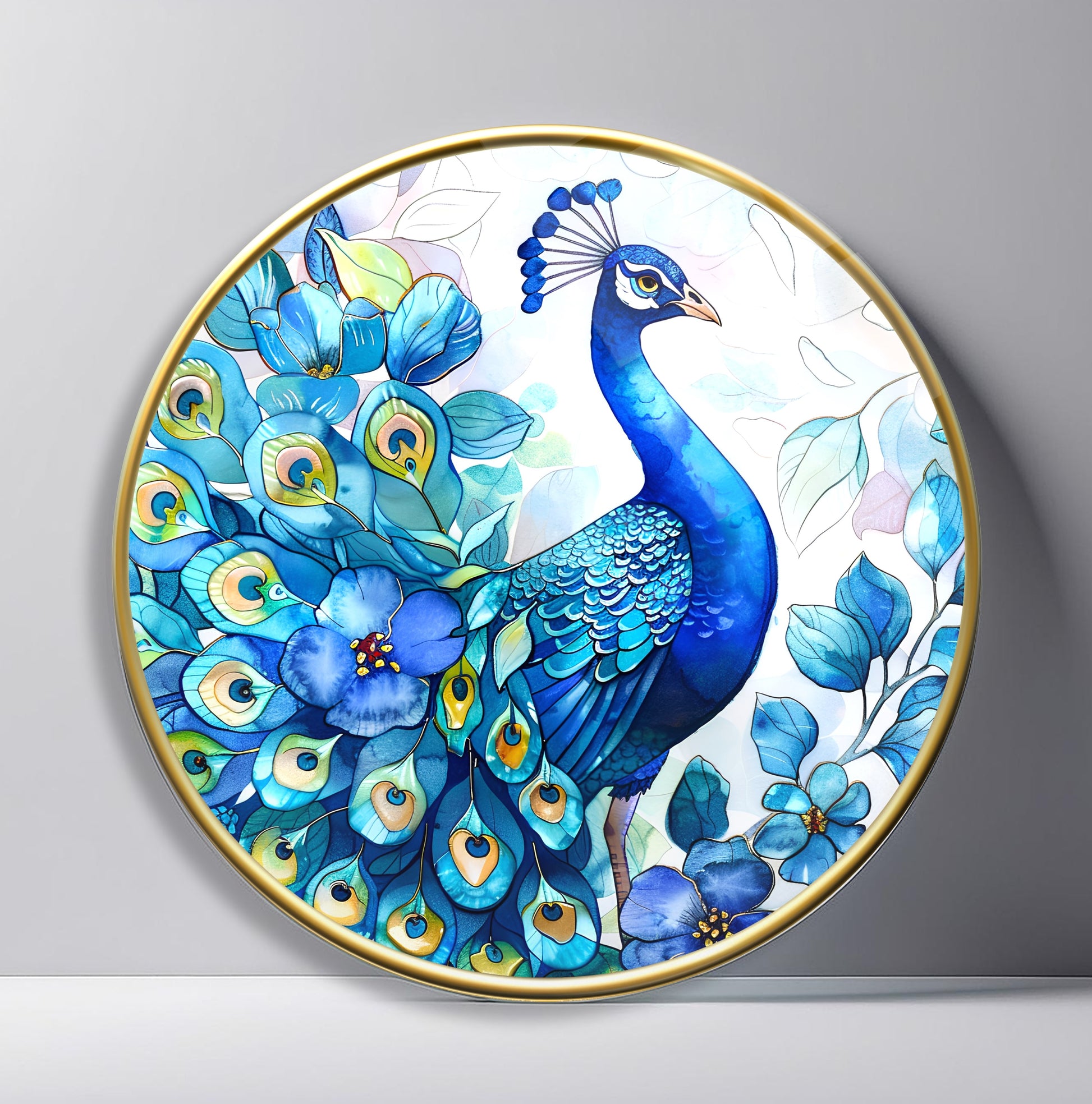 Mavi Çiçekli Tavus Kuşu Yuvarlak Cam Tablo