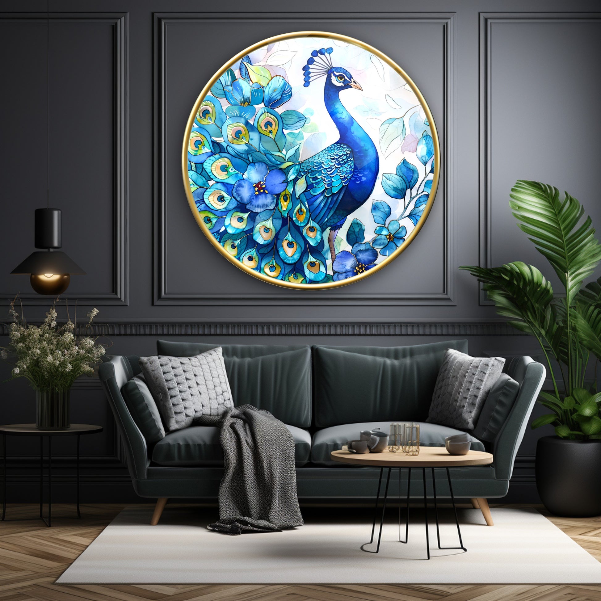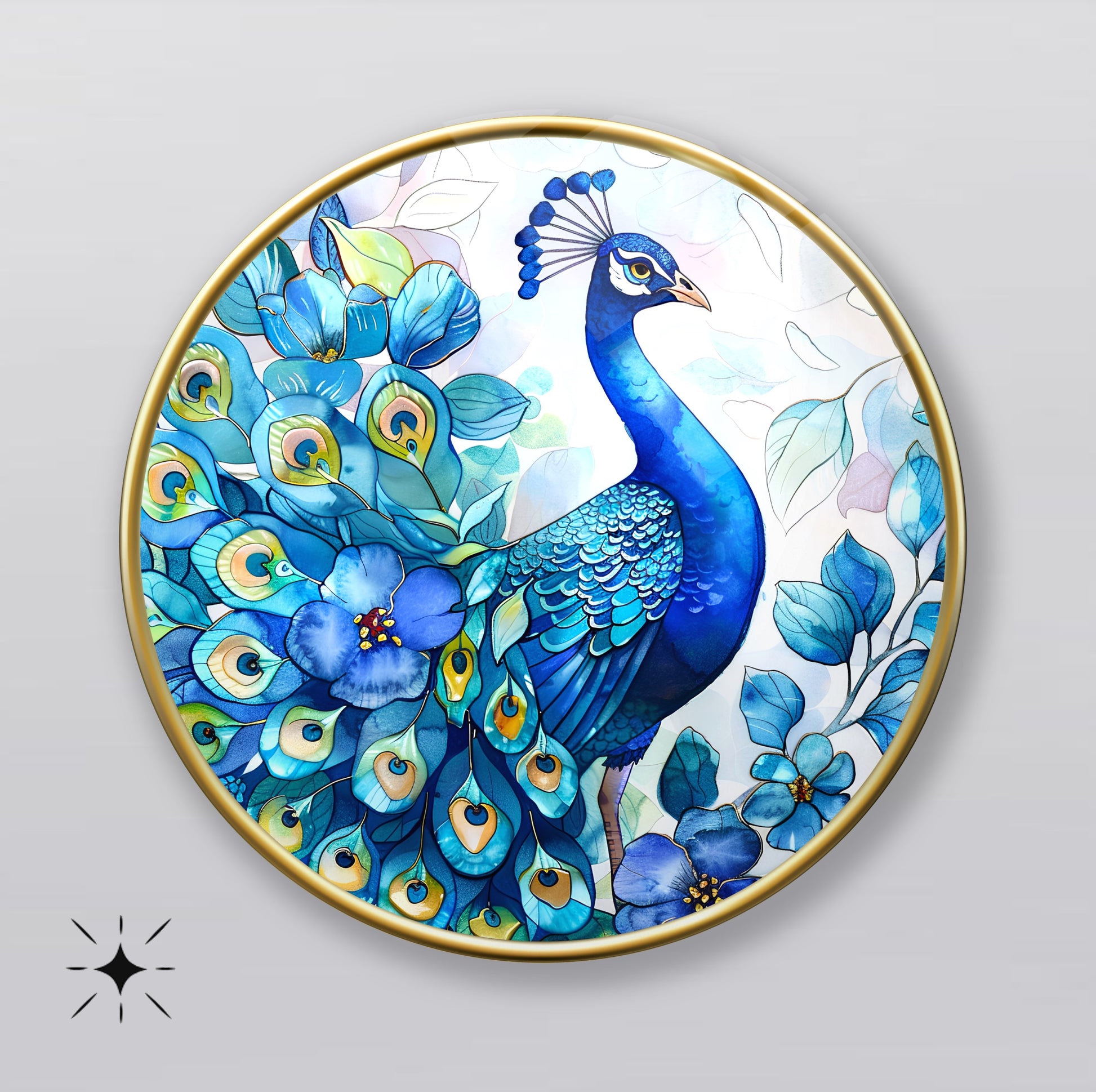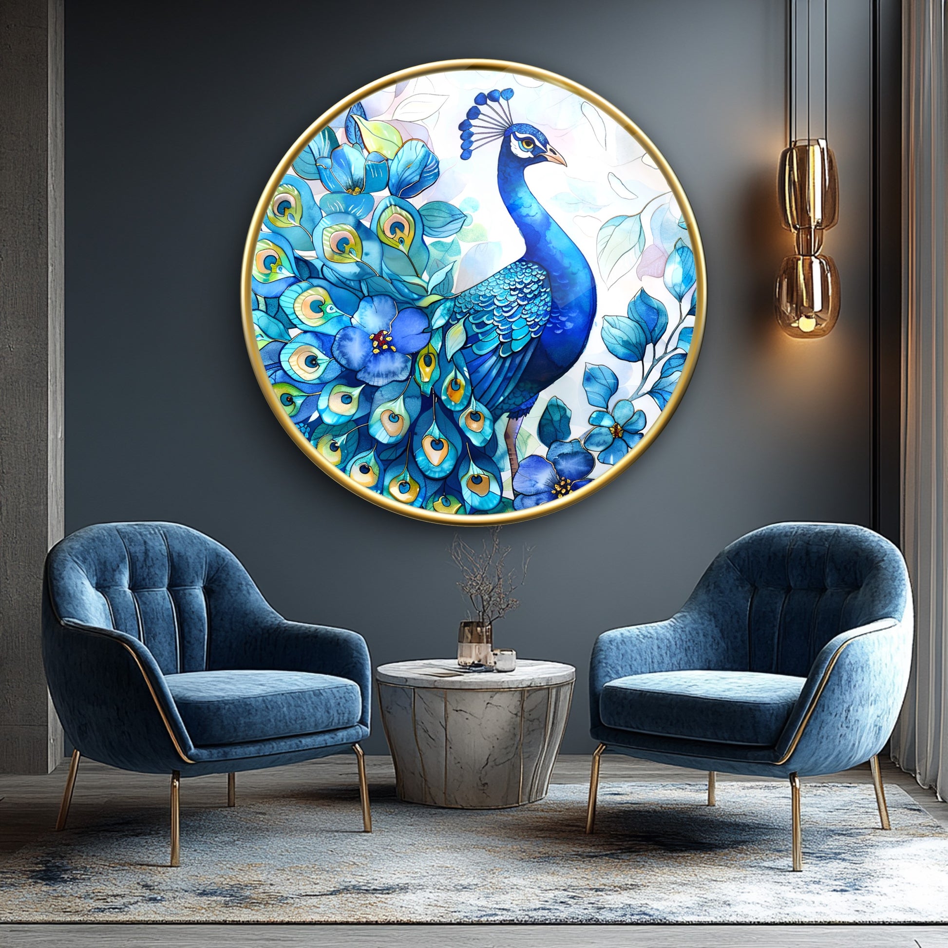 Mavi Çiçekli Tavus Kuşu Yuvarlak Cam Tablo