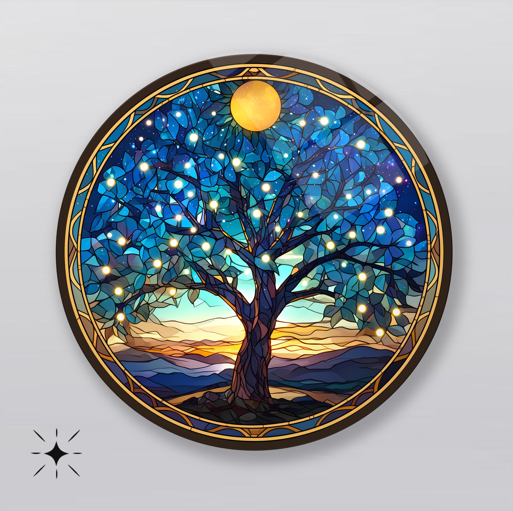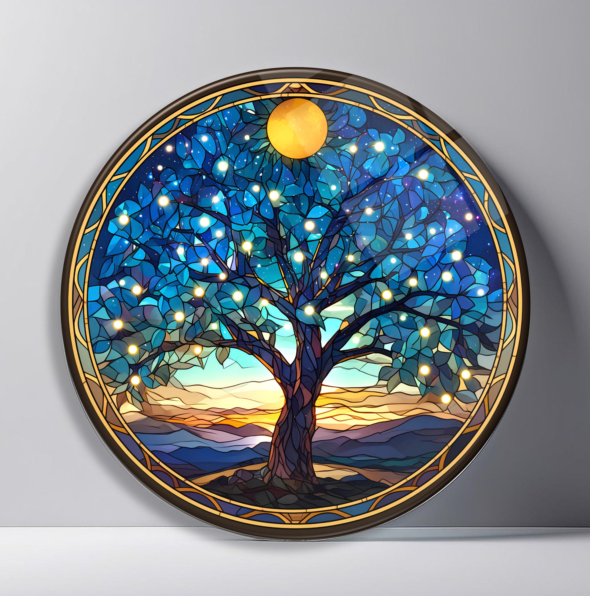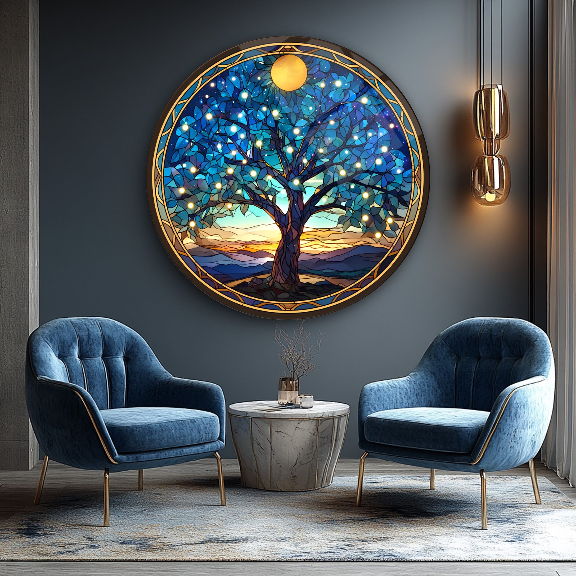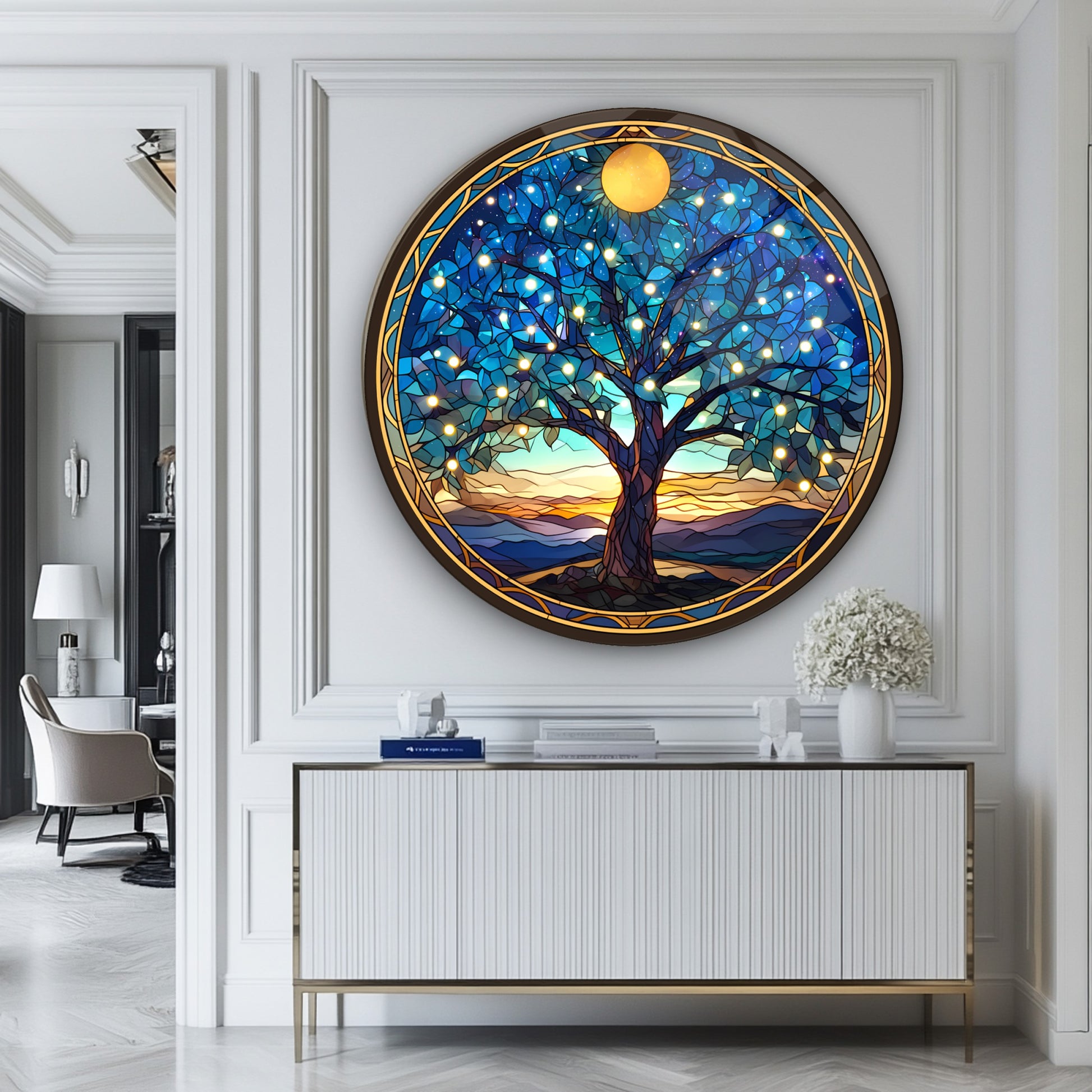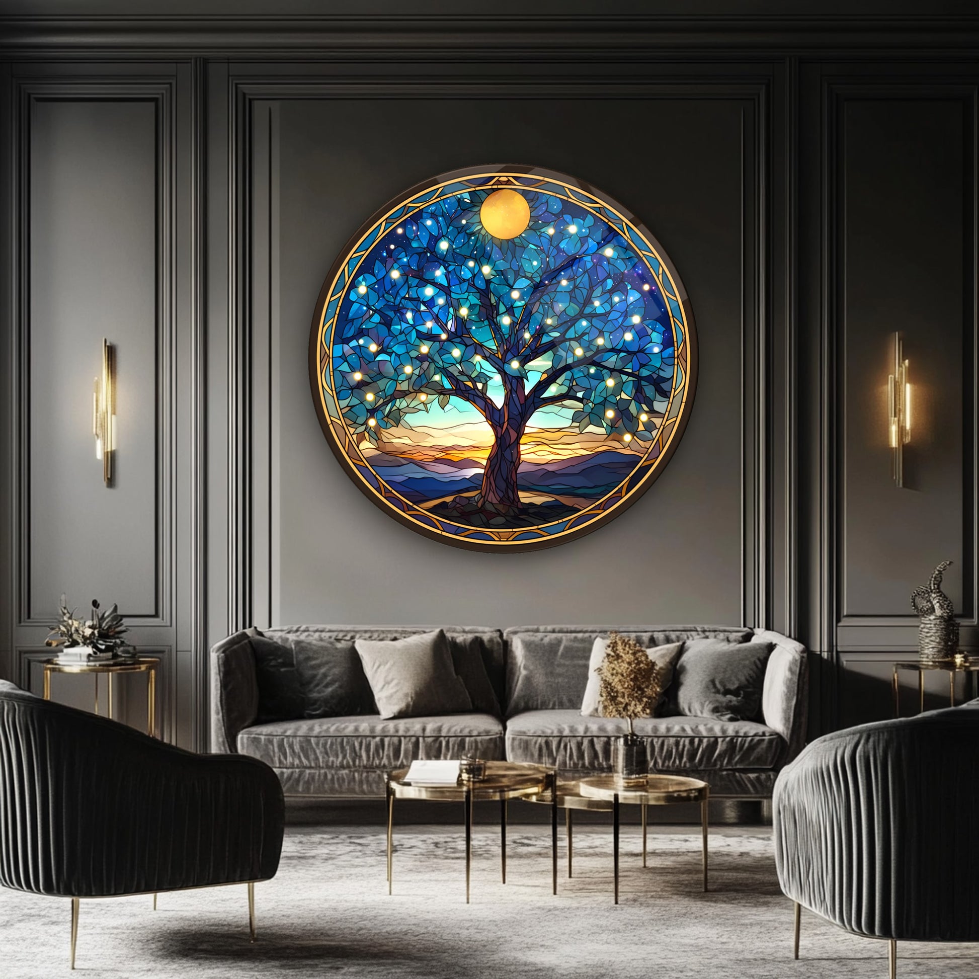 Mavi Hayat Ağacı Yuvarlak Cam Tablo