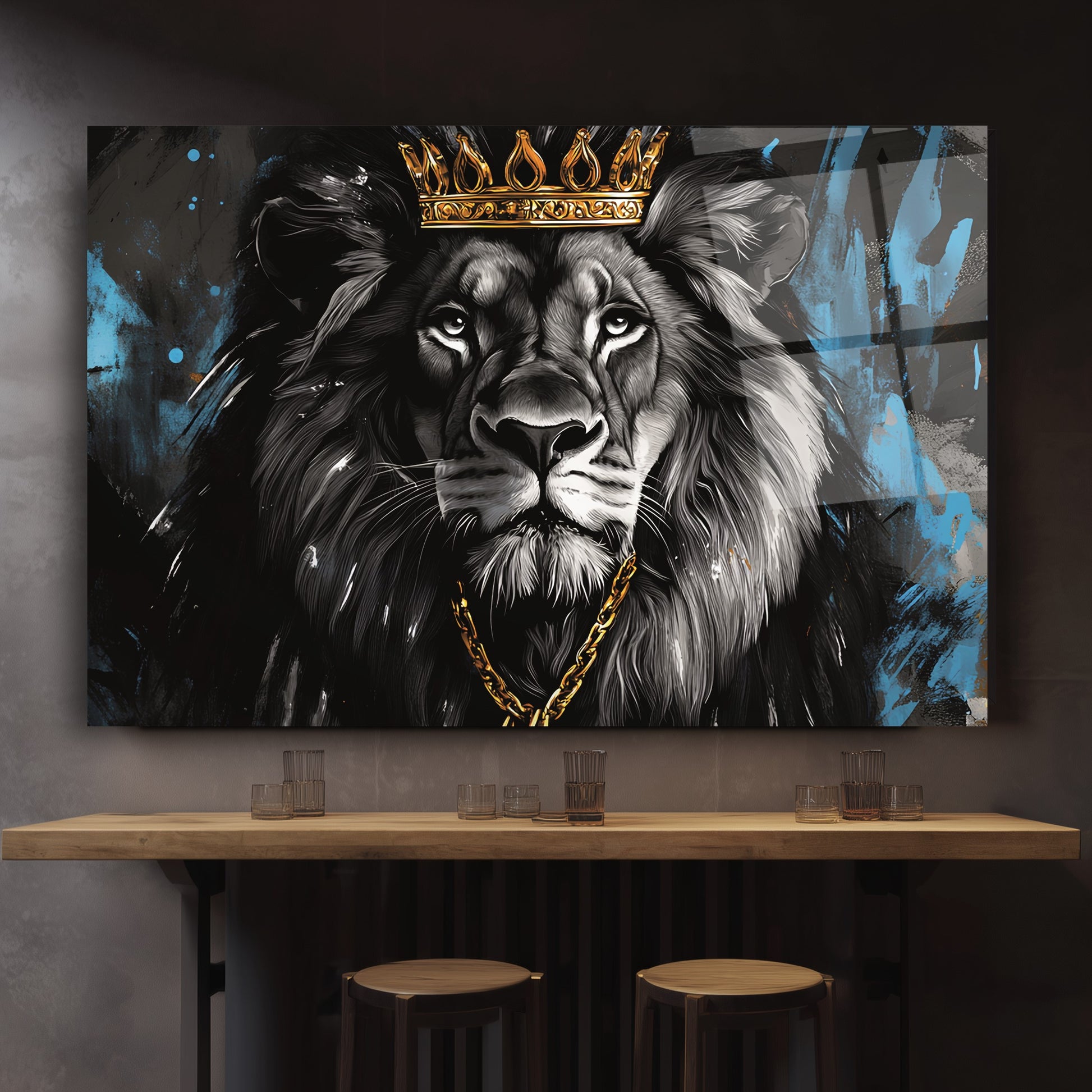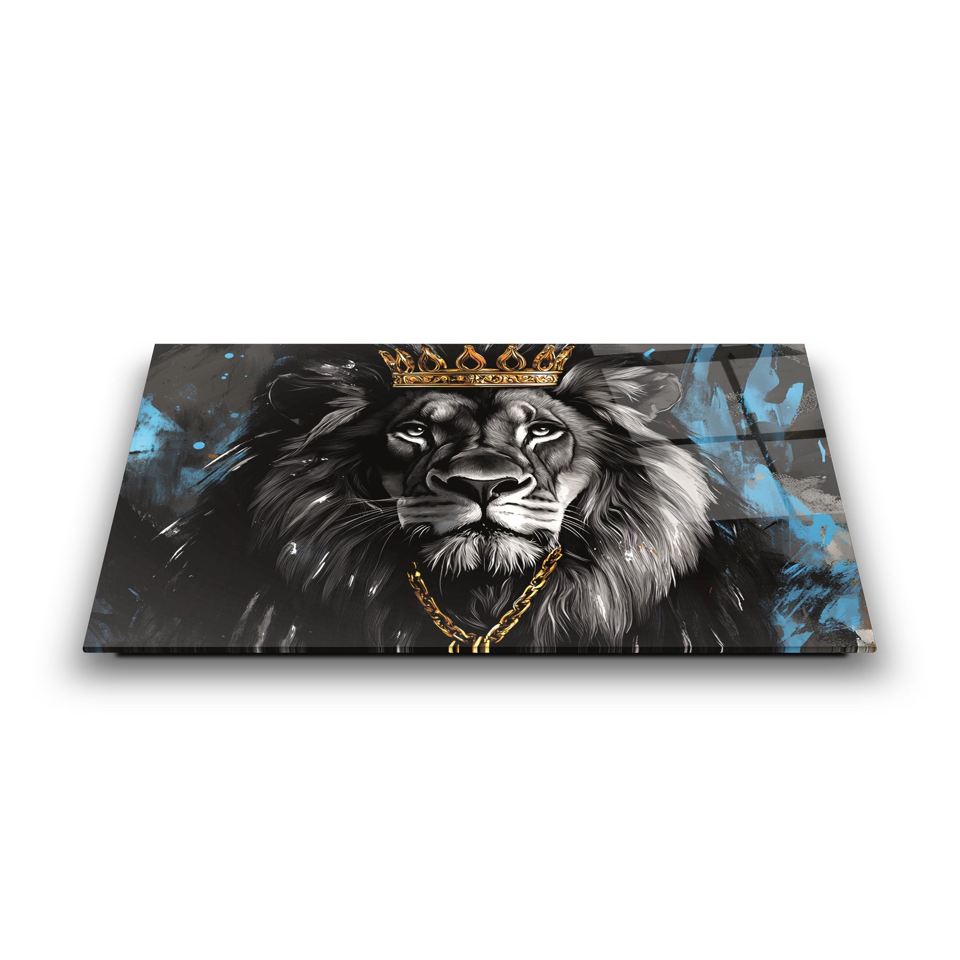 Gücün ve Lüksün Yeni Sembolü: Mavi Detay Gold Taçlı Kolyeli Aslan Cam Tablo