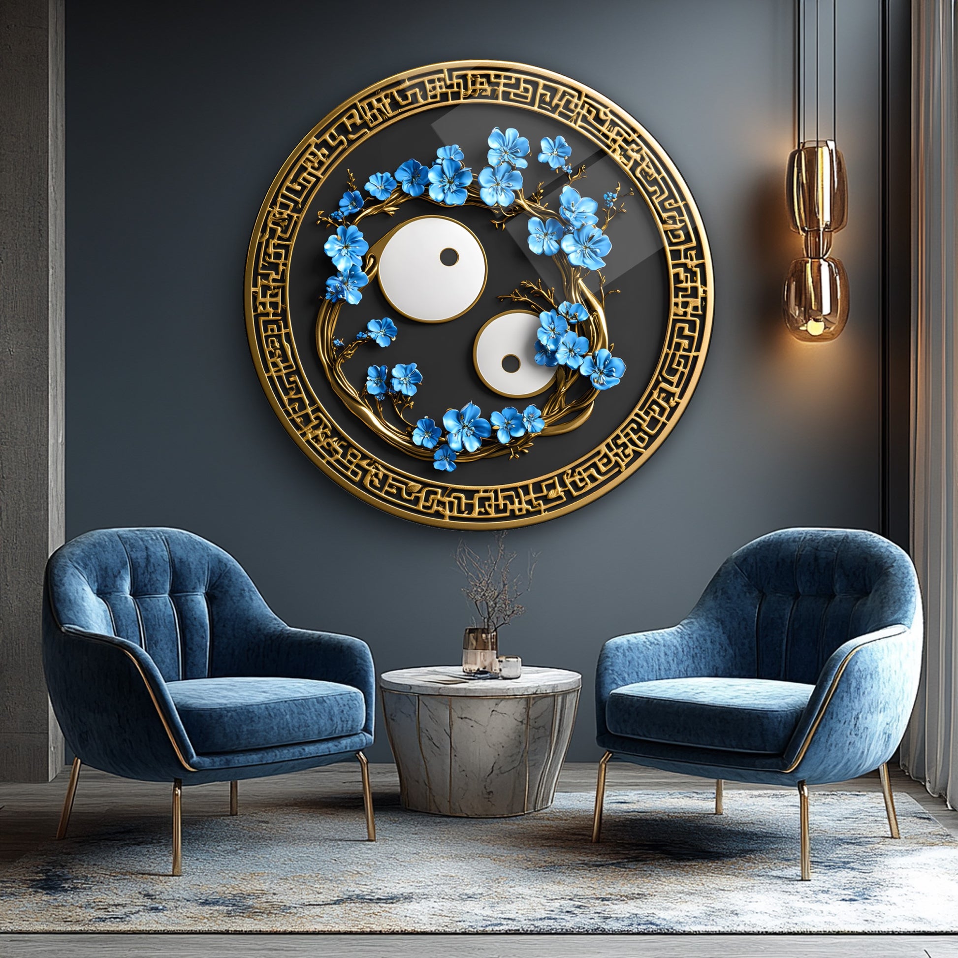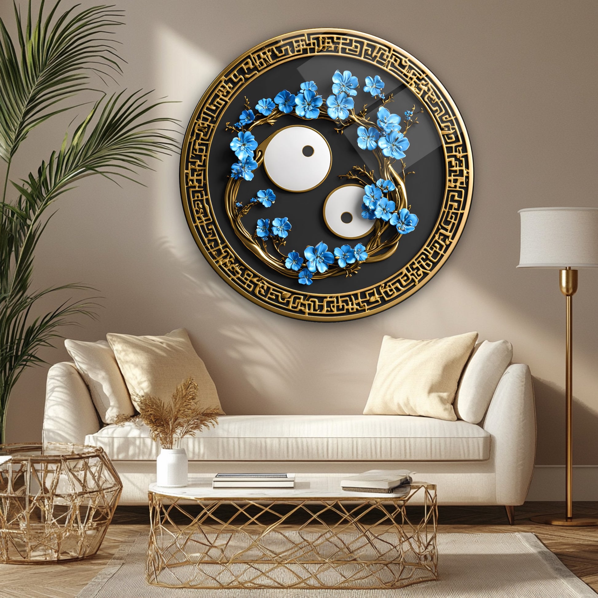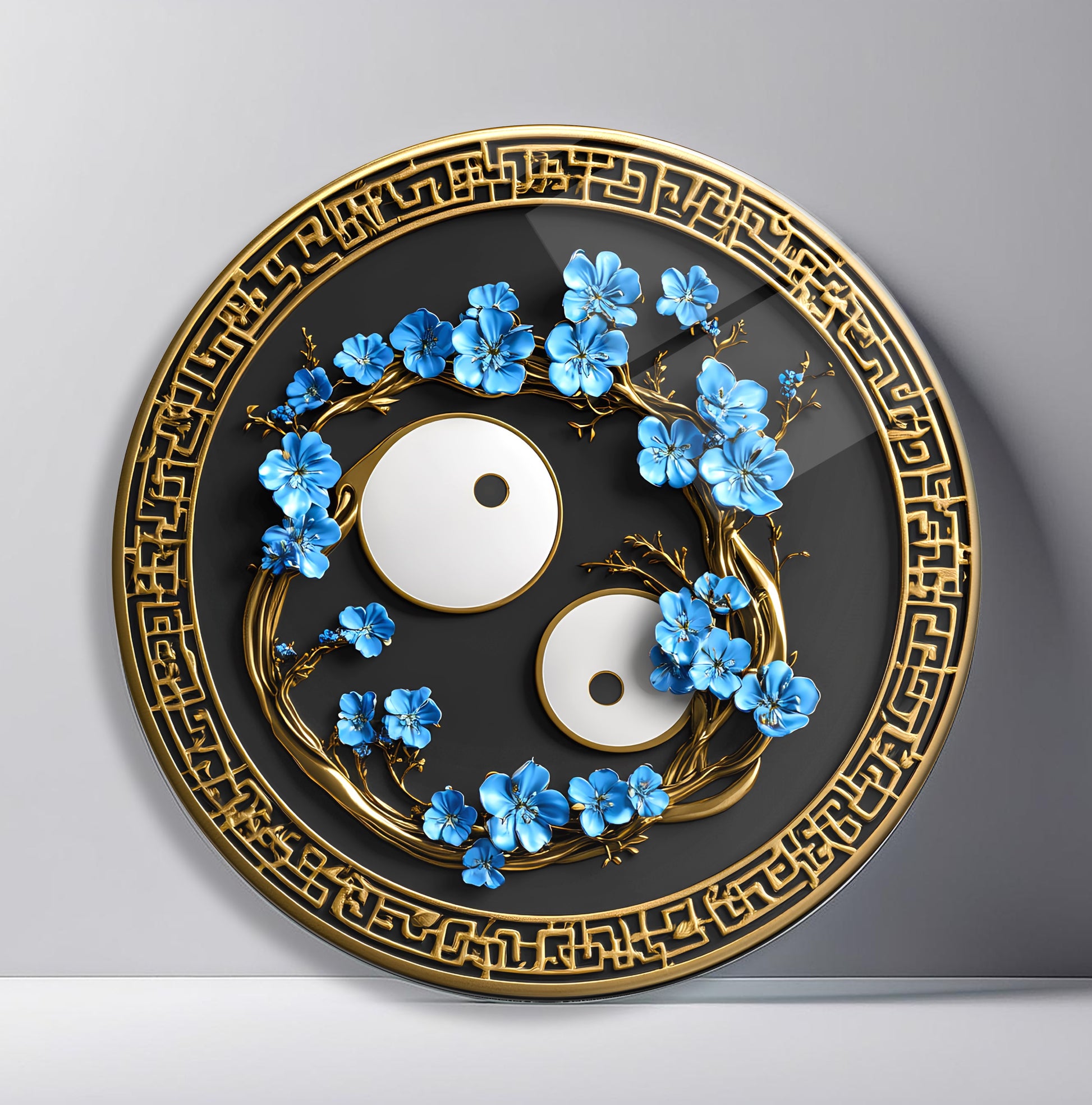 Mavi Gold Çiçekler Yuvarlak Cam Tablo