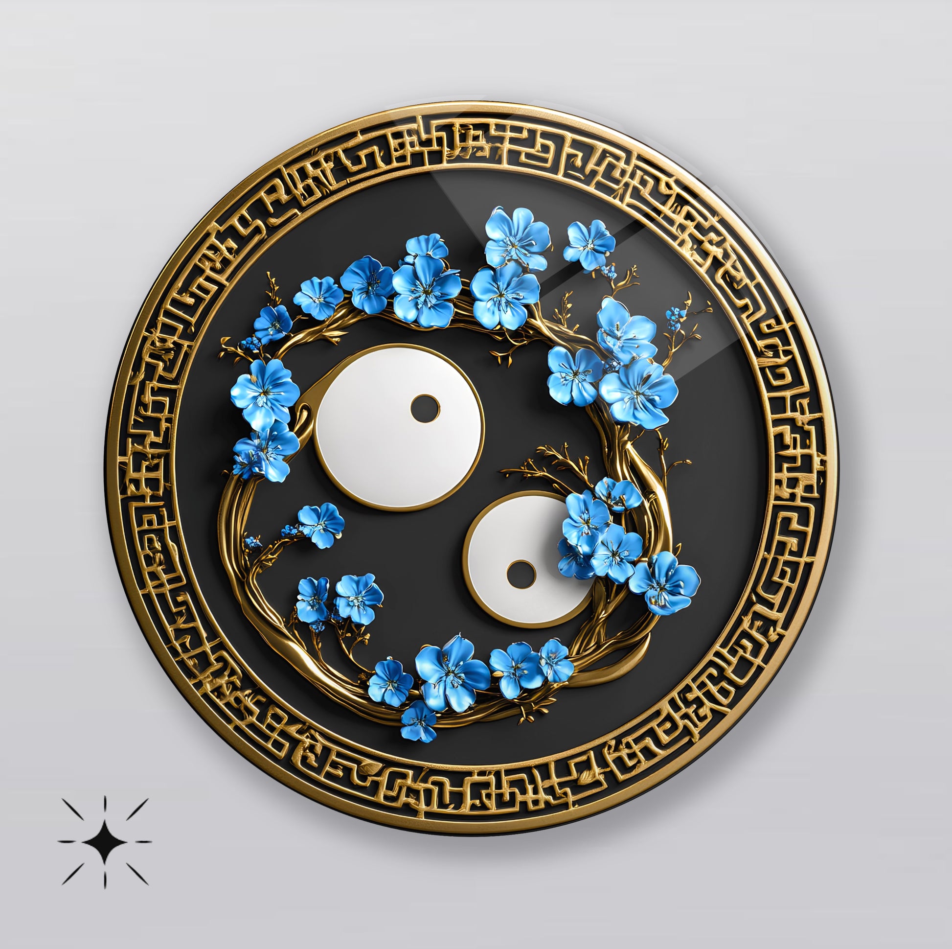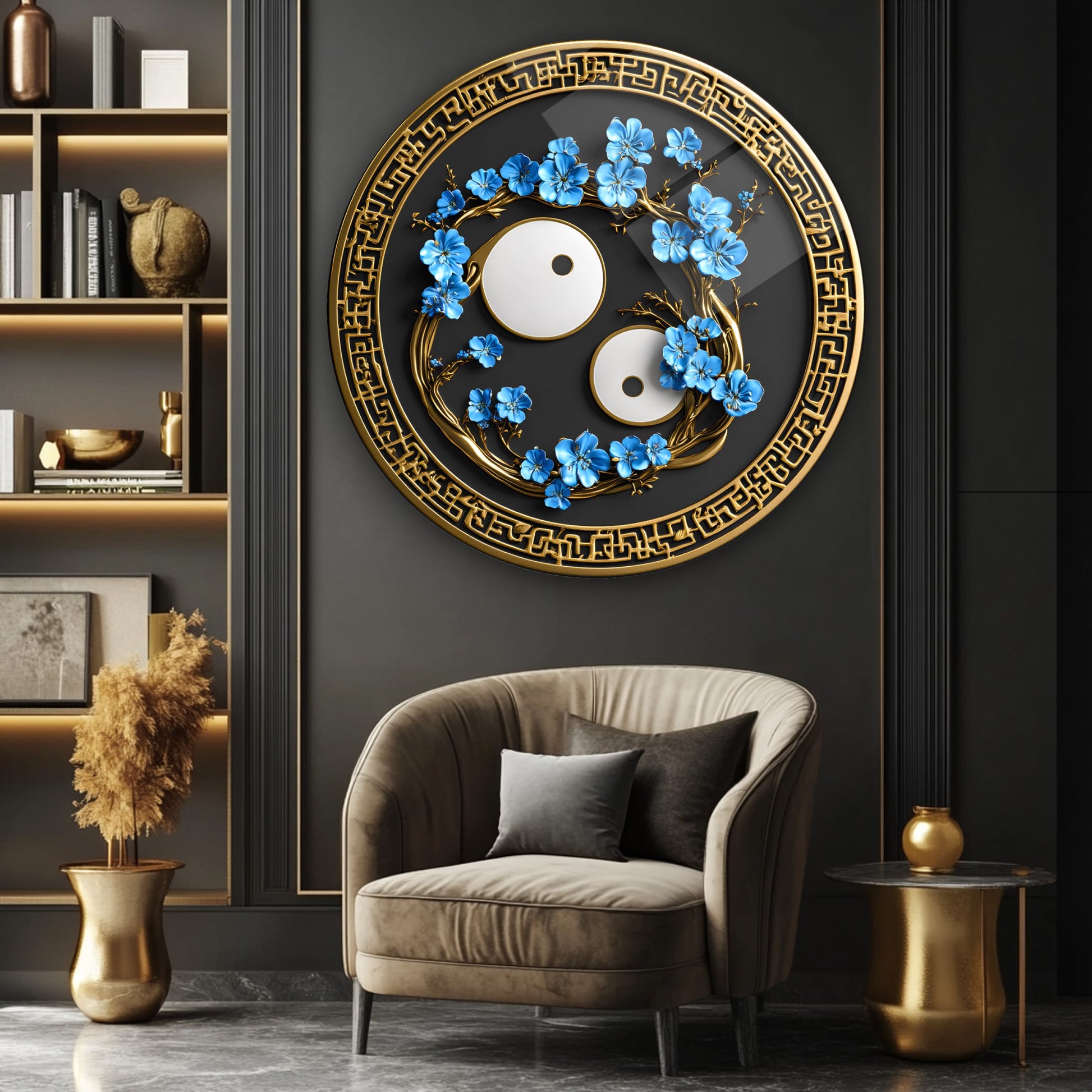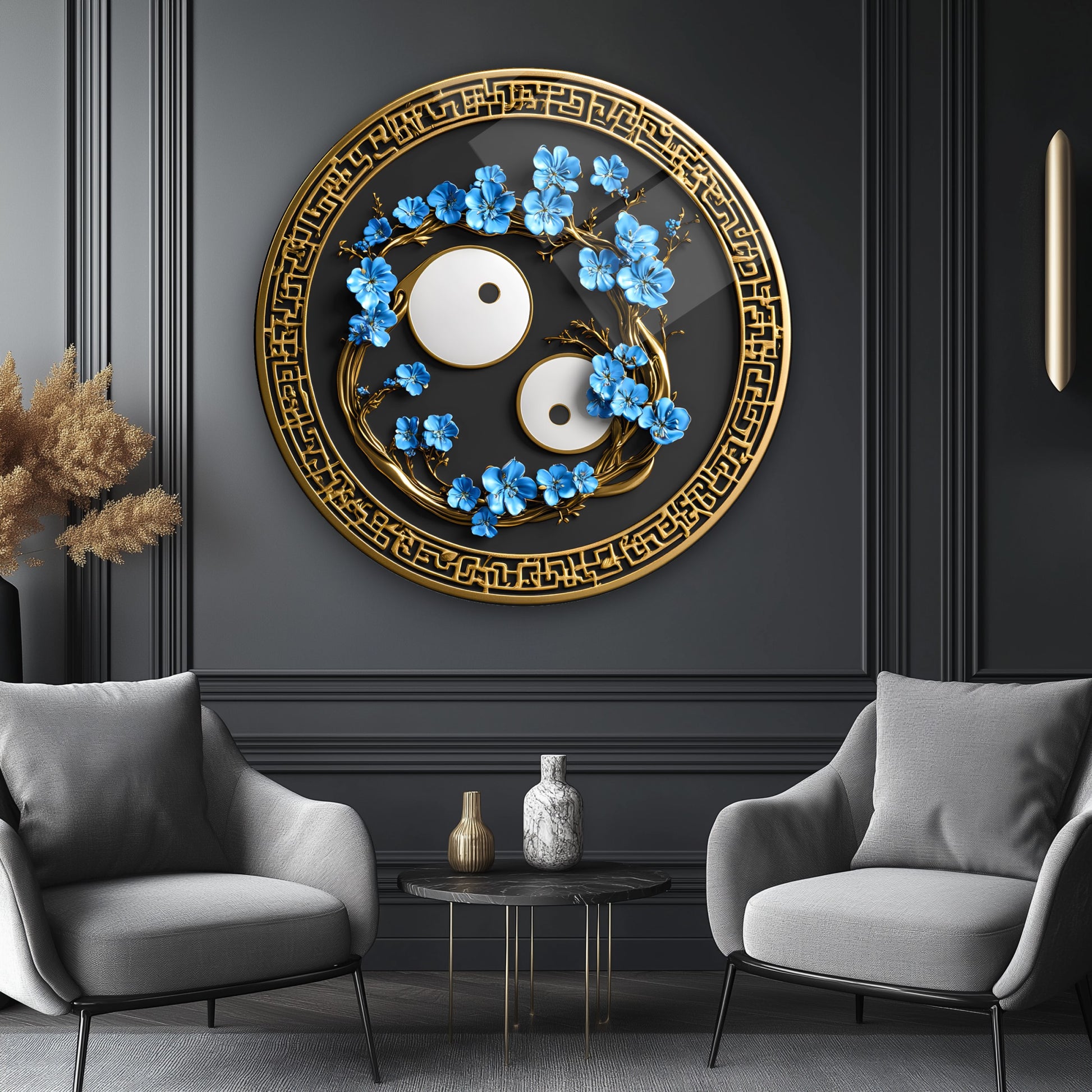 Mavi Gold Çiçekler Yuvarlak Cam Tablo
