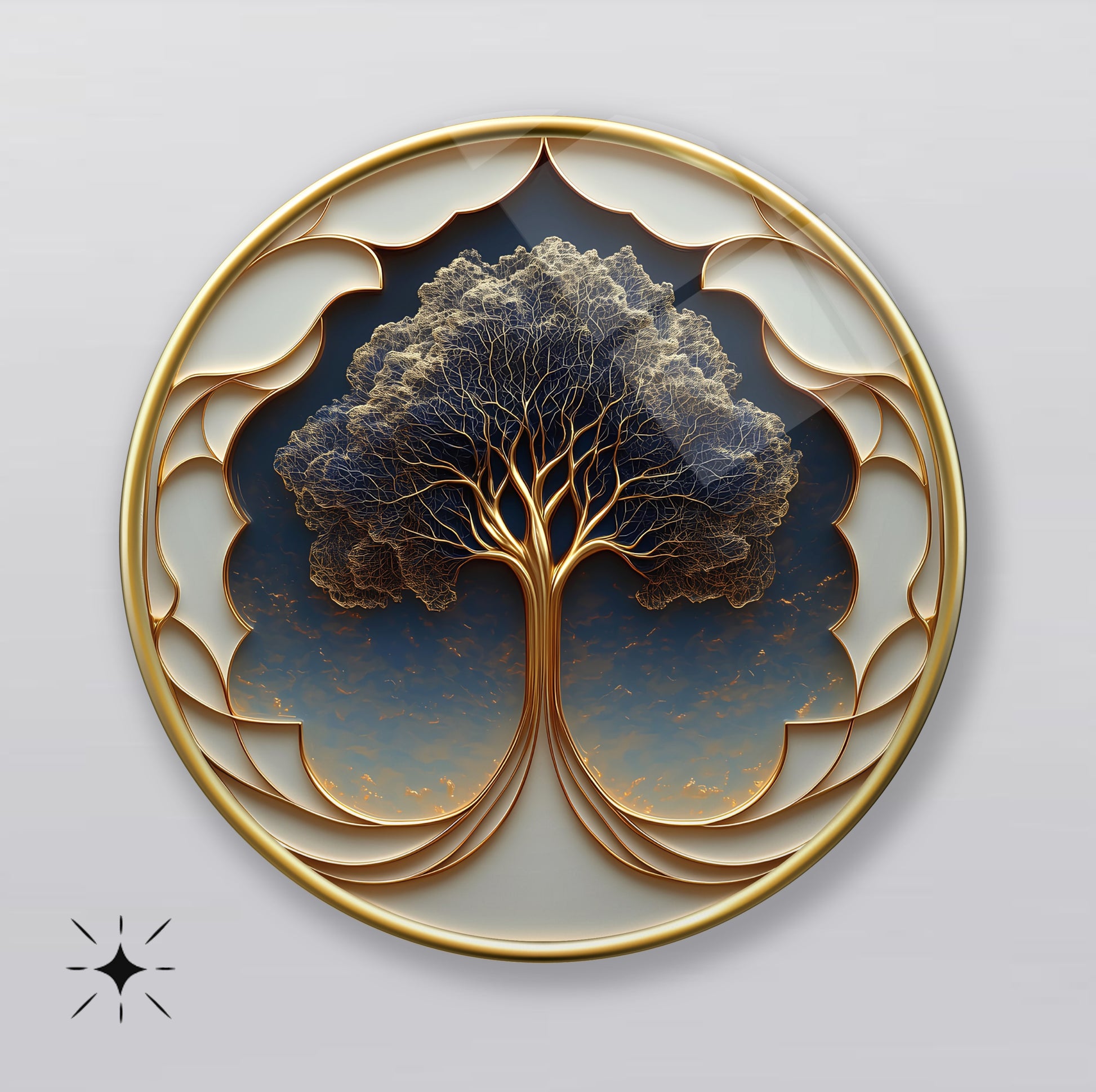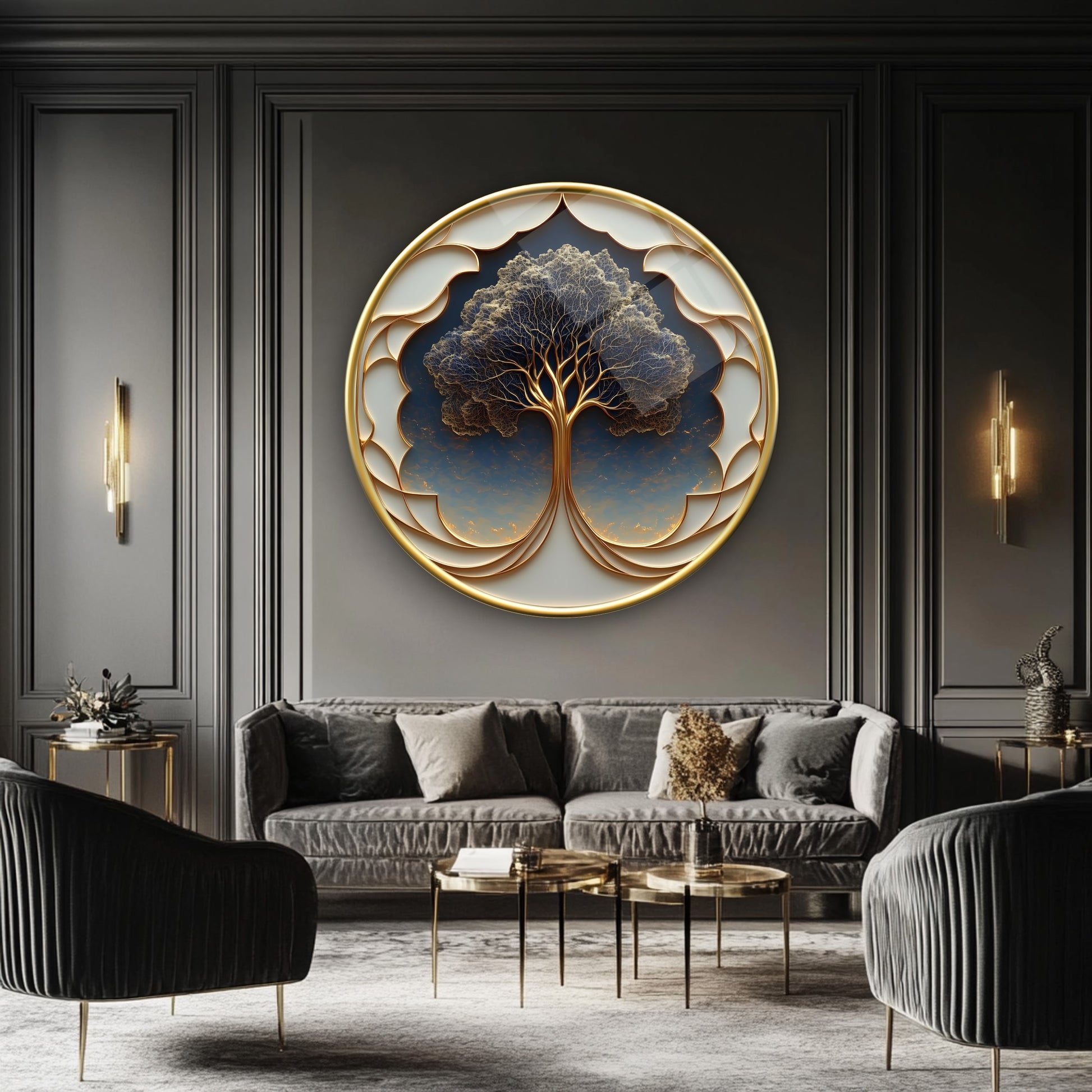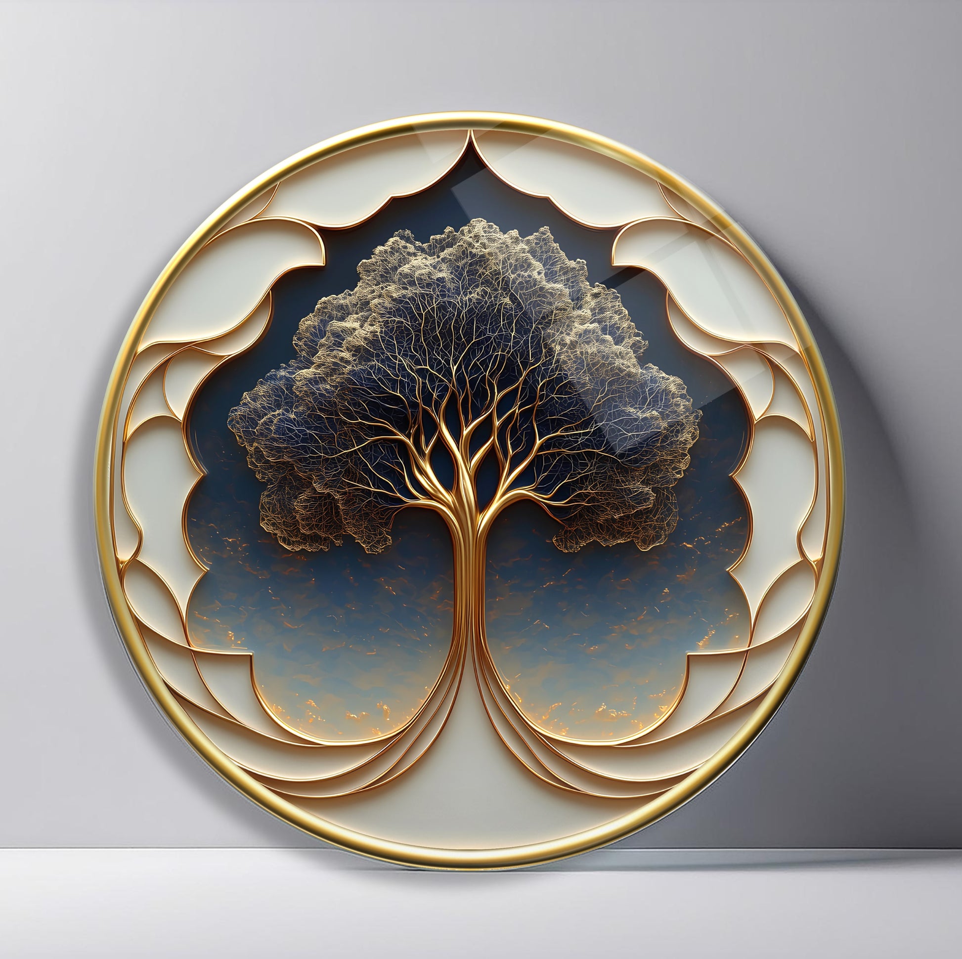 Mavi Gold Hayat Ağacı Yuvarlak Cam Tablo