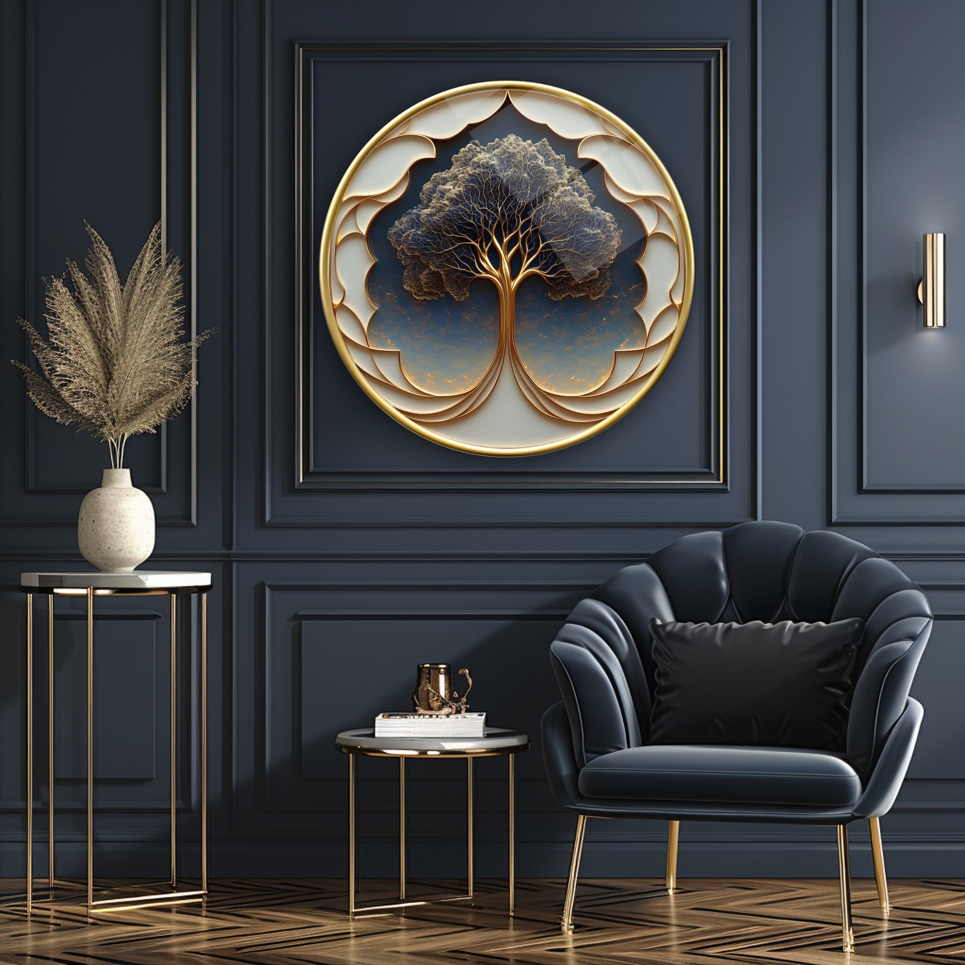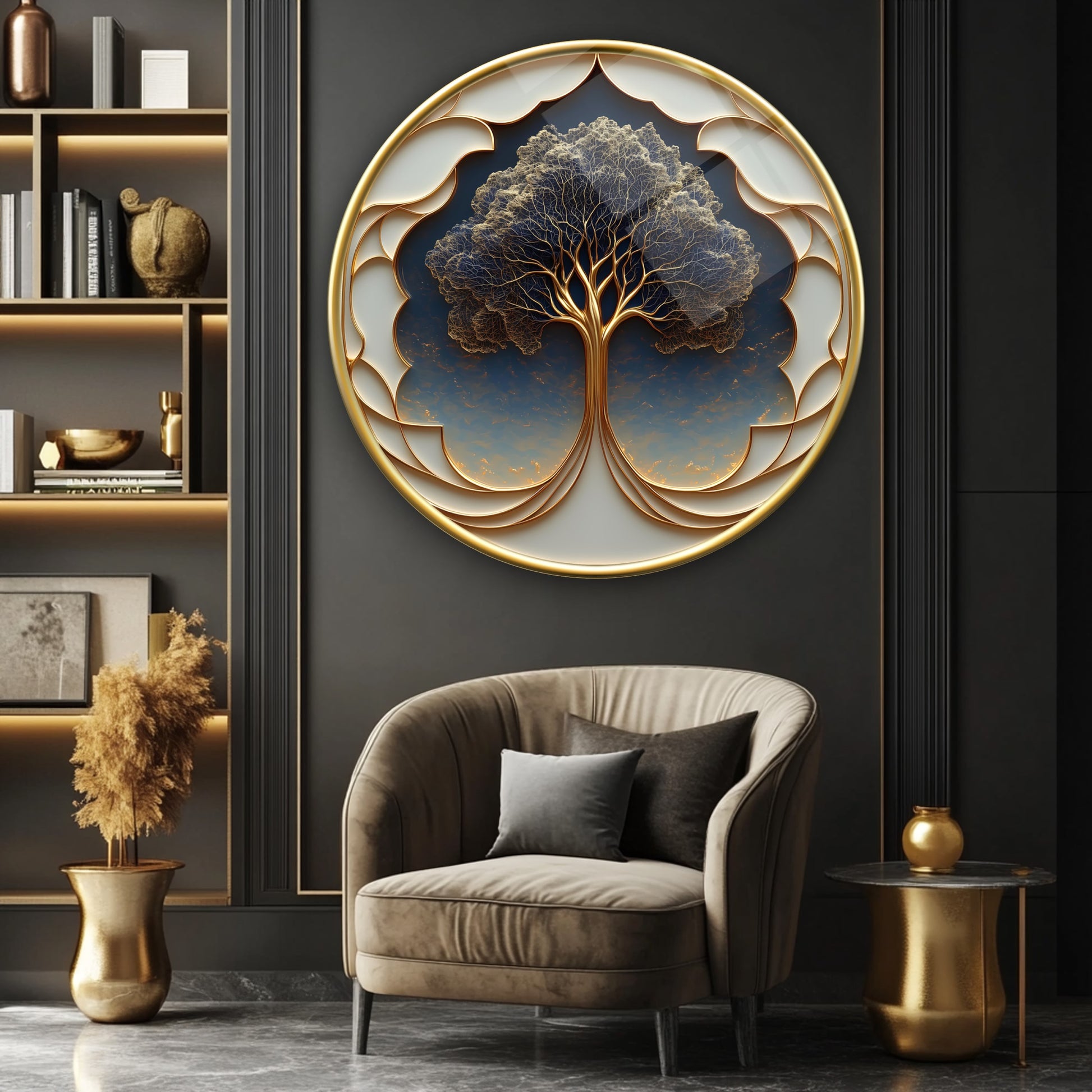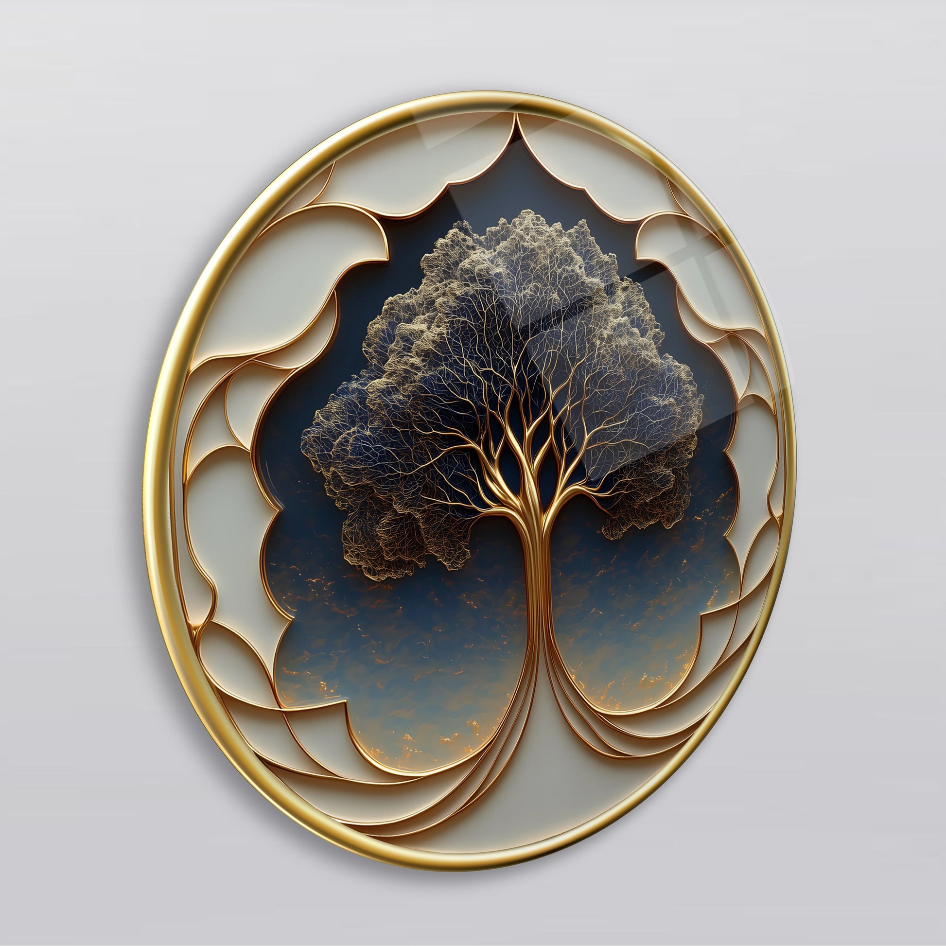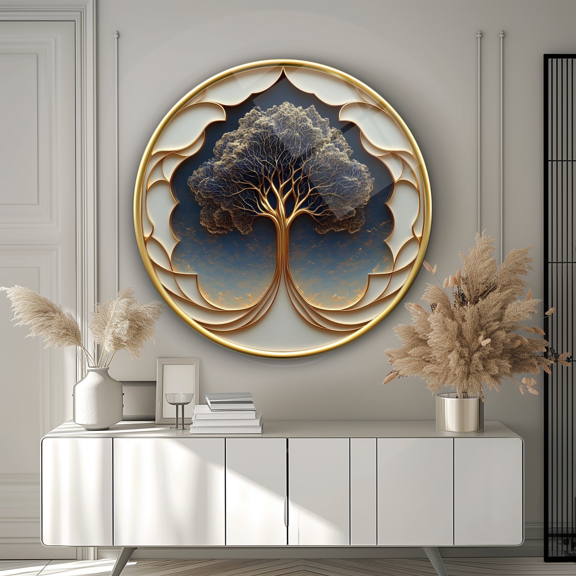 Mavi Gold Hayat Ağacı Yuvarlak Cam Tablo