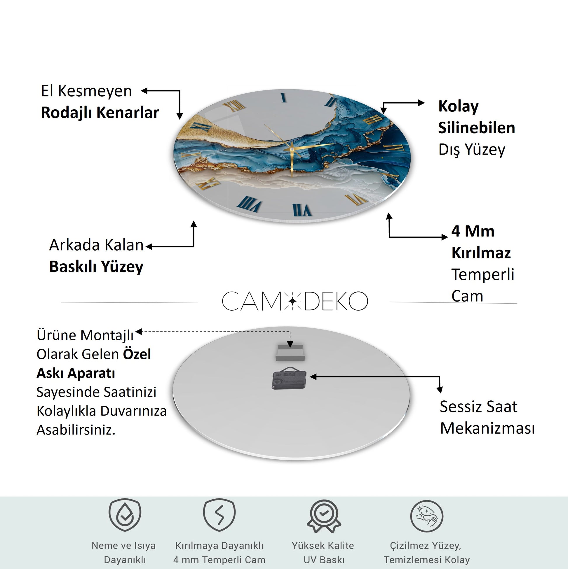 Saatlerimizde 4 mm kalınlığında ultra clear temperli cam kullanılır. Rodajlanmış (el kesmeyen) kenarları, hem güvenli hem de estetik bir görünüm sunar. Zamansız tasarımıyla ev ve ofis dekorasyonuna şıklık katar.
