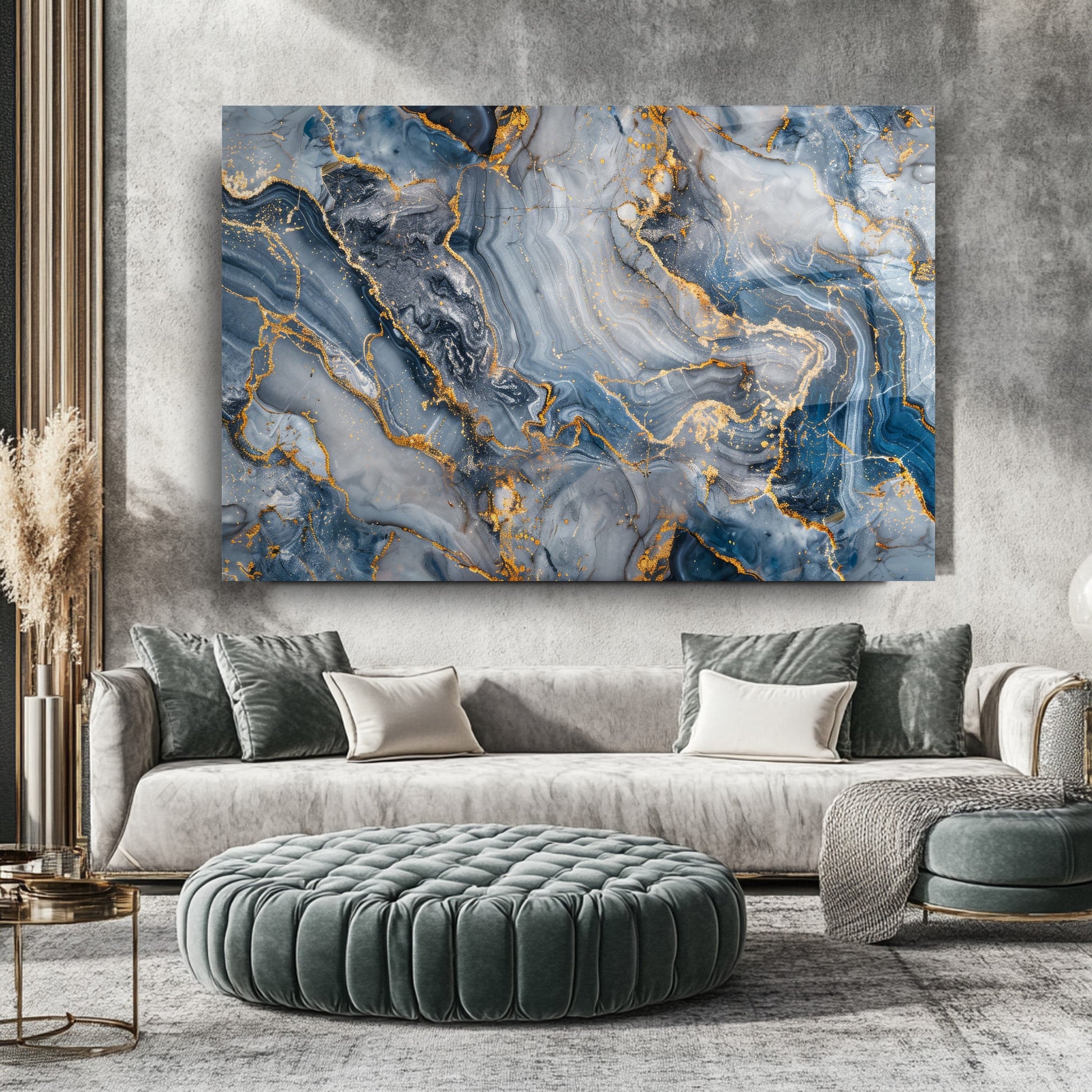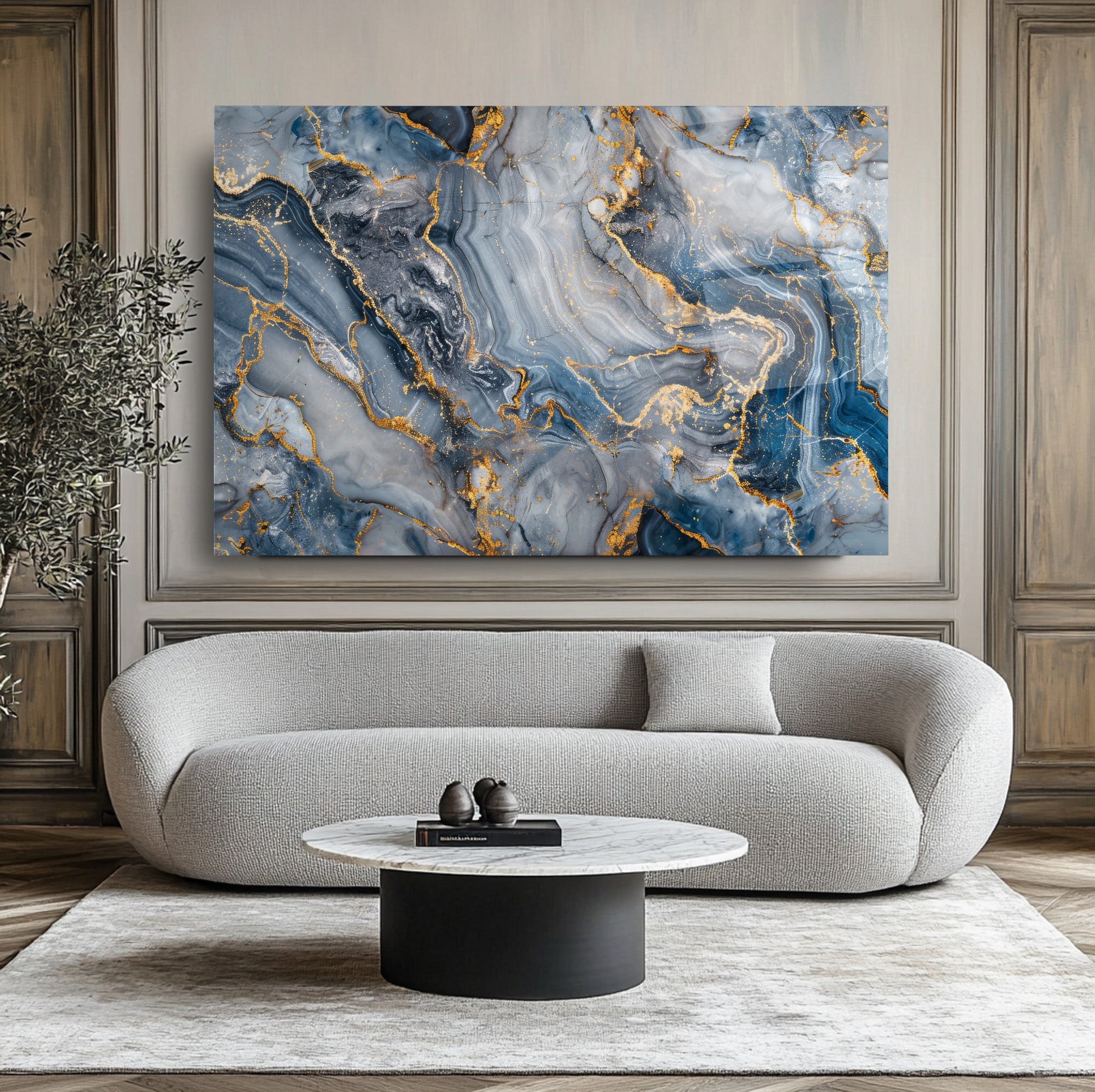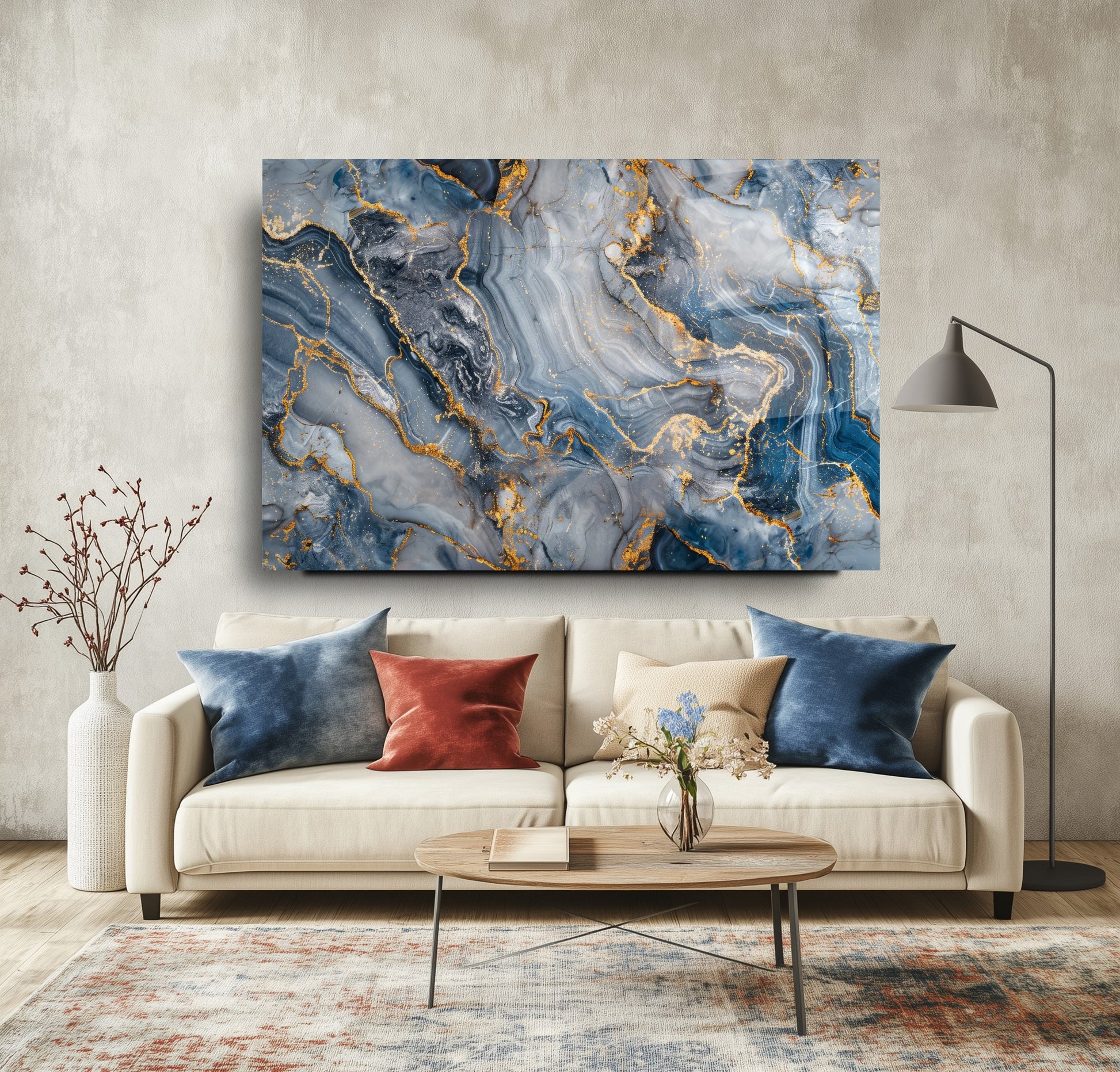 Camdeko’nun Mavi‑Gold Mermer Soyut Cam Tablo, mermer dokusunun derin mavileriyle altın detayların zarif uyumunu evinize taşıyor. Kare formdaki minimal tasarım, salon, yatak odası ya da ofiste etkileyici bir odak noktası oluşturur. UV baskı teknolojisi sayesinde her ton canlı, her detay net; kırılmaz temperli cam yapısı ise dayanıklılık sunar. Modern iç mekanlara şıklık katmak isteyenler için kolay montaj ve uzun ömürlü kullanım özellikleriyle ideal bir tercihtir.