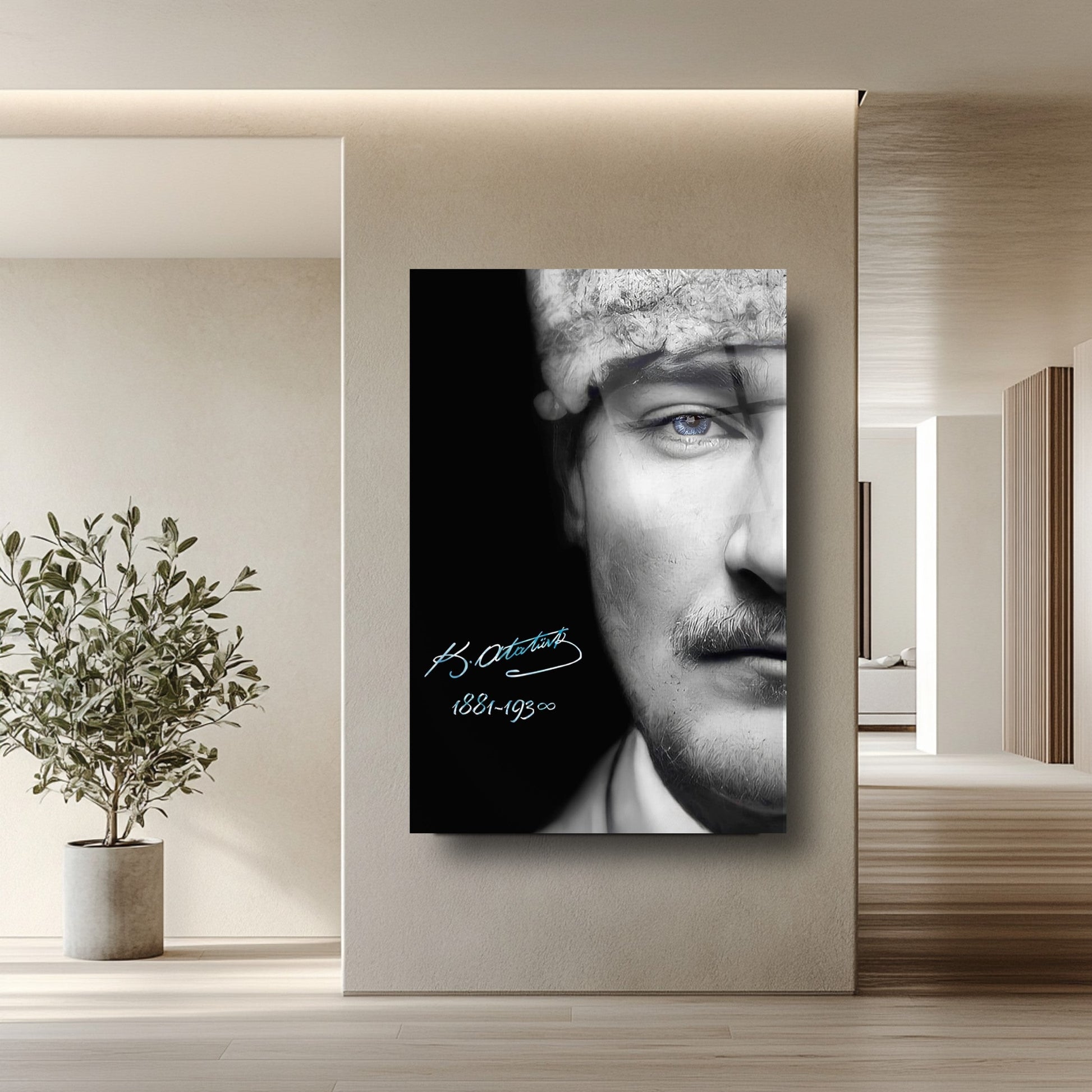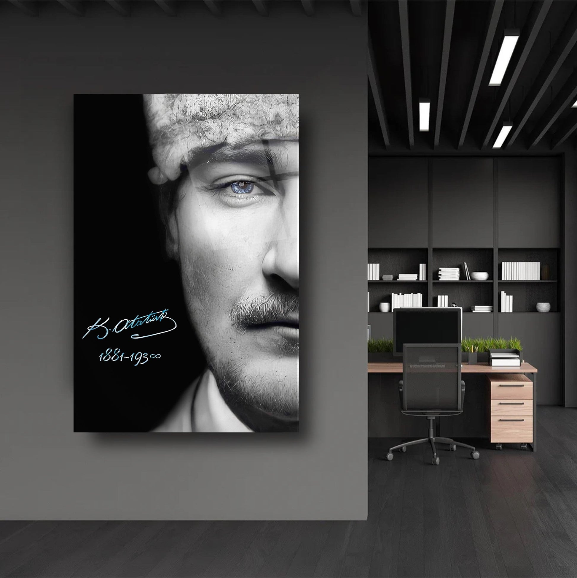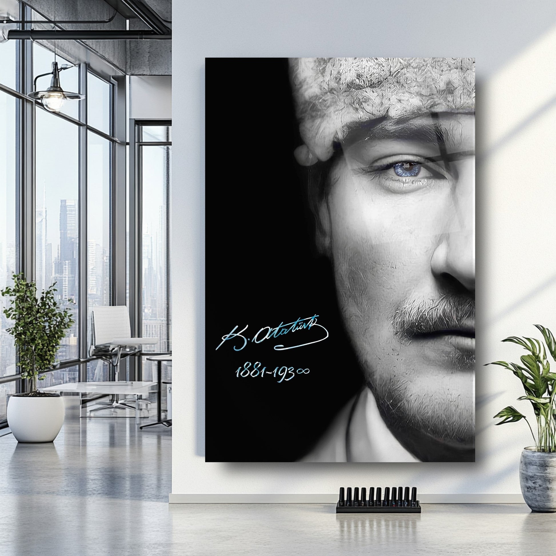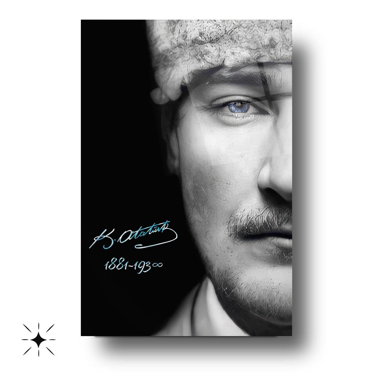 CamDeko'dan milli değerlerimizi modern estetikle buluşturan özel bir eser: Mavi Gözlü Atatürk İmzalı Kırılmaz Modern Temperli Cam Tablo! Ulu Önder Mustafa Kemal Atatürk'ün tarihe yön veren mavi gözlü karizmatik portresi ve şahsi imzasıyla makam odanıza, ofisinize, okulunuza veya evinize ilham ve saygınlık katın.