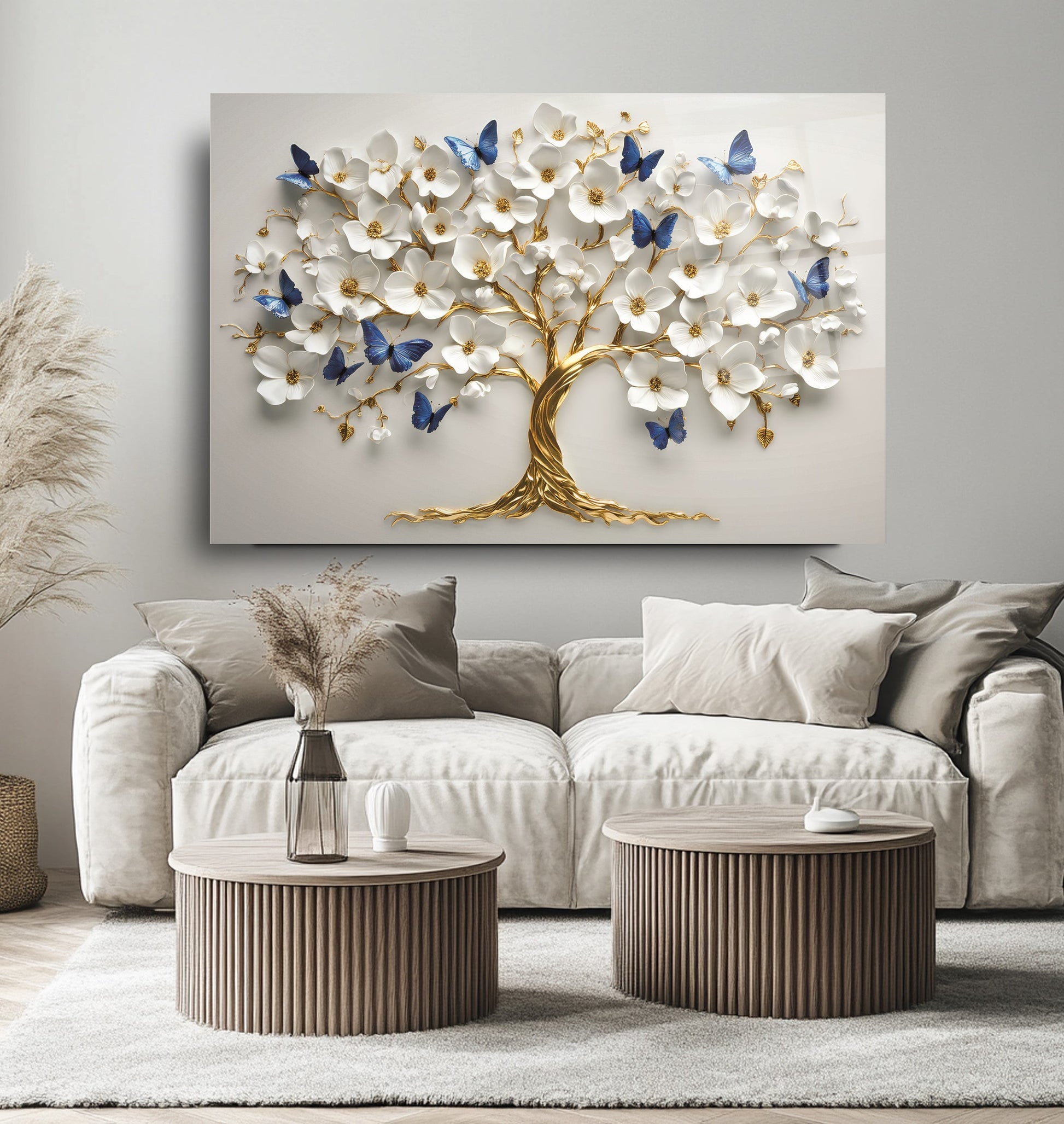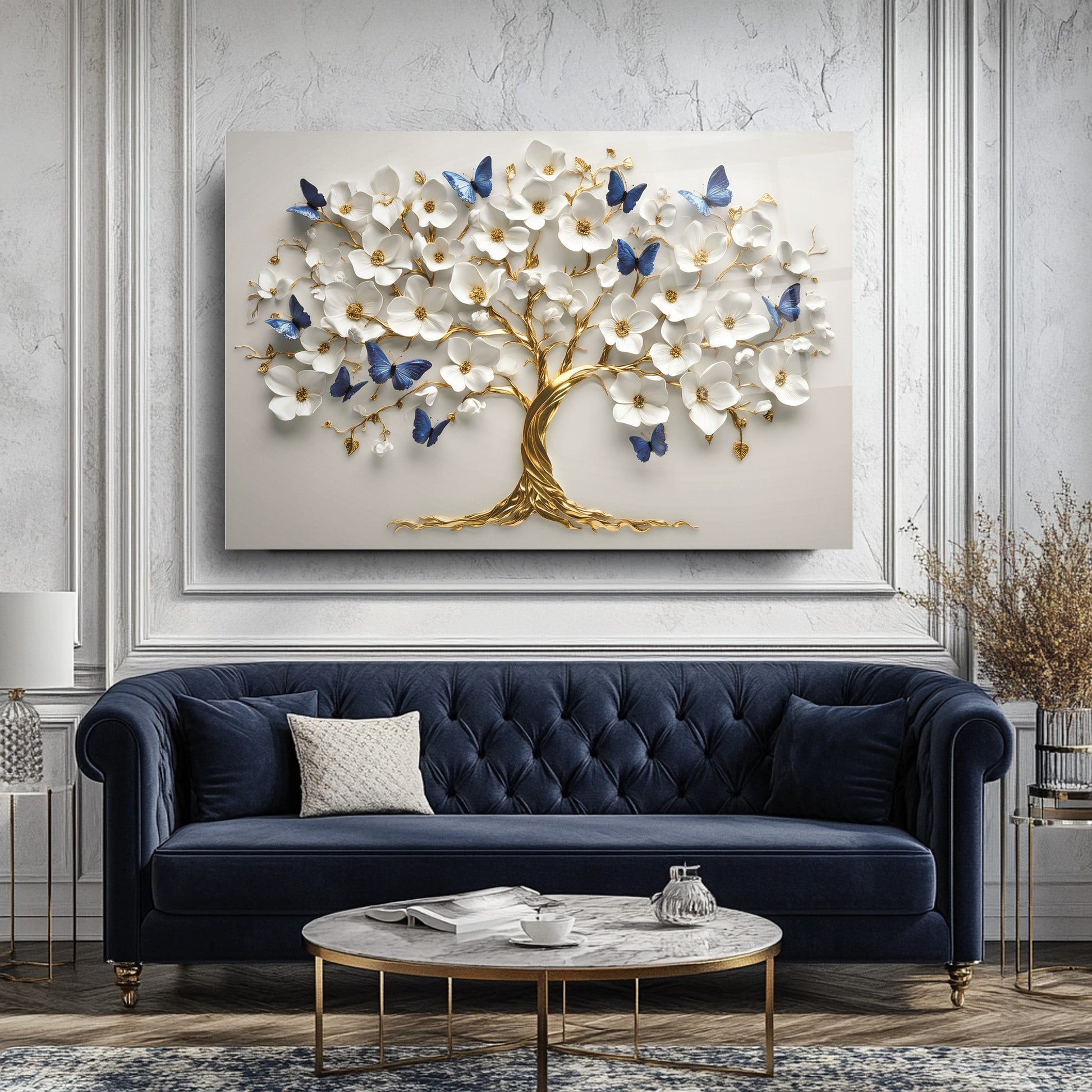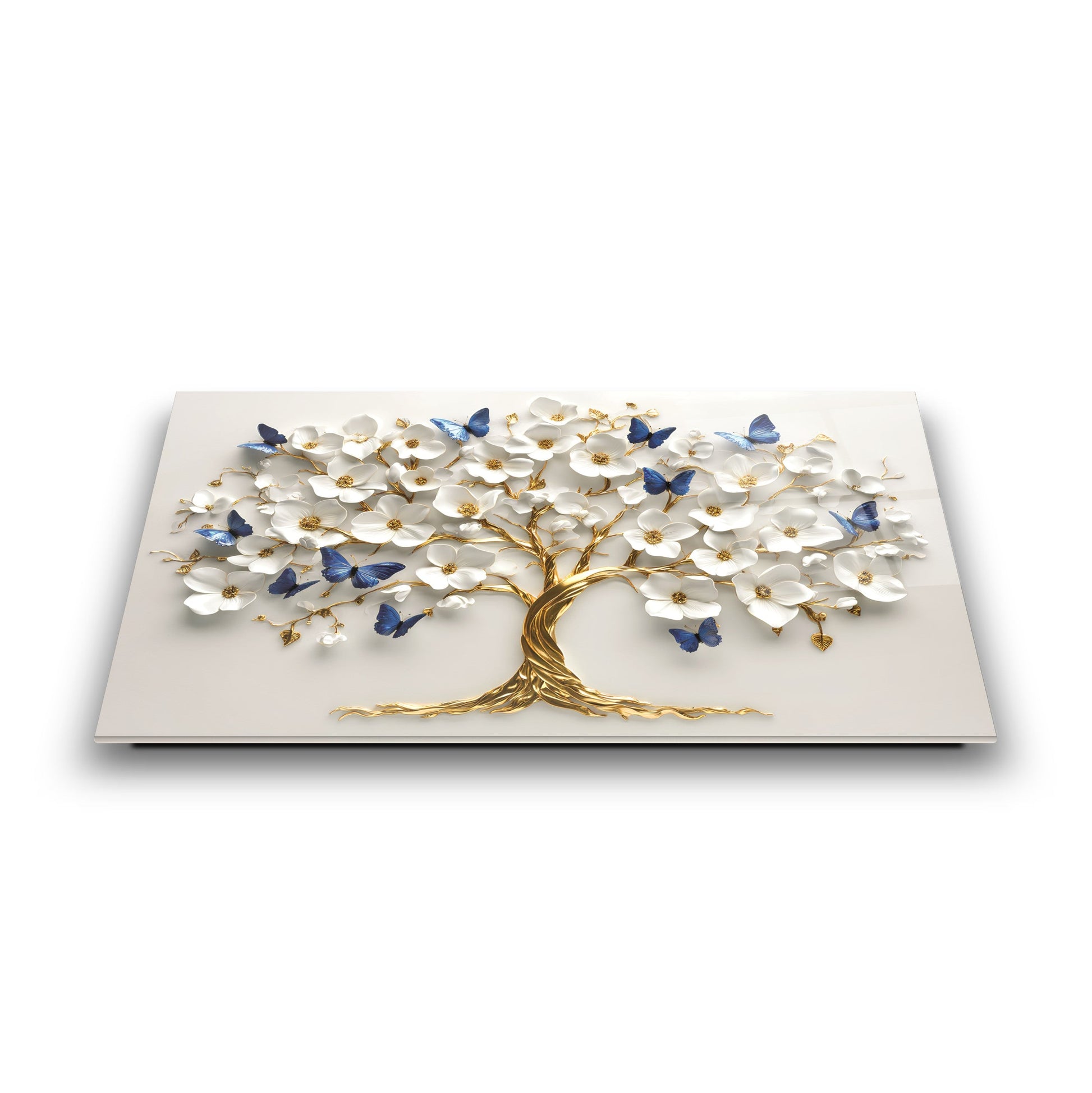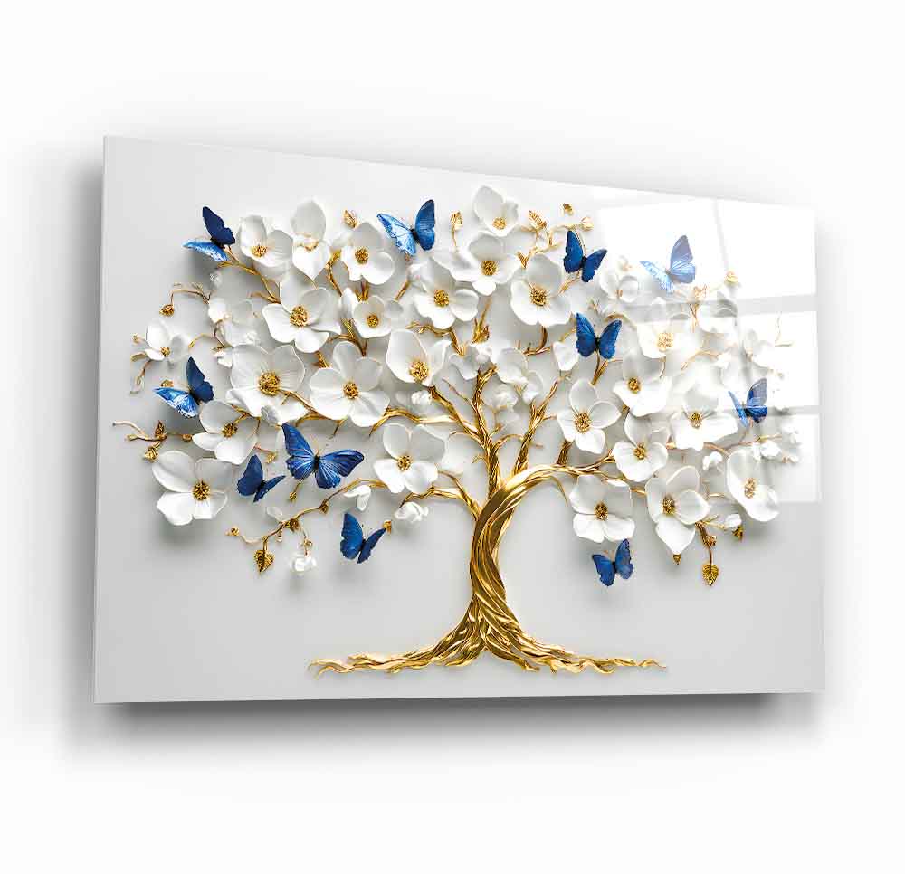 Mekanlarınıza Canlılık ve Dönüşüm Katın: Mavi Kelebekli Çiçekli Gold Hayat Ağacı Cam Tablo
