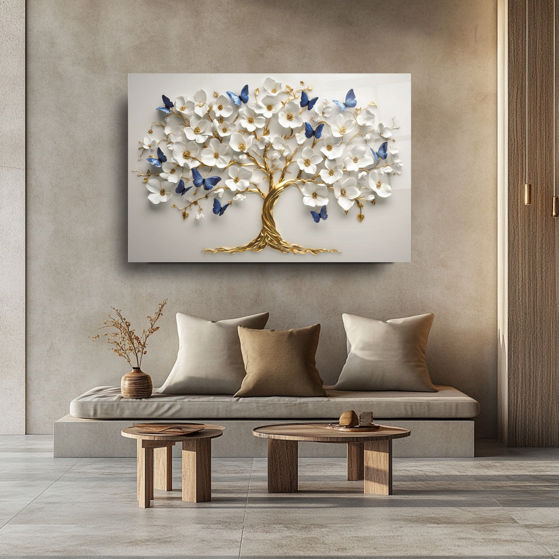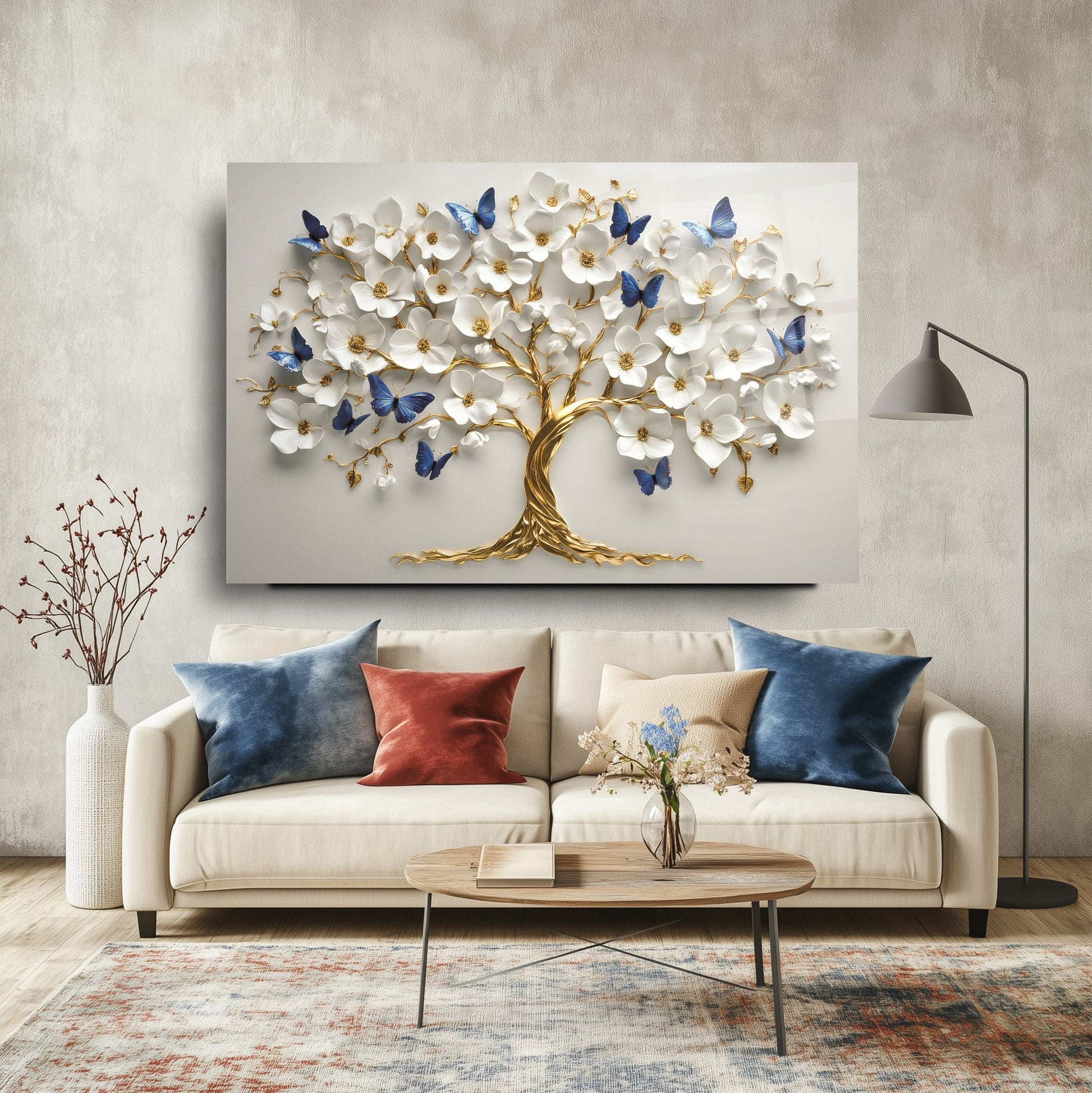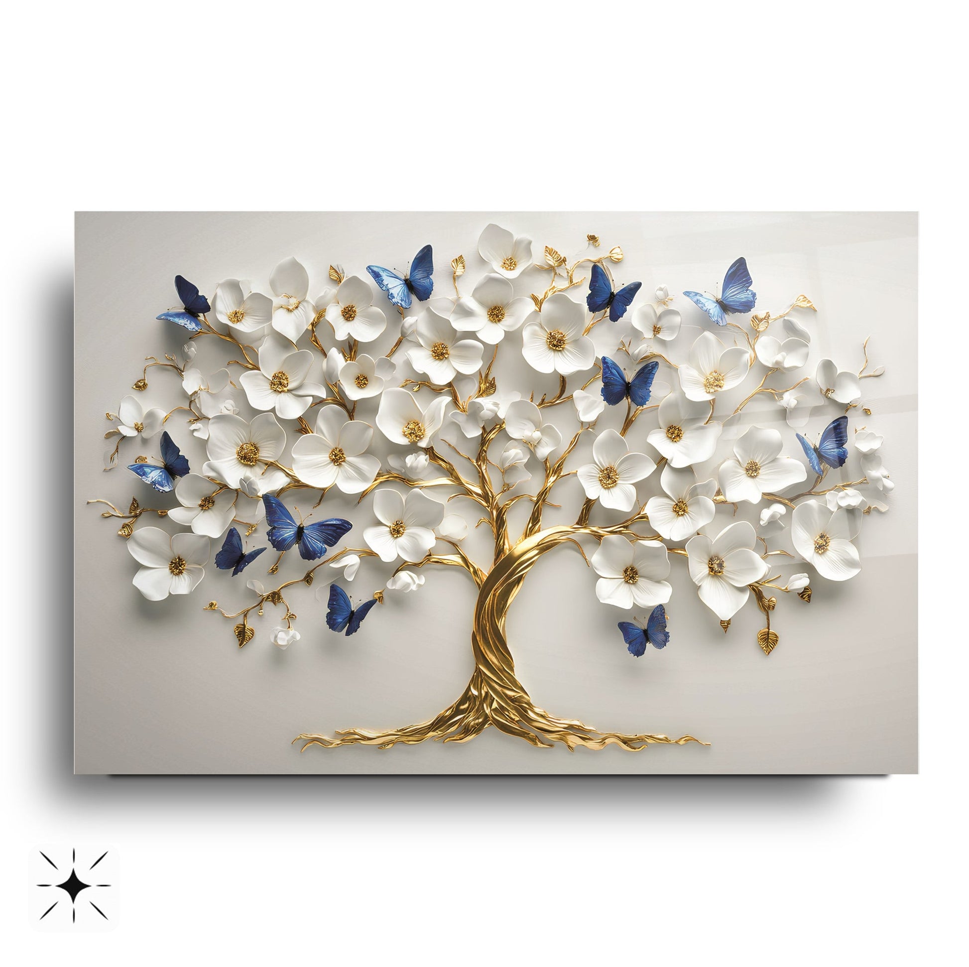 CamDeko'dan ev ve iş yerlerinize zenginlik ve sanatsal bir derinlik katan özel bir eser: Mavi Kelebekli Çiçekli Gold Hayat Ağacı Kırılmaz Modern UV Baskı Temperli Cam Tablo! Yaşamın ve yenilenmenin sembolü Hayat Ağacı'nın etrafında uçuşan, büyüleyici mavi kelebekler, narin çiçekler ve lüks gold detaylarla dolu bu tablo, mekanlarınıza dinamik ve huzurlu bir atmosfer katıyor.
