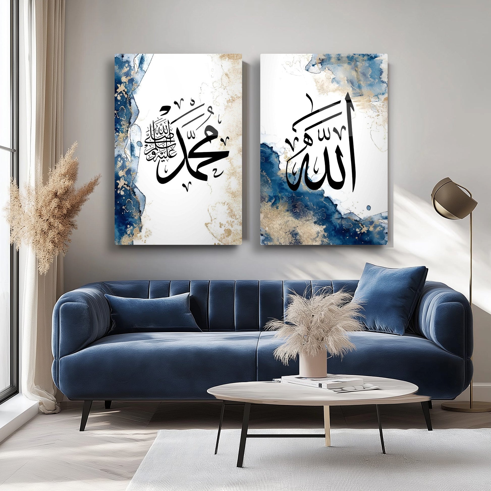 Mavi soyut mermer desenli, Allah ve Muhammed lafzını içeren bu mega boy ikili cam tablo seti, hem estetik hem de manevi değer taşıyor. Kırılmaz cam üzerine UV baskı ile hazırlanmış, yüksek dayanıklılığa sahip ve gerçek renklerle göz alıcı bir görünüm sunuyor. Modern İslami dekorasyonunuz için ideal olan bu tablo, salon veya ibadet alanlarınıza zarafet ve anlam katacak özel bir seçenek. CamDeko kalitesiyle, uzun ömürlü ve şık tasarımıyla mekanlarınızı güzelleştirir.