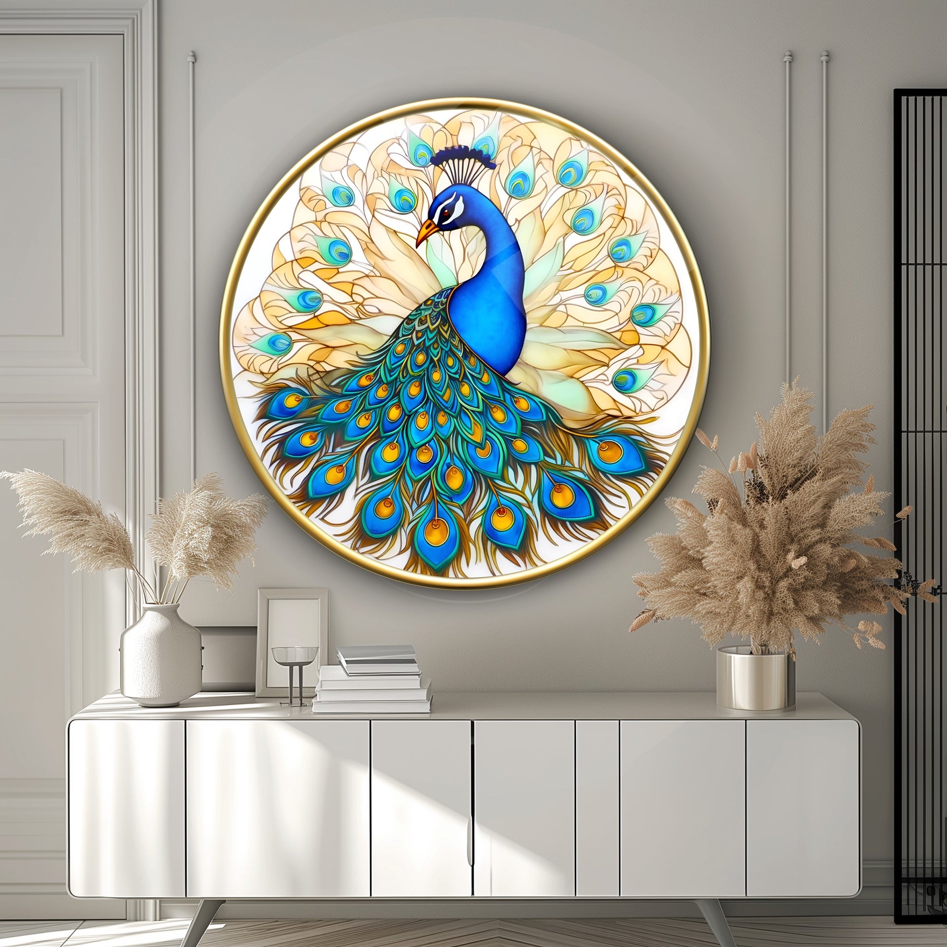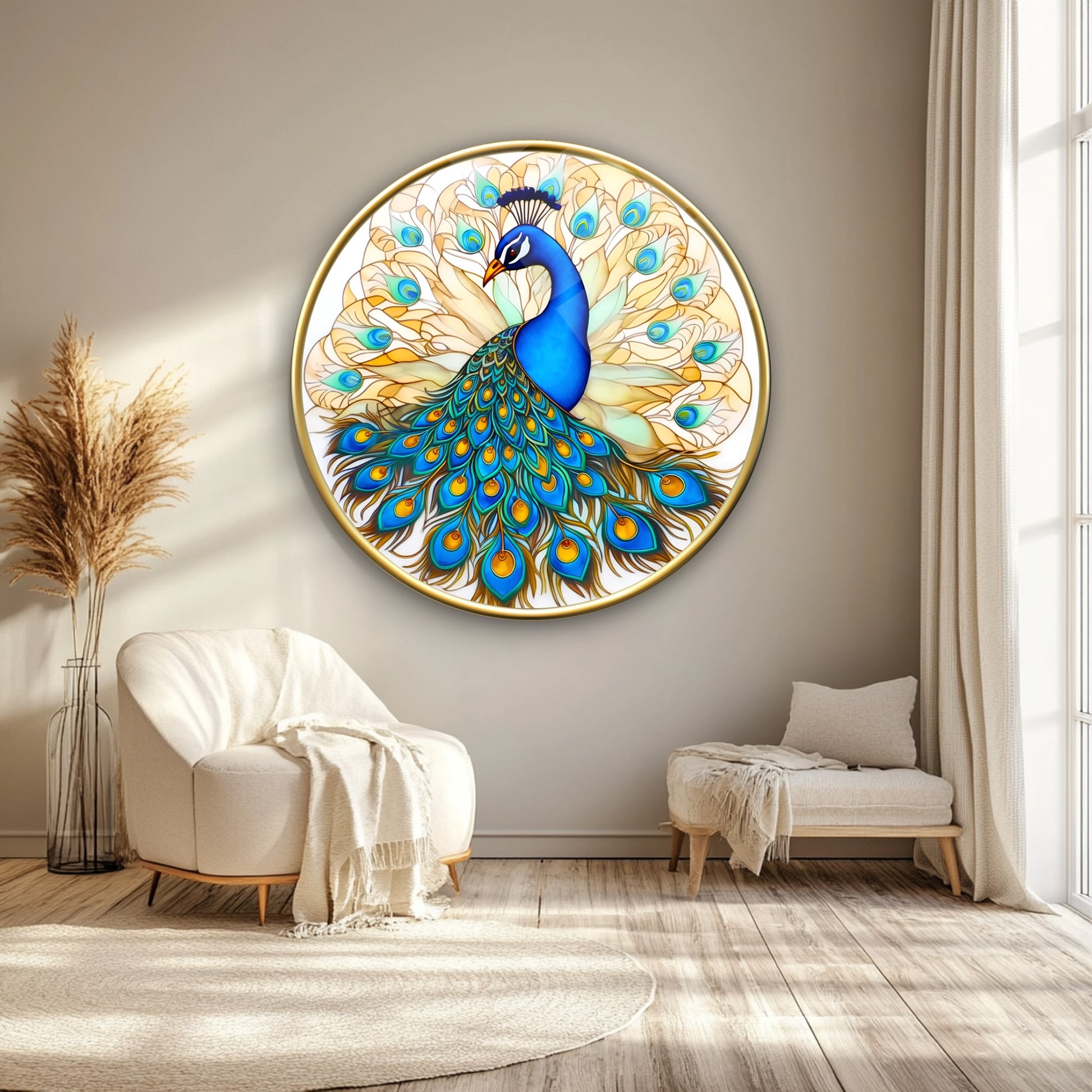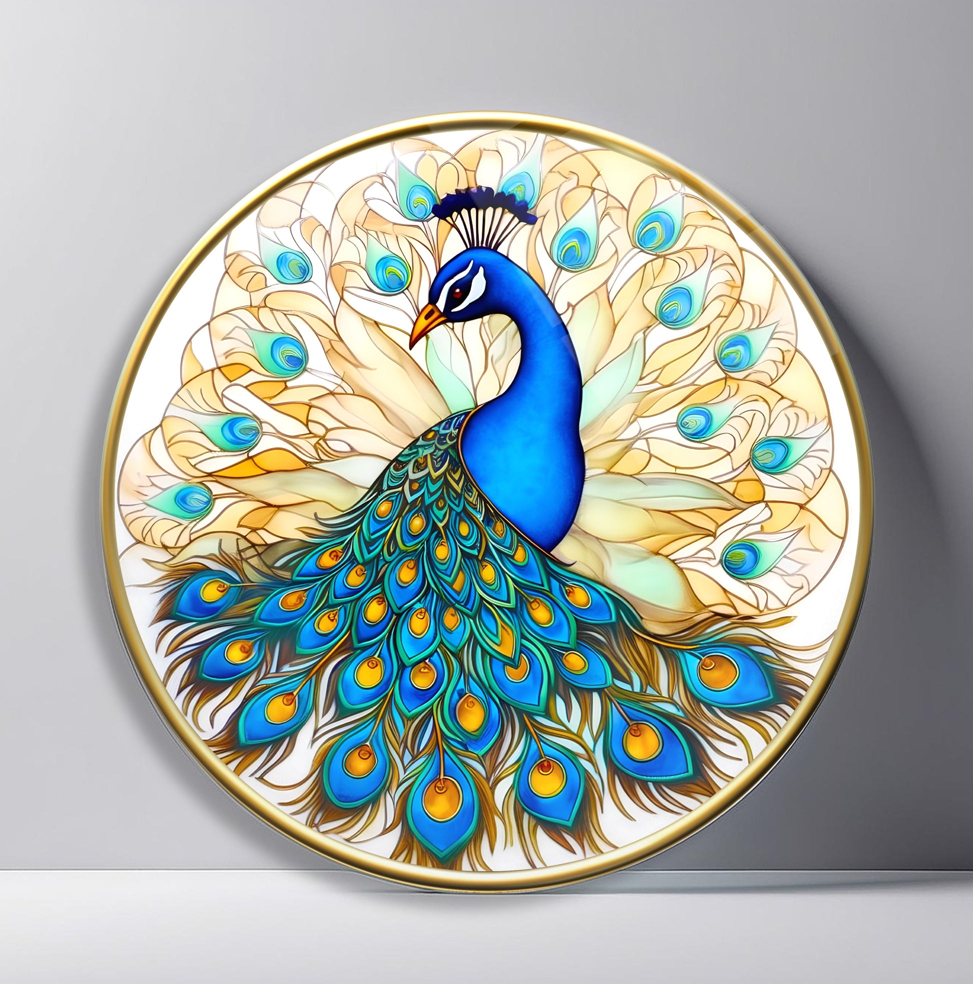 Mavi Tavus Kuşu Yuvarlak Cam Tablo