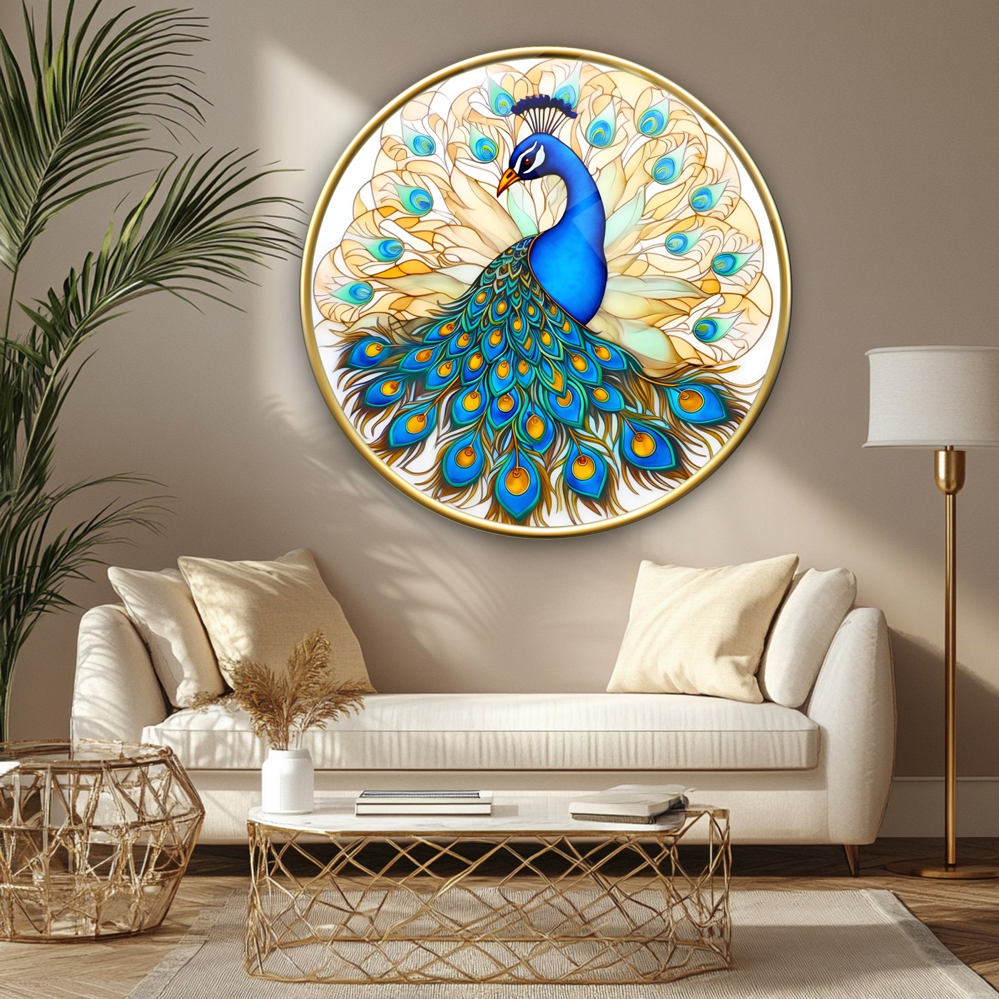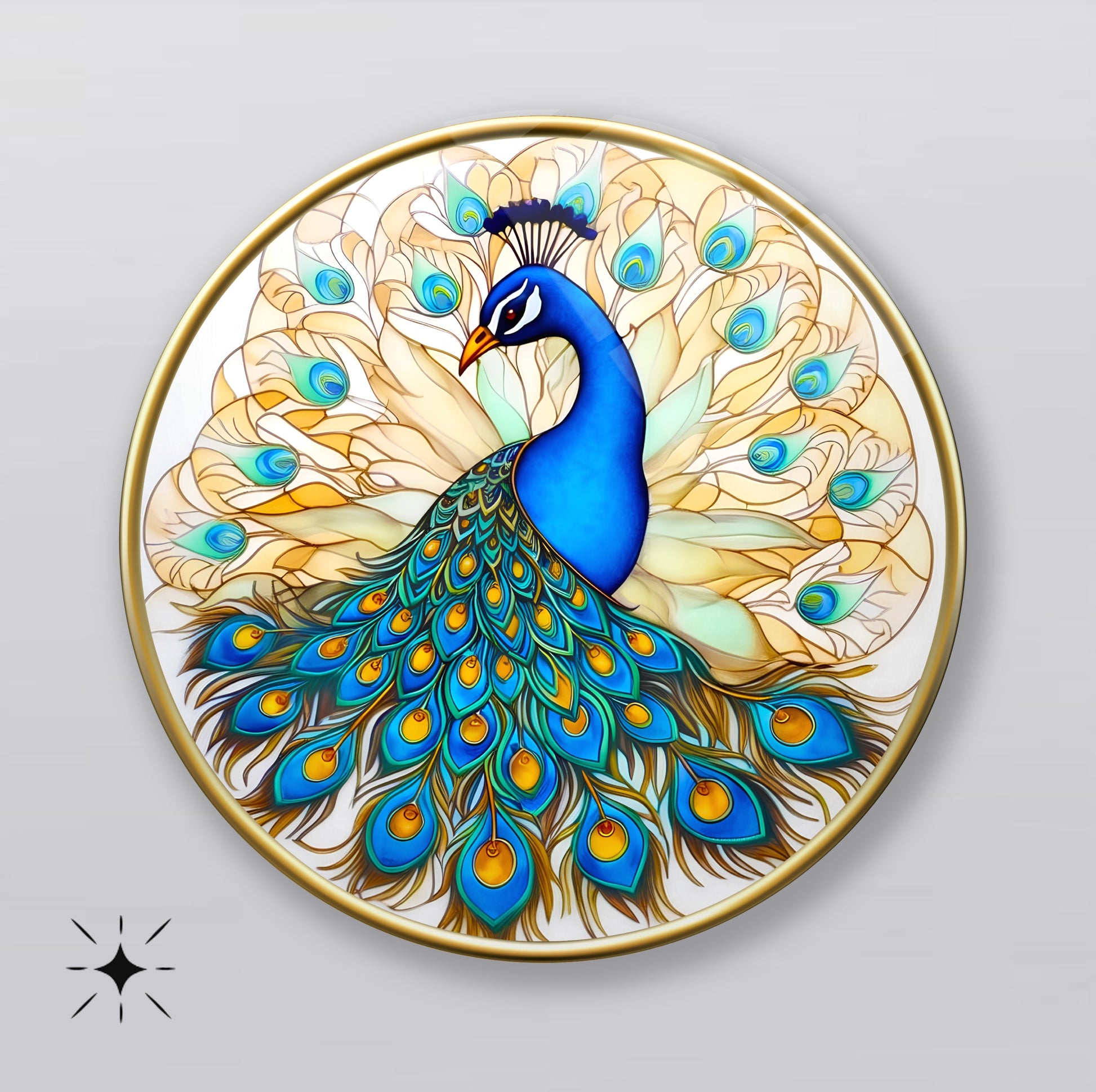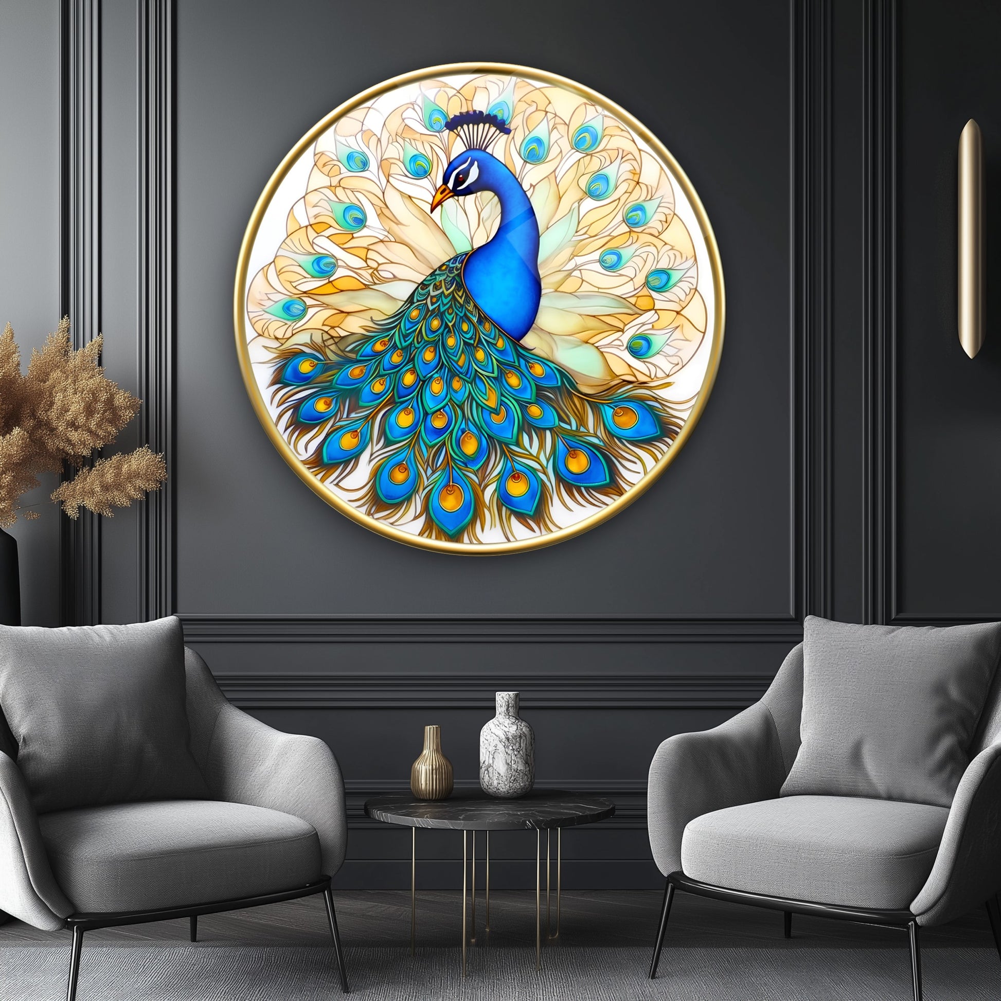 Mavi Tavus Kuşu Yuvarlak Cam Tablo