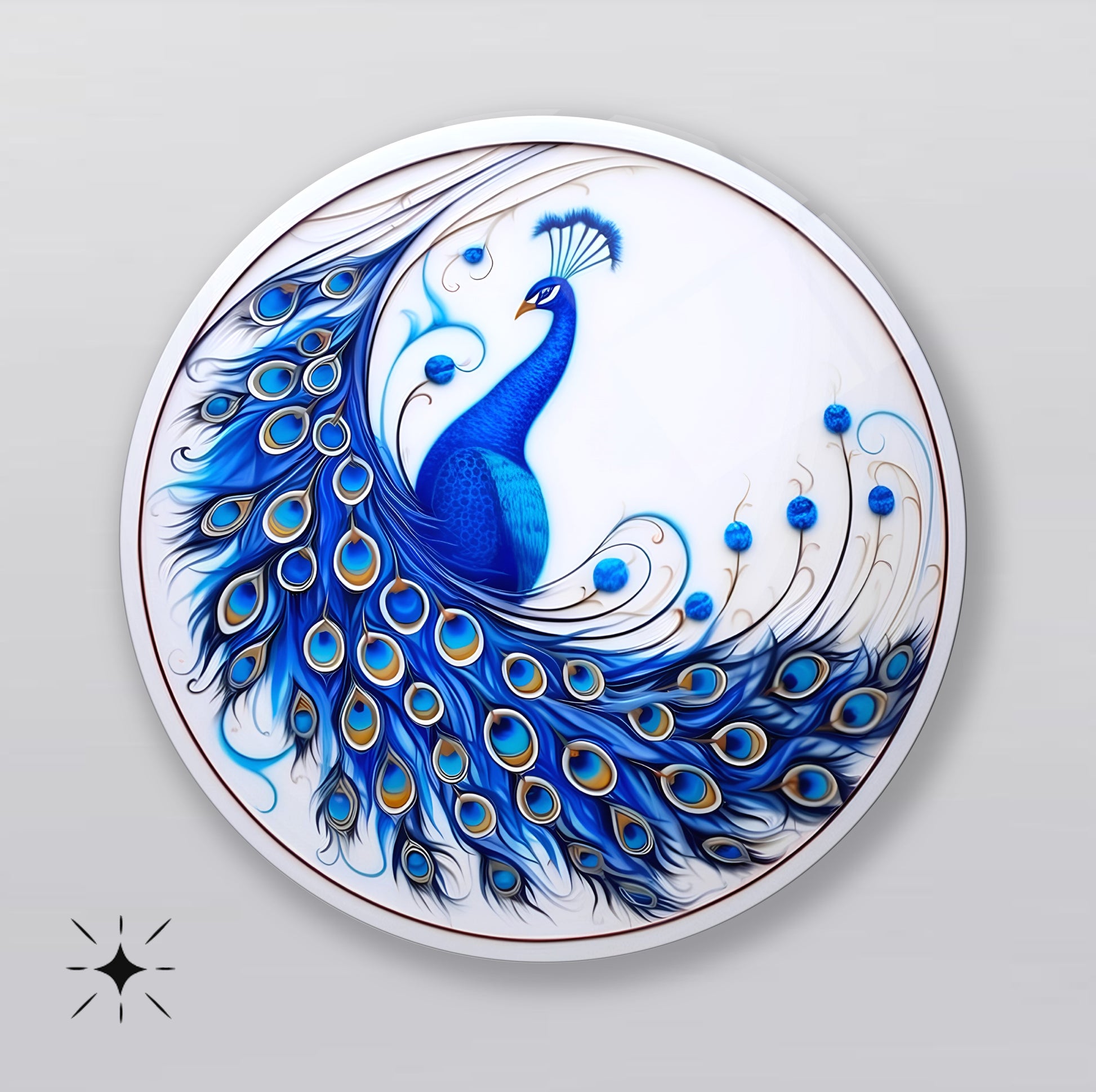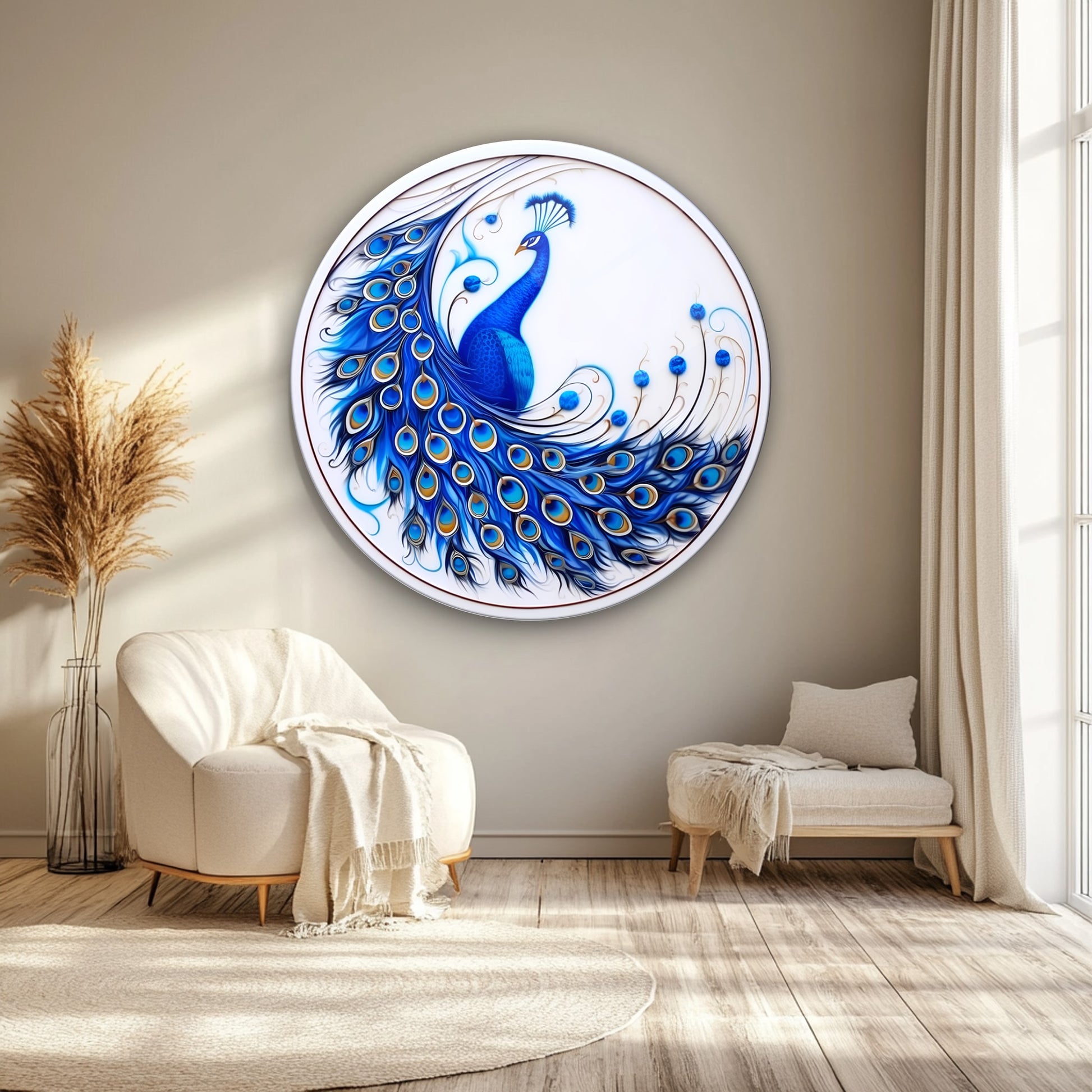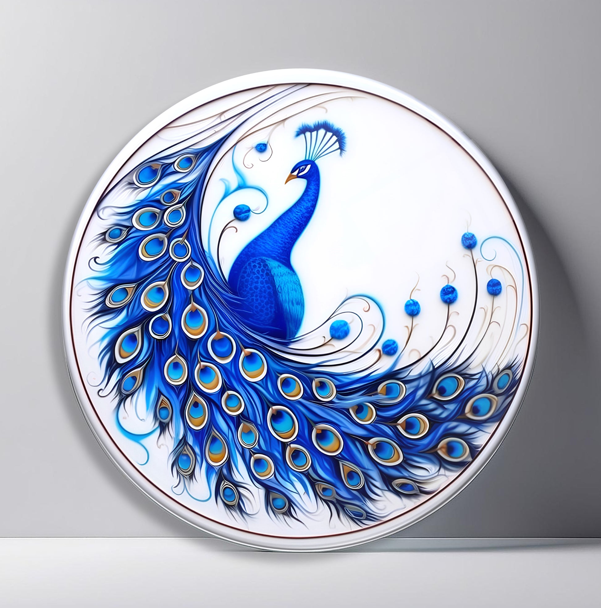 Mavi Tavus Kuşu Yuvarlak Cam Tablo