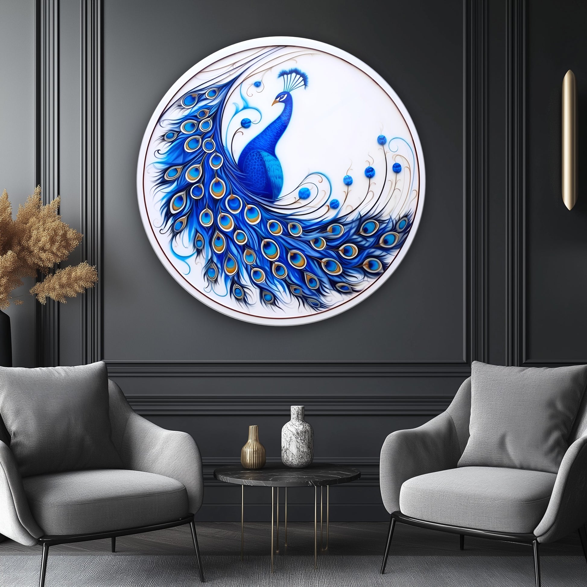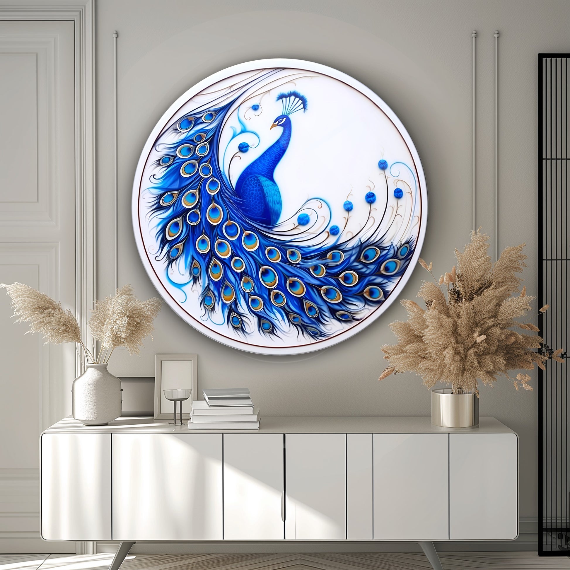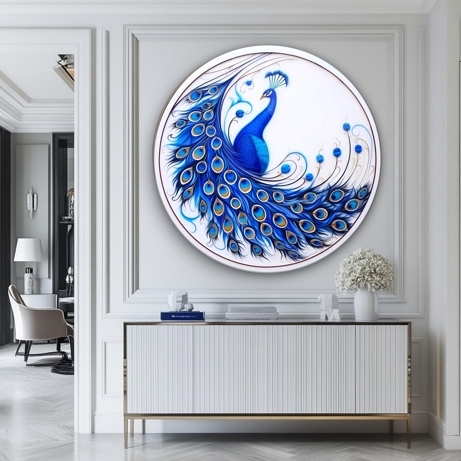 Mavi Tavus Kuşu Yuvarlak Cam Tablo
