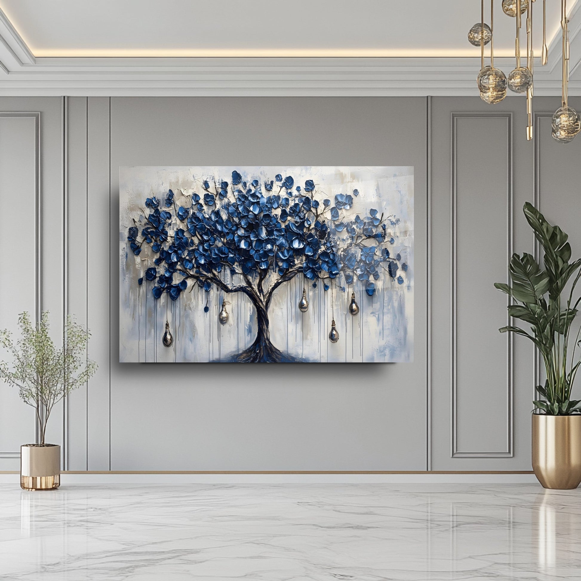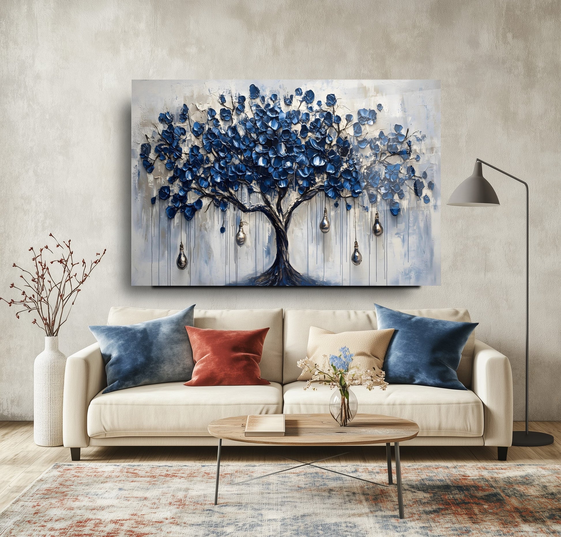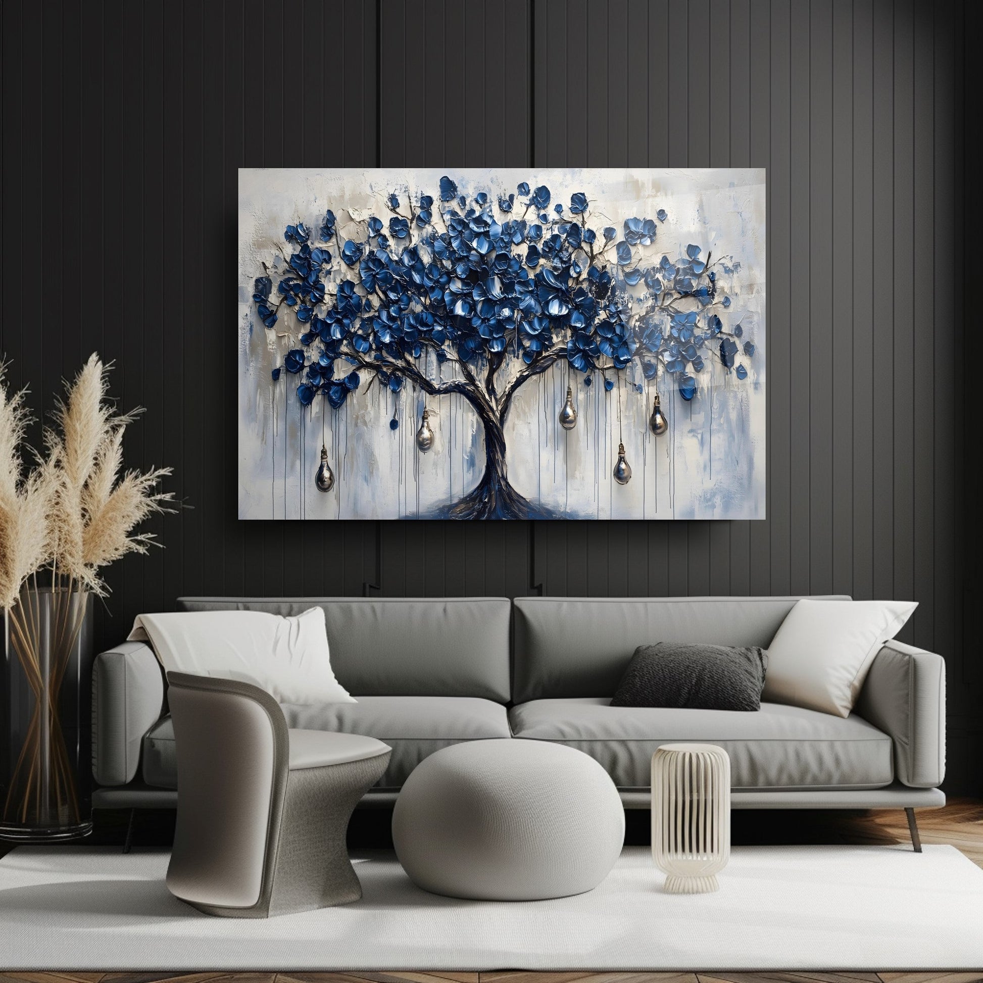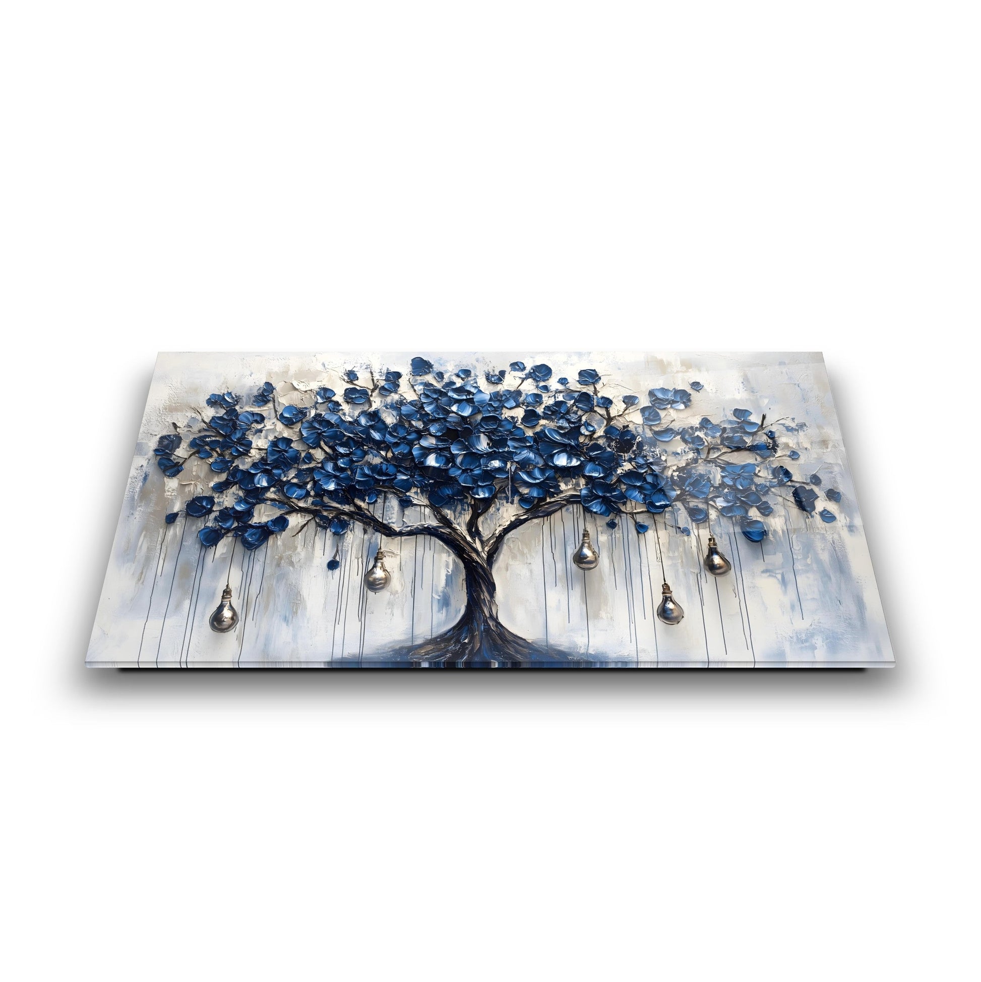 Bu cam tabloda, zarif mavi yapraklarla süslenmiş hayat ağacının gövdesi gri arka plan üzerinde gümüş detaylarla parlıyor. Modern çizgiler ve eskitme dokusu, mekâna dingin bir atmosfer kazandırırken, doğa temalı dekorasyonu güçlendiriyor. Temperli cam ve HD UV baskı kombinasyonu ile renklerin canlılığı uzun süre korunur. Çerçevesiz minimalist tasarımıyla salon, ofis ya da antre dekorasyonlarında estetik ve sofistike bir vurgu isteyenler için ideal bir seçimdir.