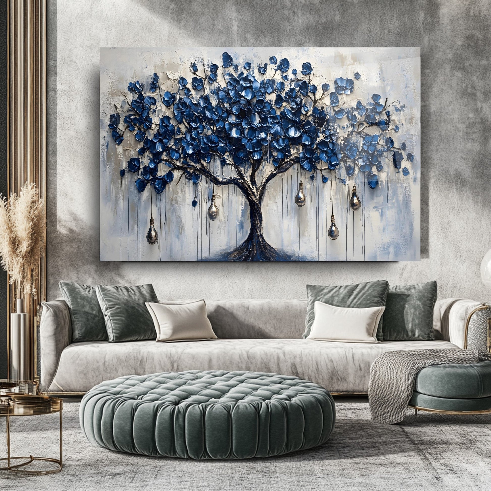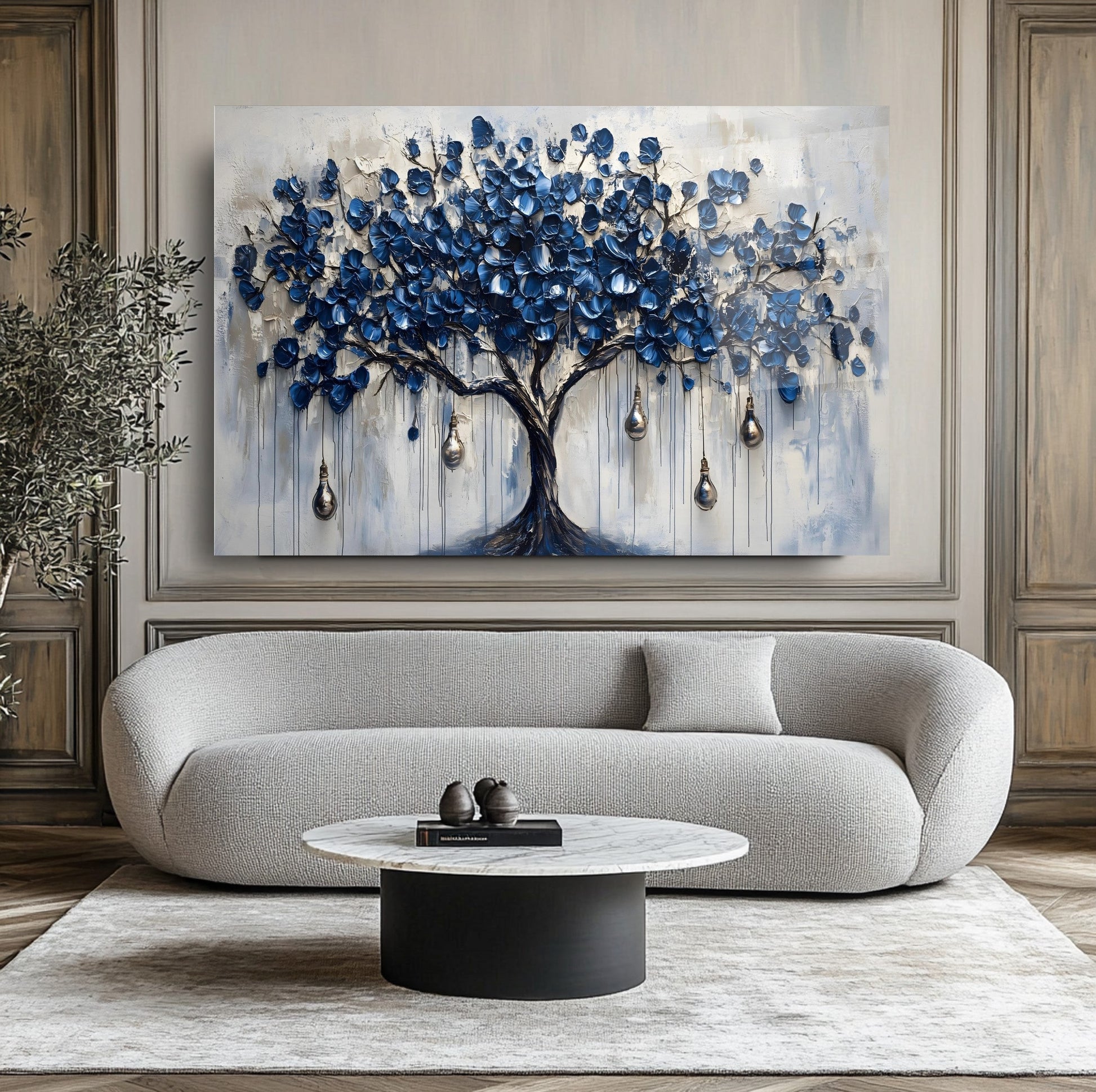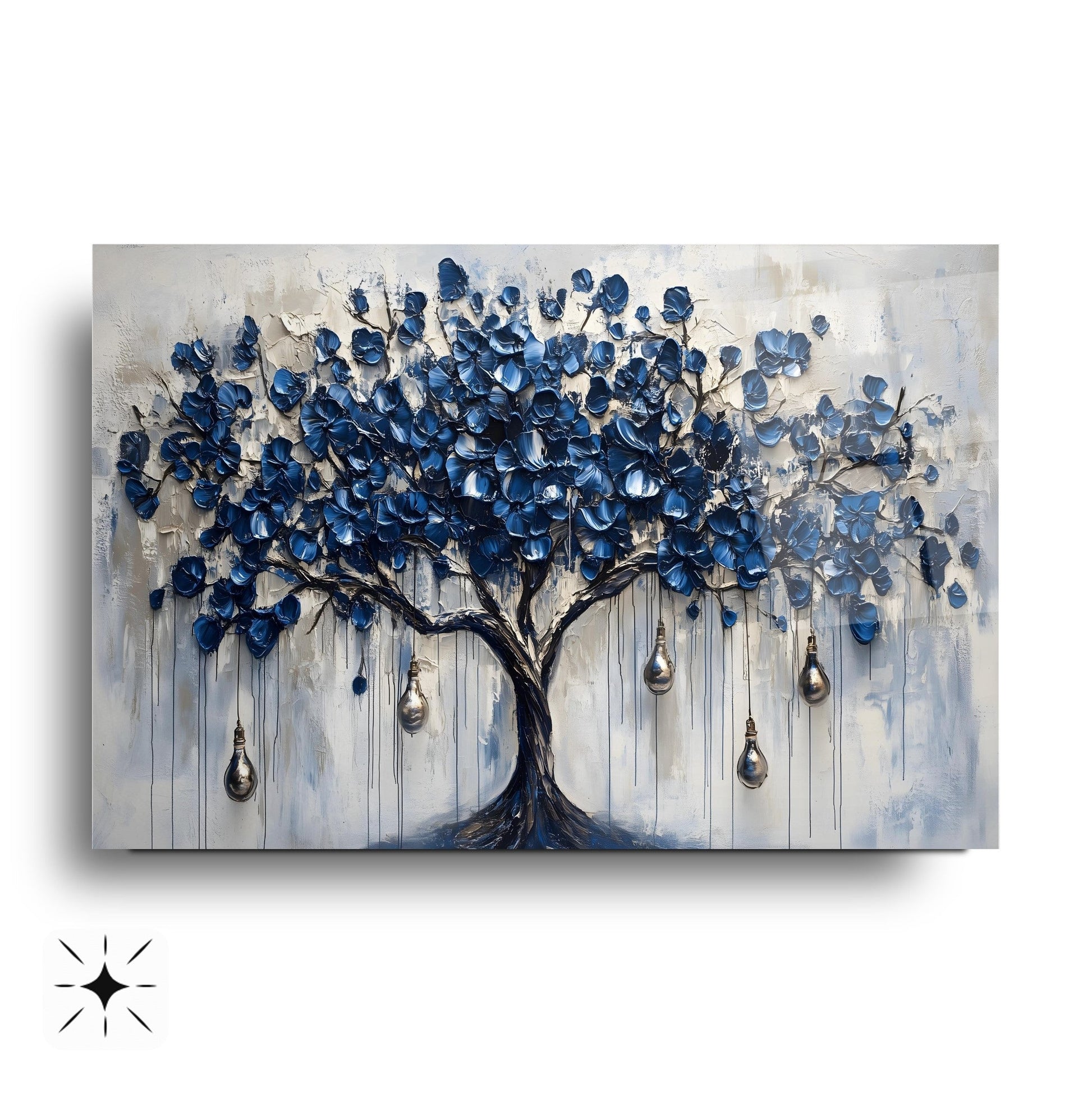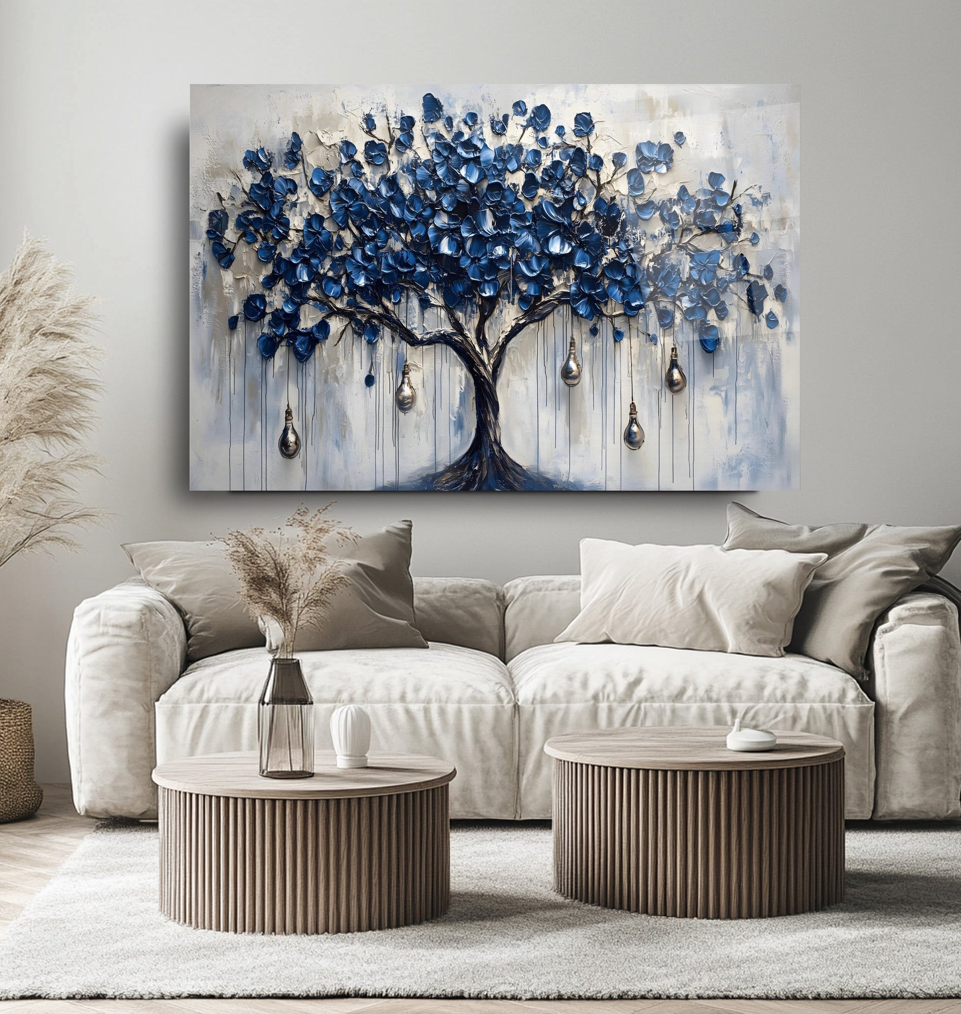 Bu cam tabloda, zarif mavi yapraklarla süslenmiş hayat ağacının gövdesi gri arka plan üzerinde gümüş detaylarla parlıyor. Modern çizgiler ve eskitme dokusu, mekâna dingin bir atmosfer kazandırırken, doğa temalı dekorasyonu güçlendiriyor. Temperli cam ve HD UV baskı kombinasyonu ile renklerin canlılığı uzun süre korunur. Çerçevesiz minimalist tasarımıyla salon, ofis ya da antre dekorasyonlarında estetik ve sofistike bir vurgu isteyenler için ideal bir seçimdir.