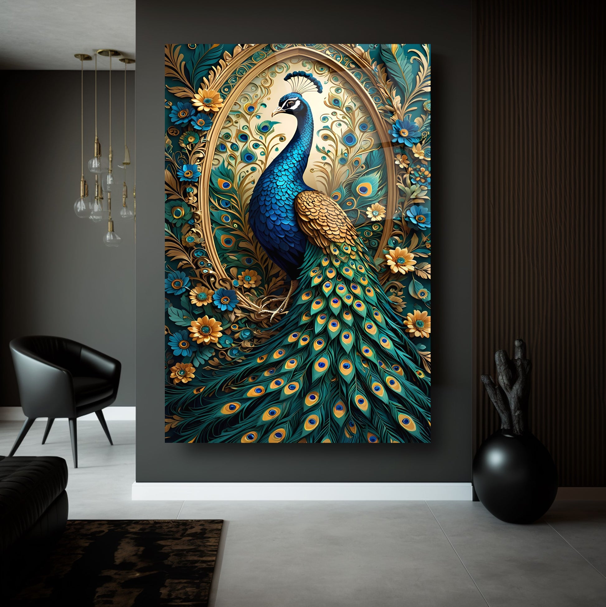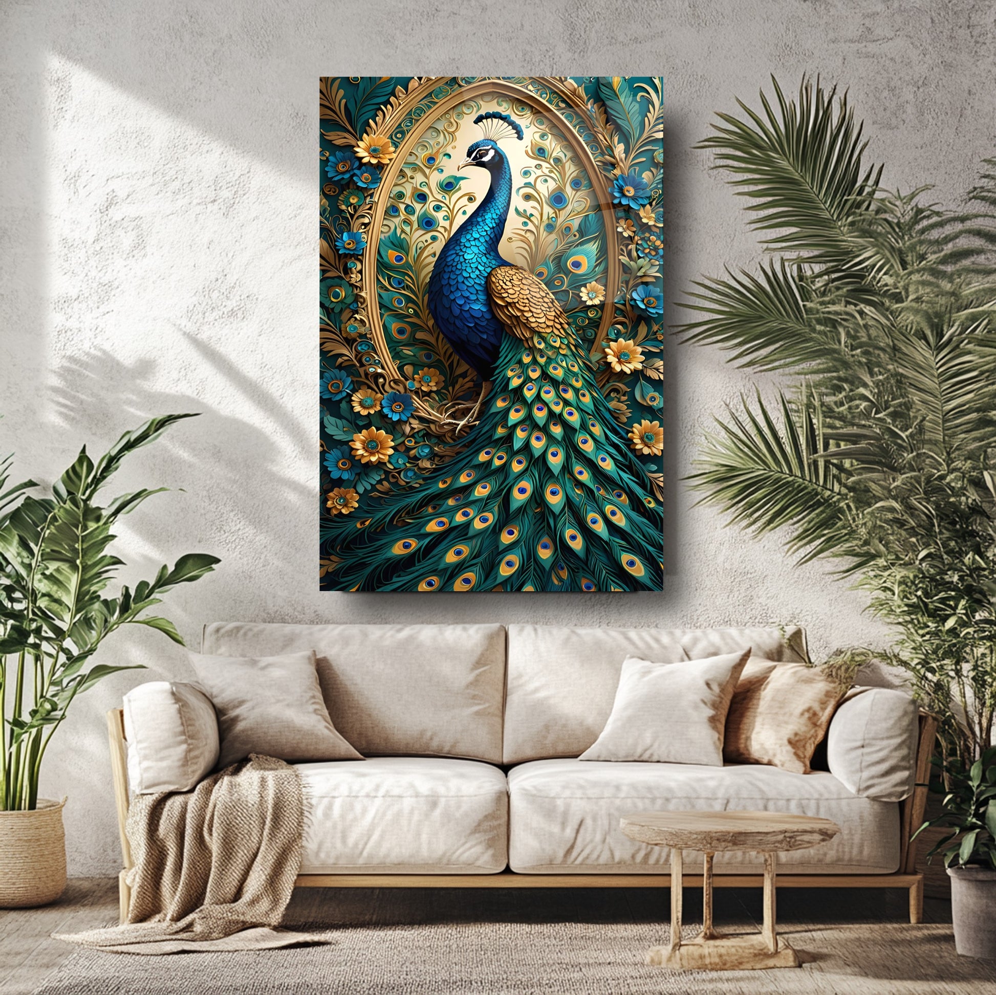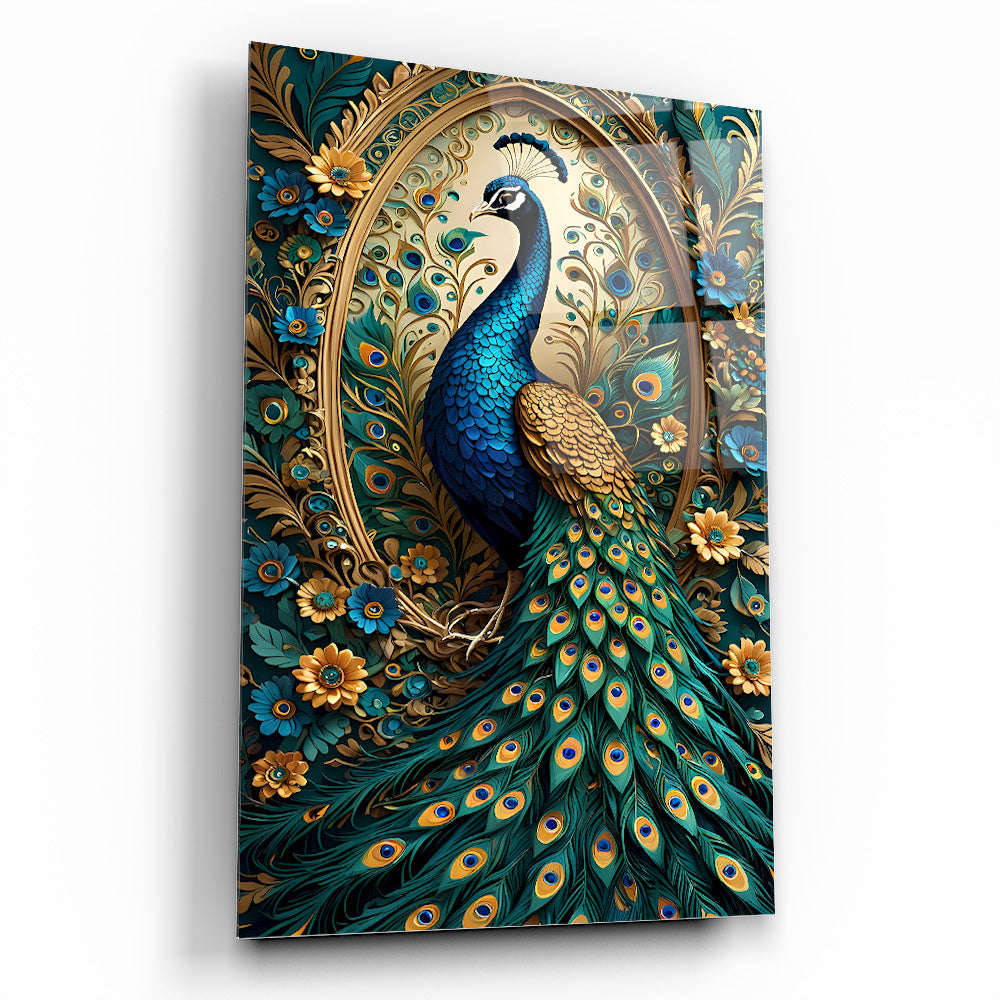 Mekanlarınıza Rengarenk Bir Zarafet: Mavi Yeşil Çiçekli Gold Tavus Kuşu Cam Tablo