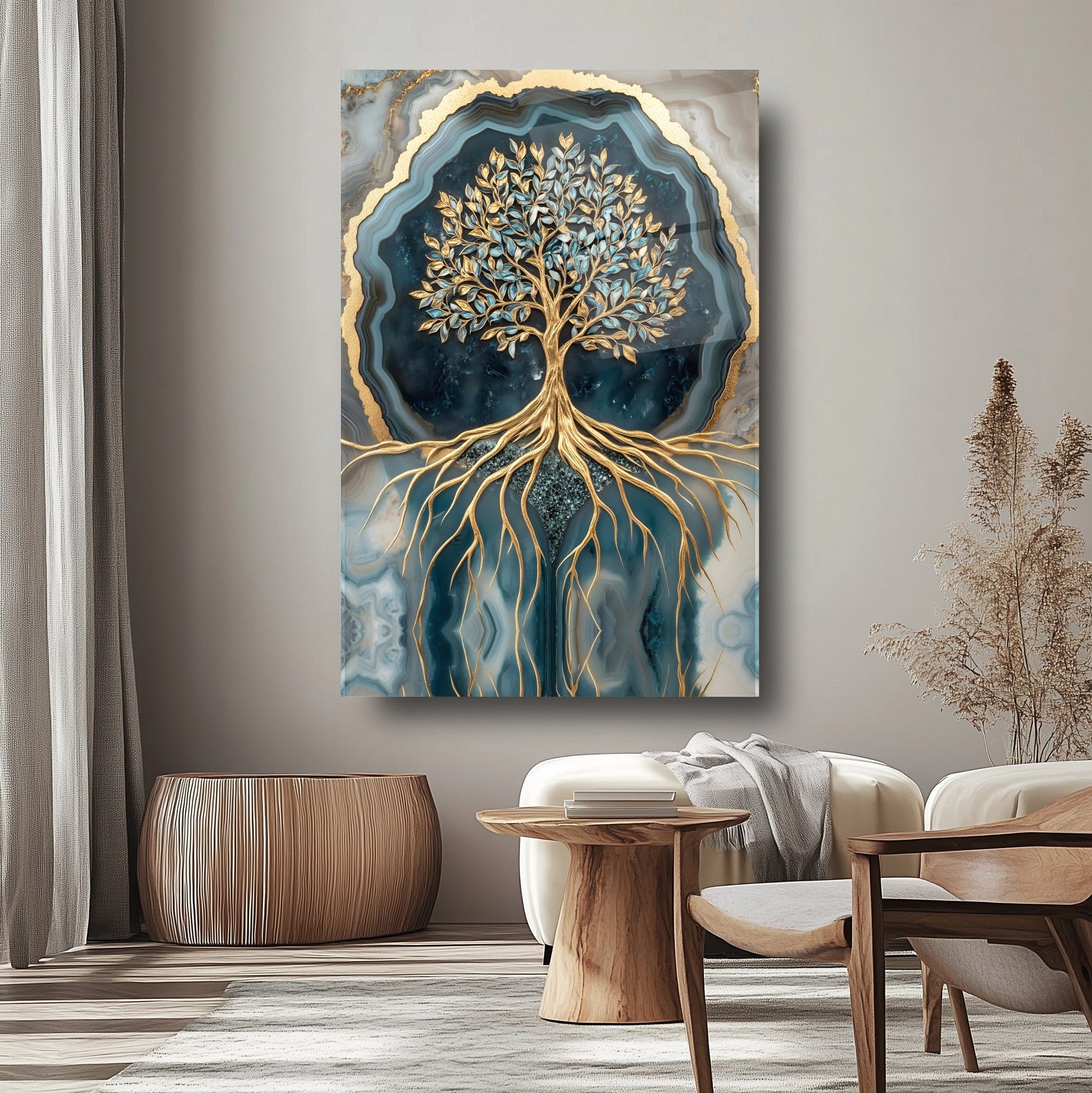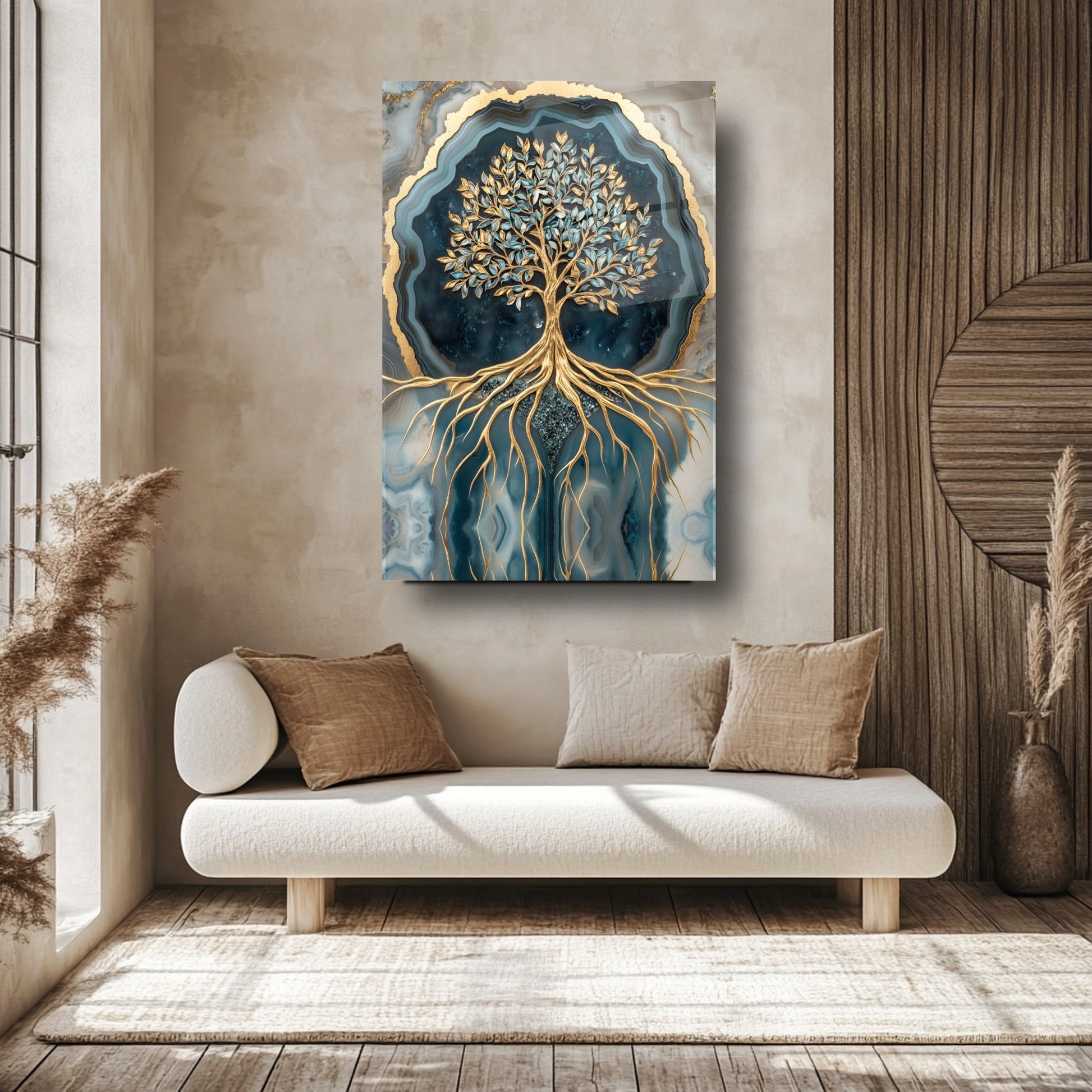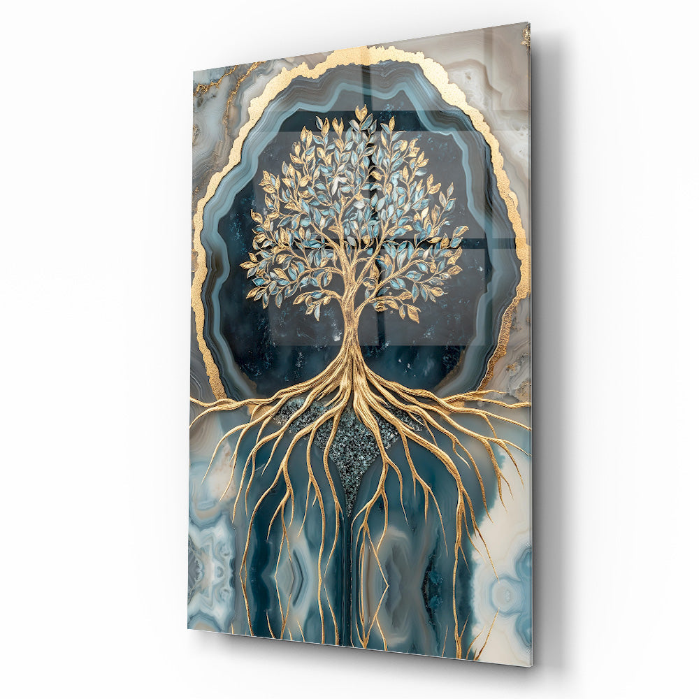 Mermer Desenli Yeşil Gold Hayat Ağacı Cam Tablo
