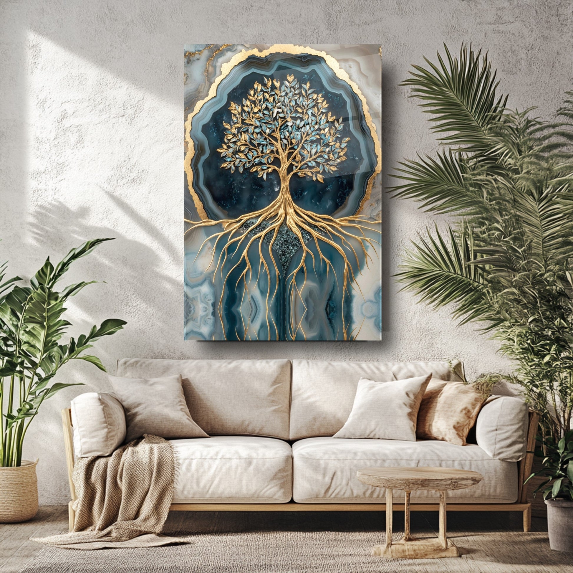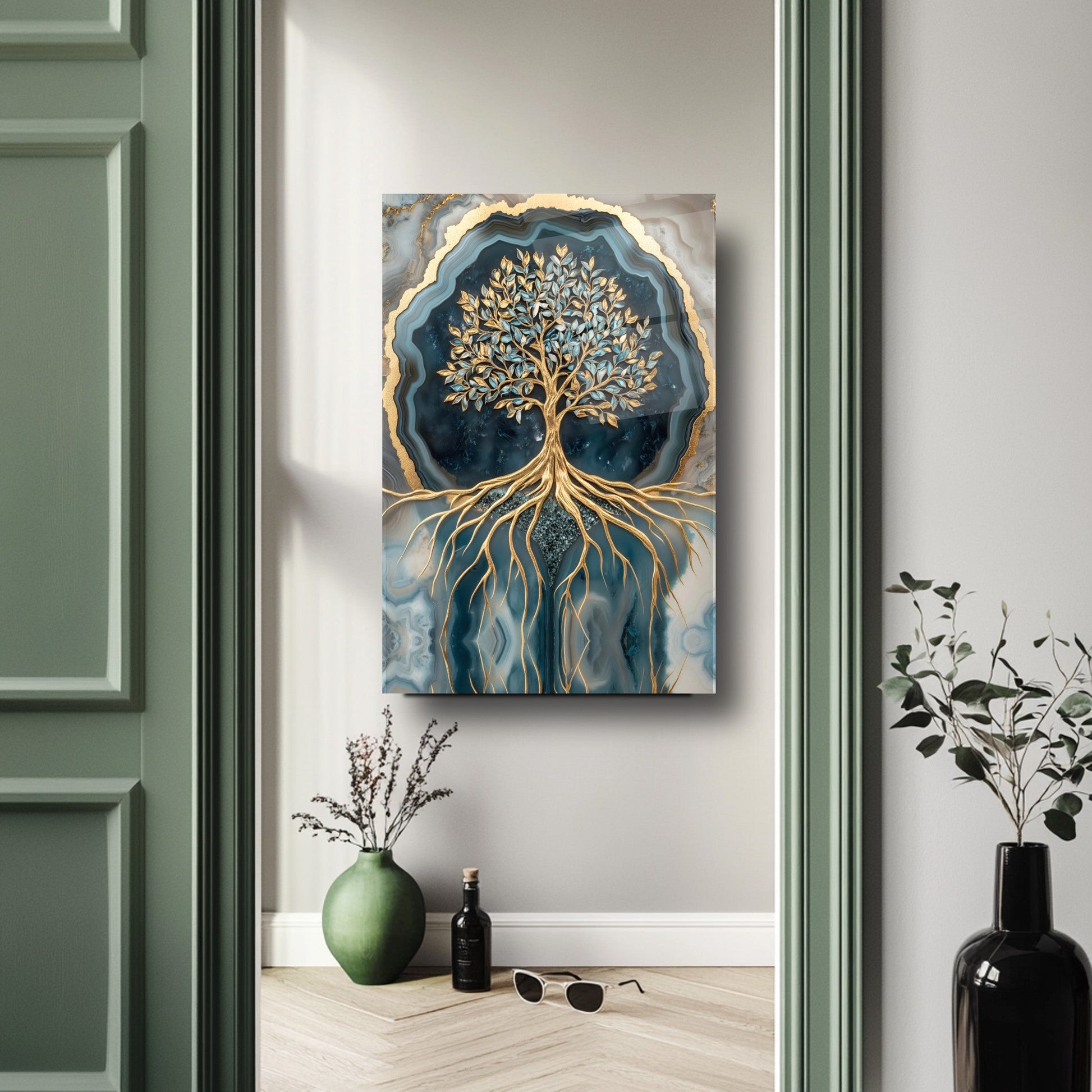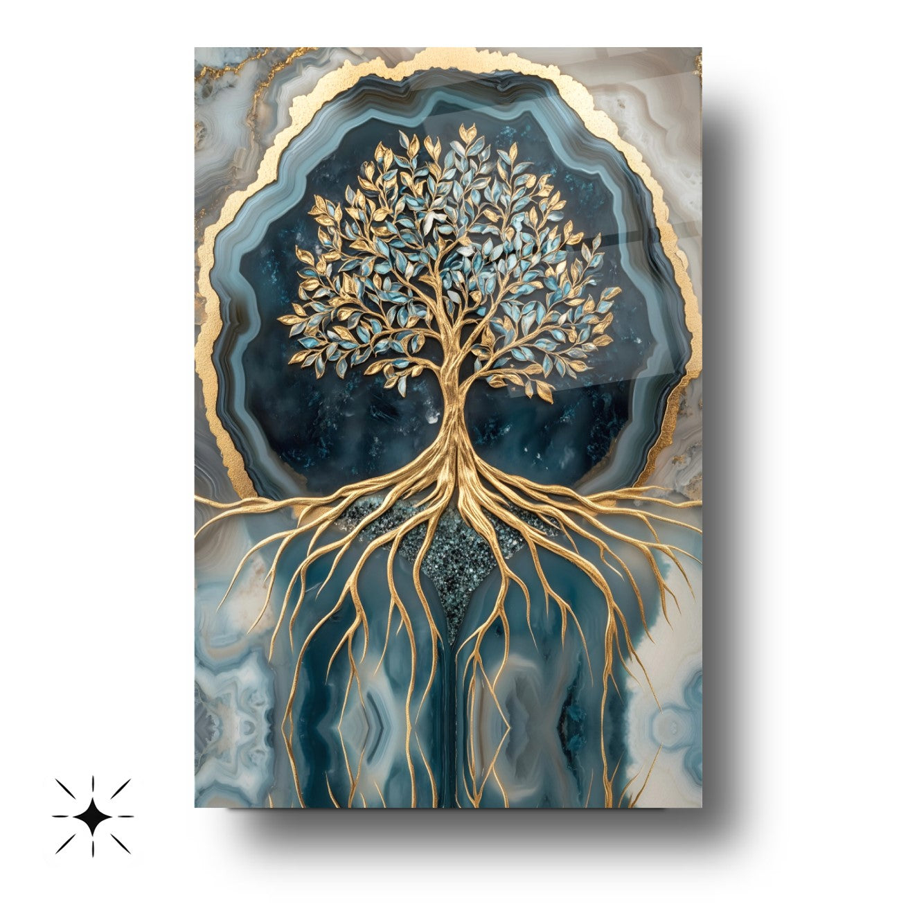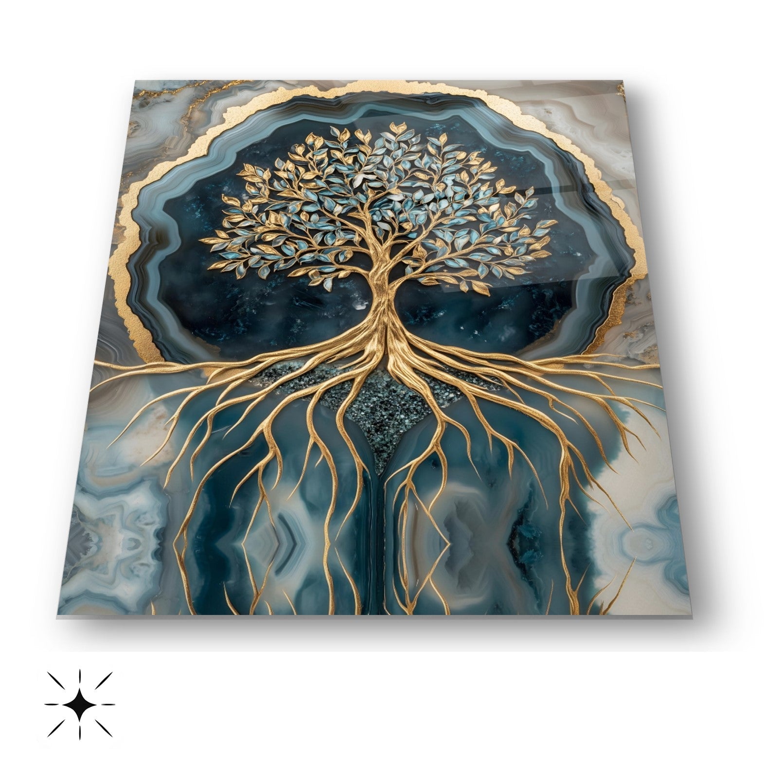 Mekanlarınıza Lüks ve Doğal Bir Dokunuş: Mermer Desen Gold Yeşil Detaylı Hayat Ağacı Cam Tablo