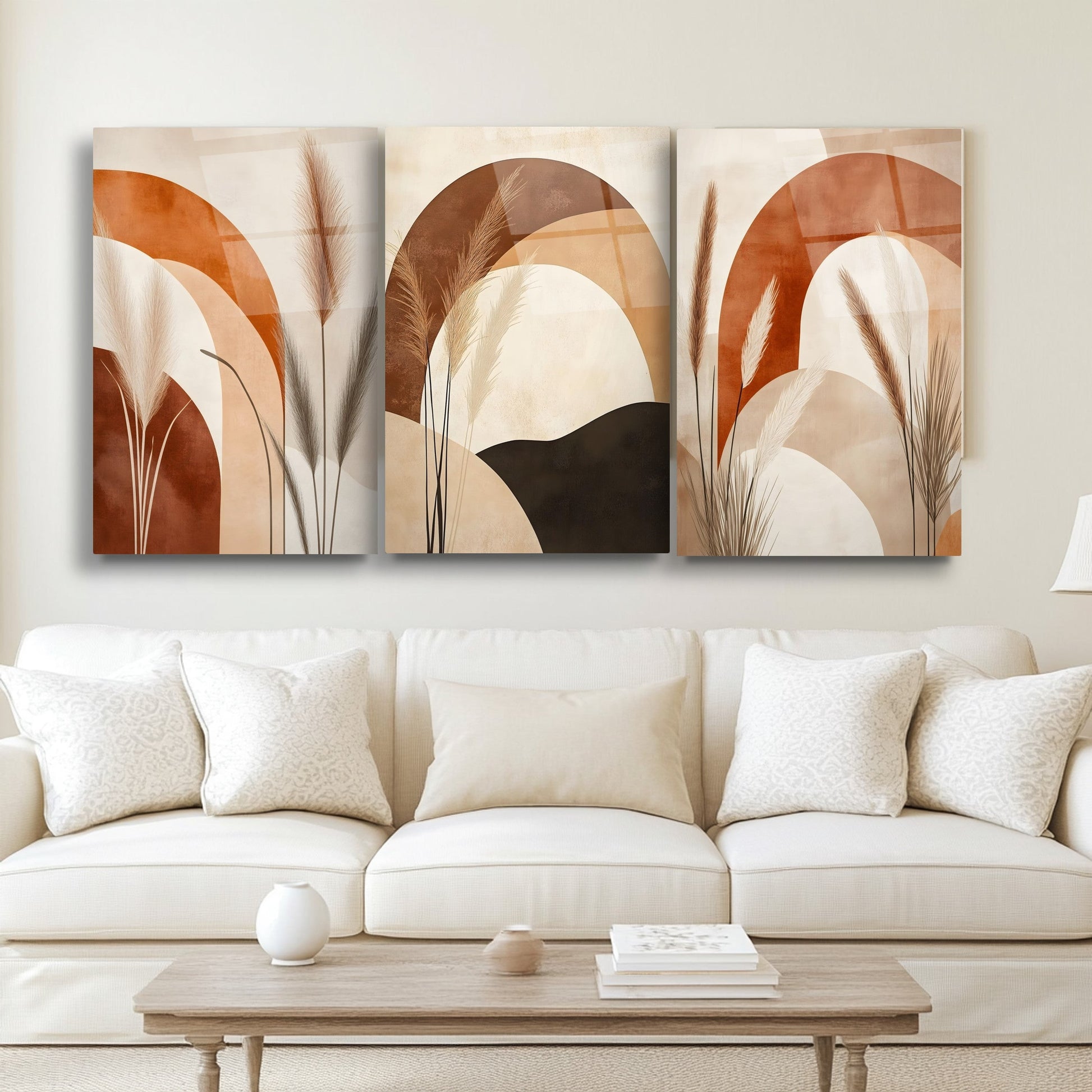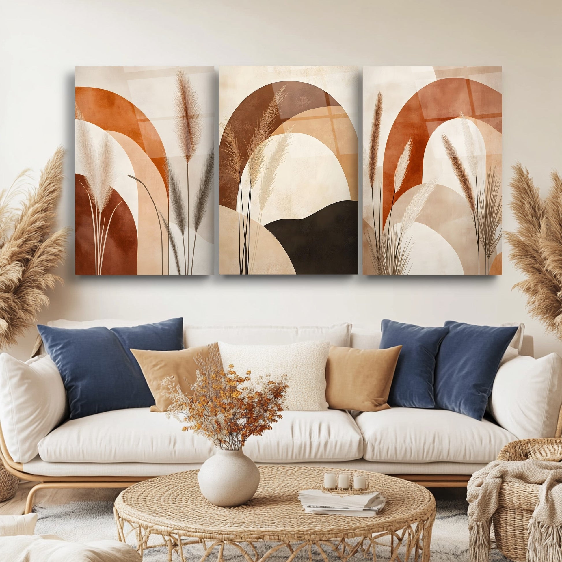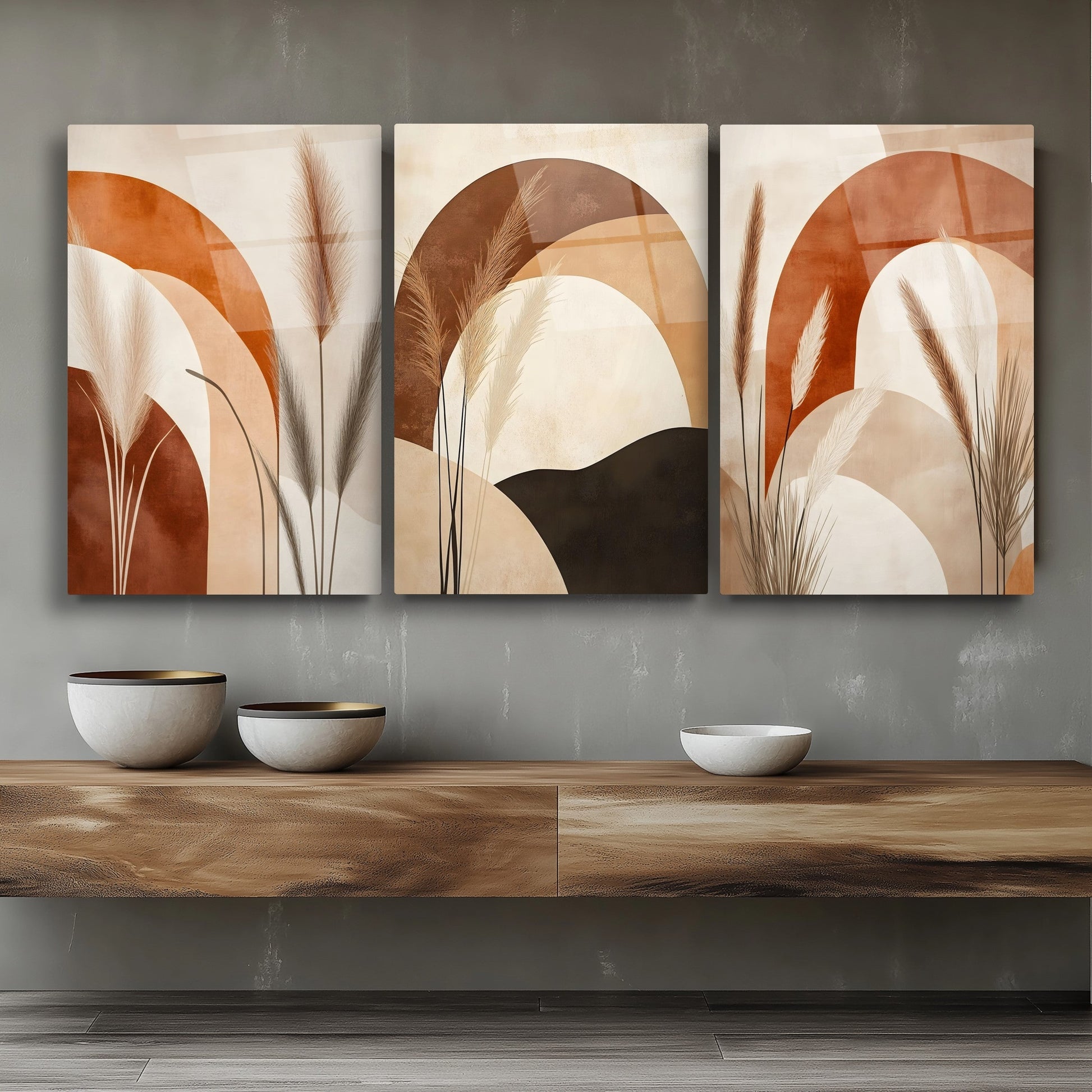 Minimal Boho Desenler Üçlü Set Cam Tablo