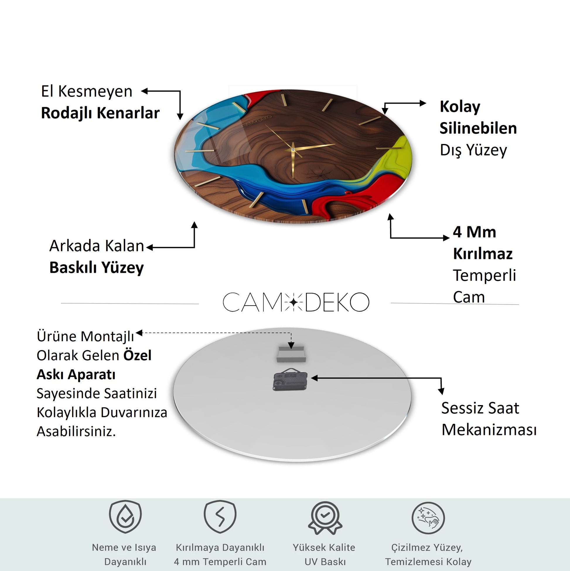 Cam saatlerimiz, son teknoloji UV baskı makineleriyle doğrudan cama uygulanır. Kağıt veya folyo yapıştırma kullanılmaz; baskılar camın arka yüzeyine işlenerek uzun ömürlü ve dayanıklı hale getirilir. Ek olarak, fırınlama boya işlemi ile güçlendirilerek solmaya ve deformasyona karşı ekstra koruma sağlanır.