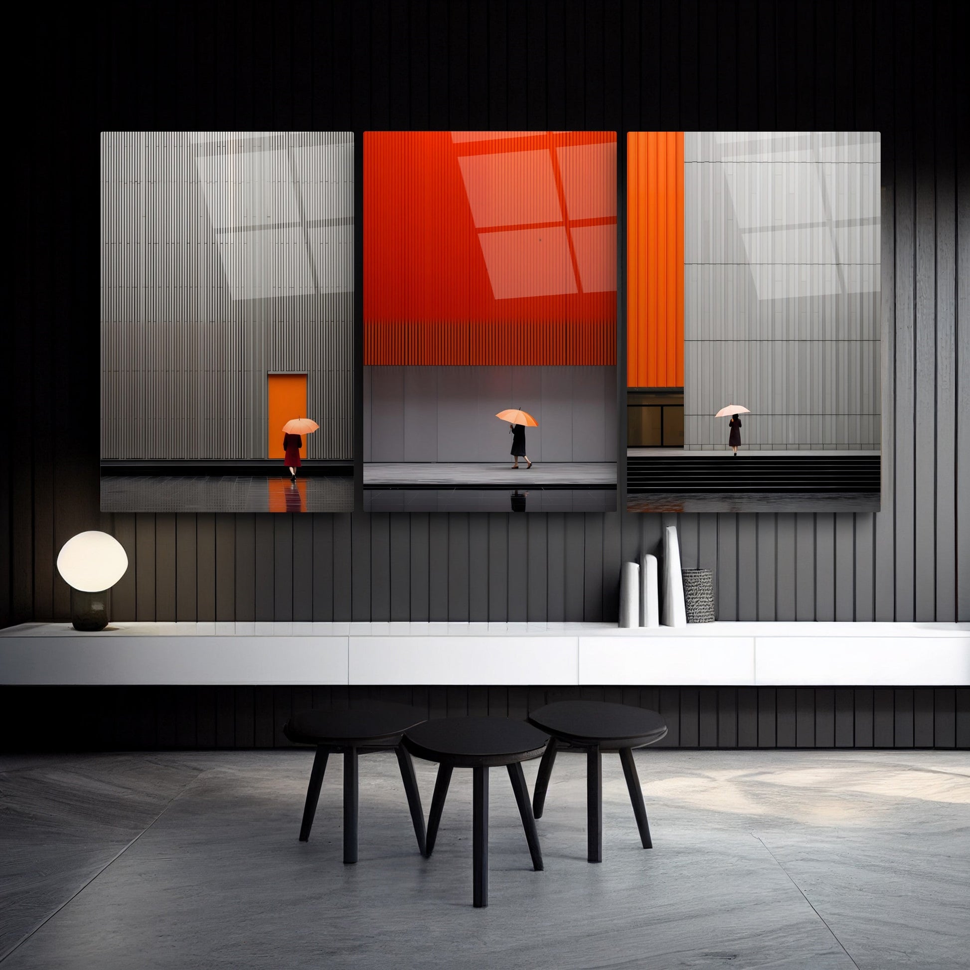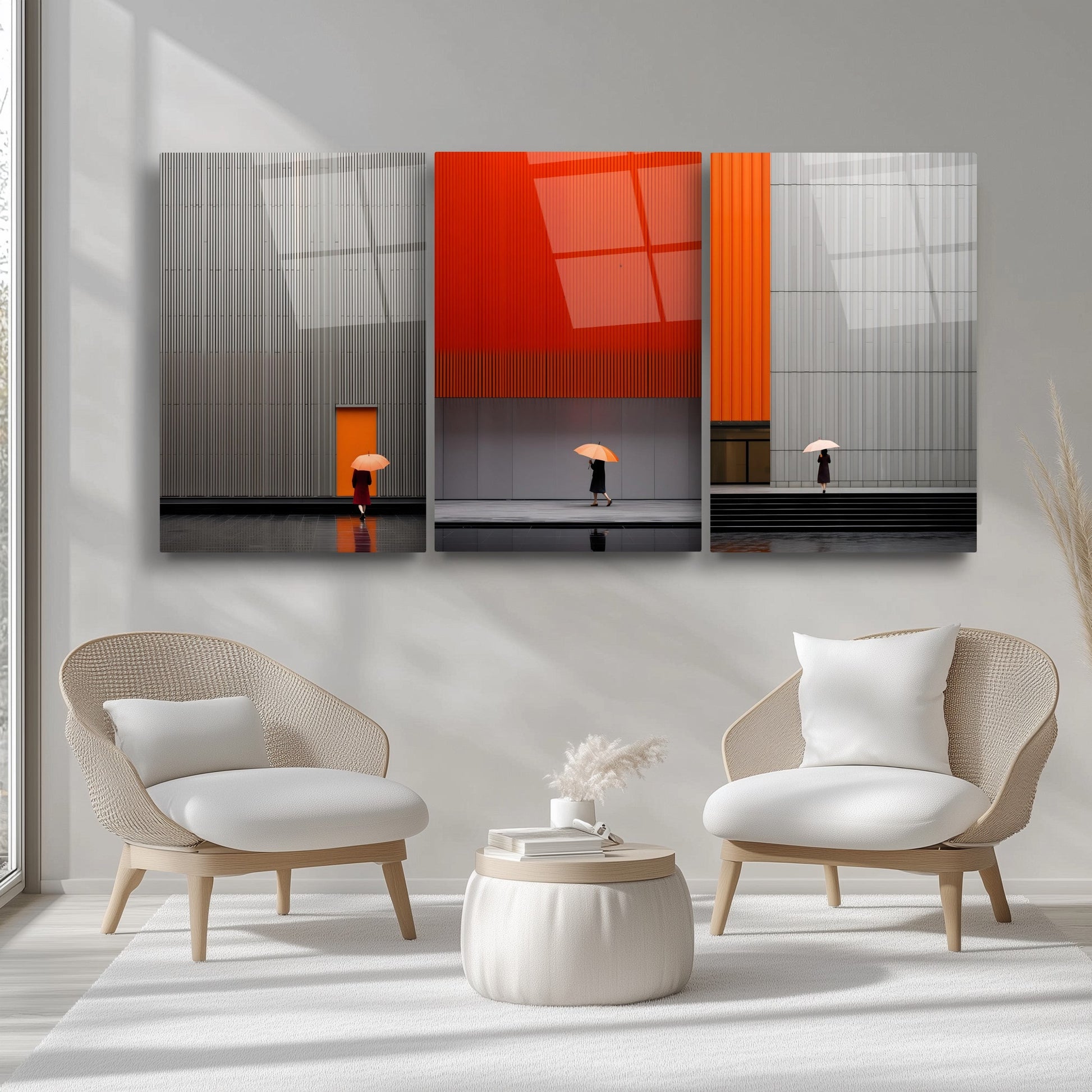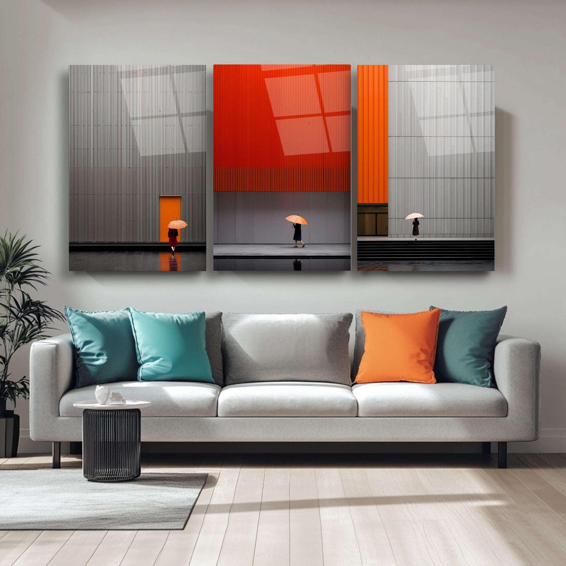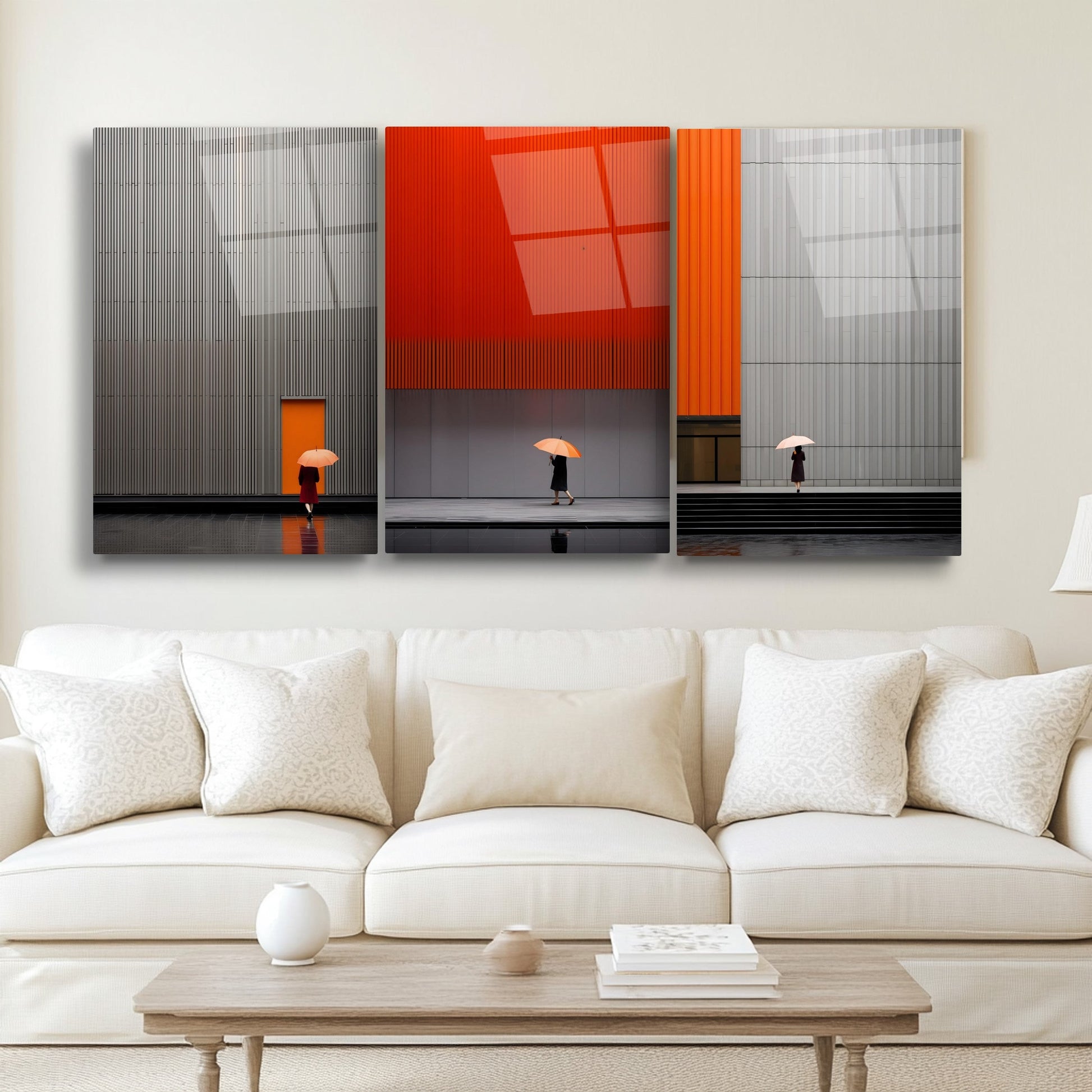 Turuncu tonların sıcaklığıyla tasarlanmış bu üçlü cam tablo seti, minimal bir şehir sahnesini ve şemsiyeli bir kadını yansıtarak zarif bir görsel bütünlük sunar. Modern dekorasyon stiline uyum sağlayan bu tasarım, özellikle salon, yatak odası veya çalışma alanlarında sakin ve estetik bir atmosfer yaratır. UV baskı ile üretilen desenler canlılığını uzun süre korurken, kırılmaz temperli cam yüzey hem güvenli hem de dayanıklıdır. Cam tablo arayanlar için sanatsal dokunuşu sade çizgilerle birleştiren şık ve özgün bir dekorasyon parçasıdır.
