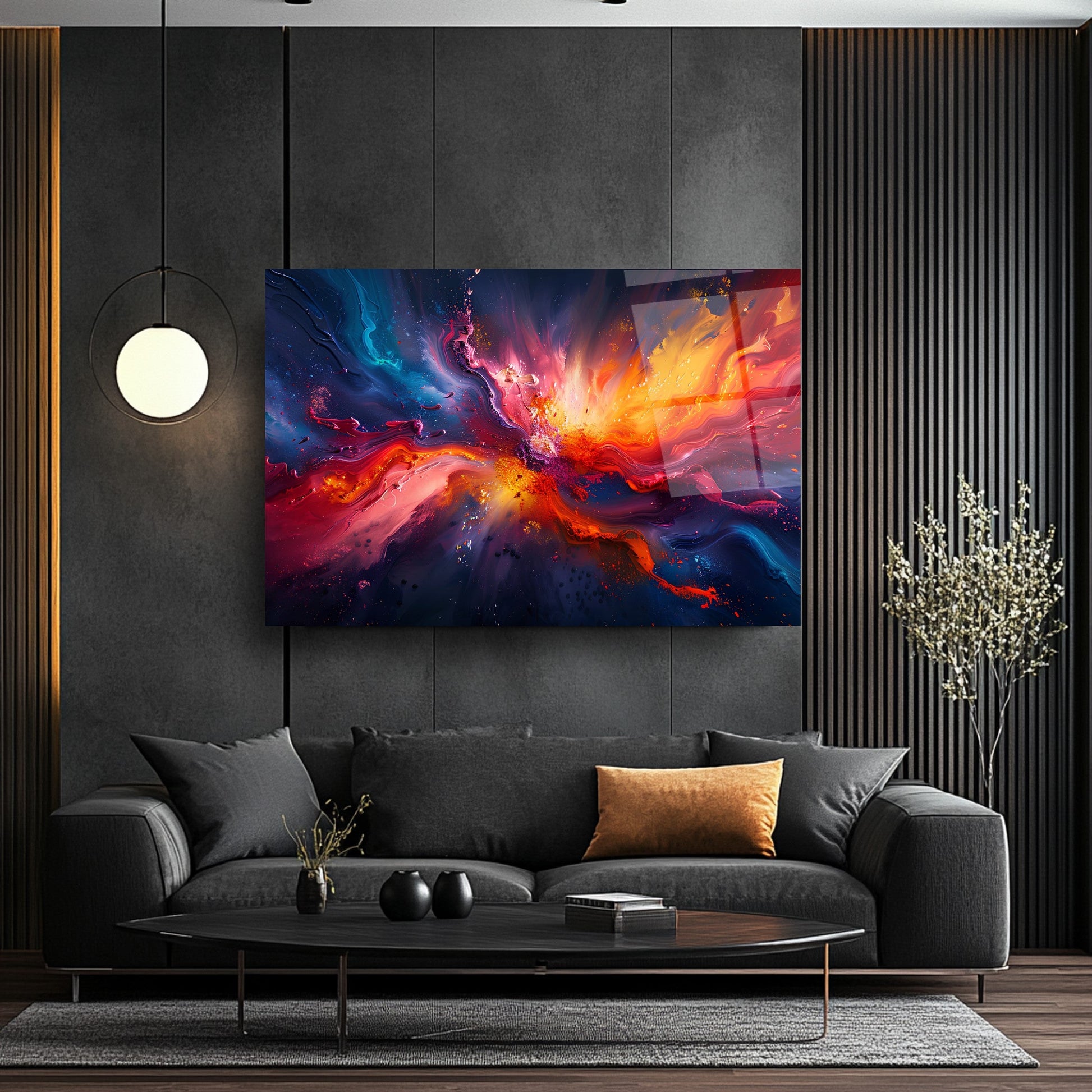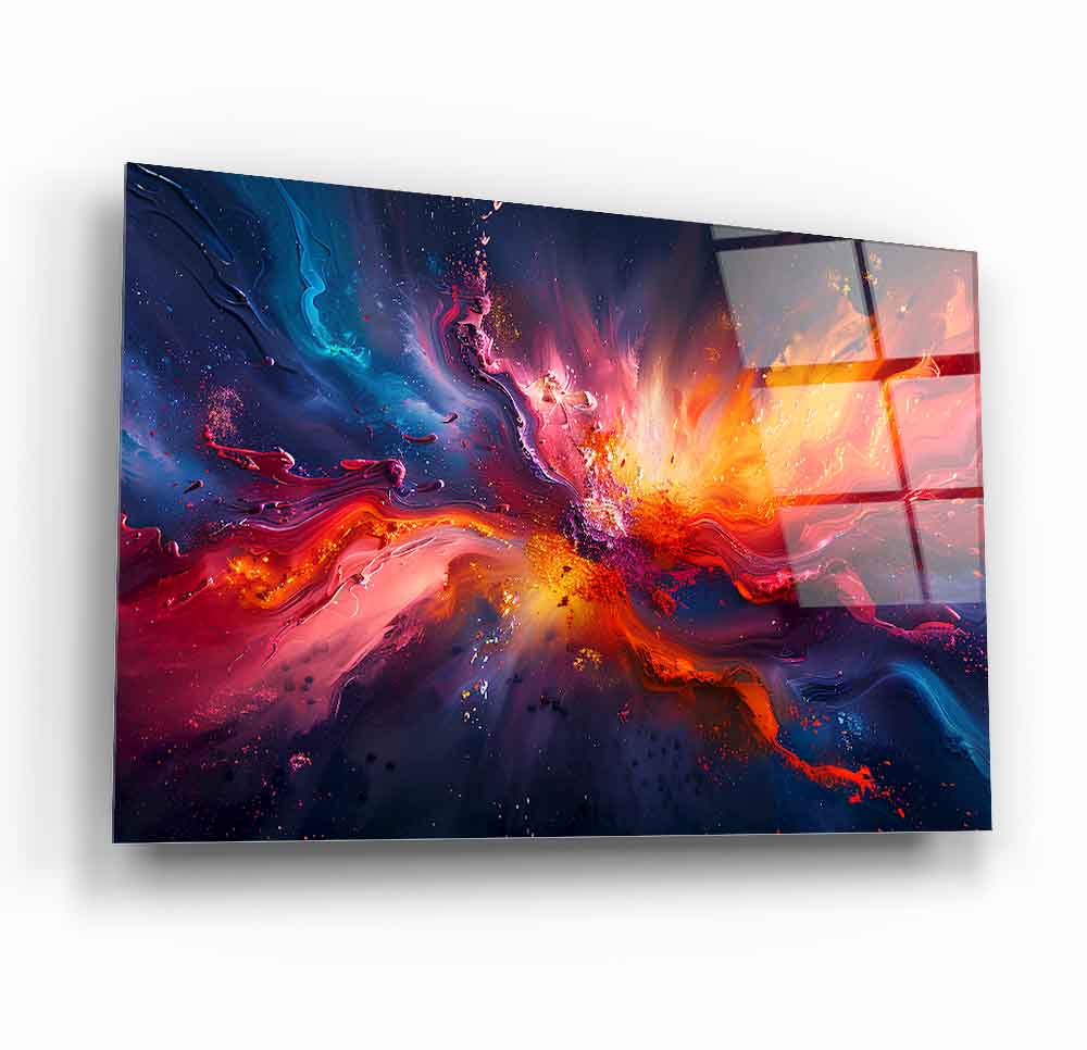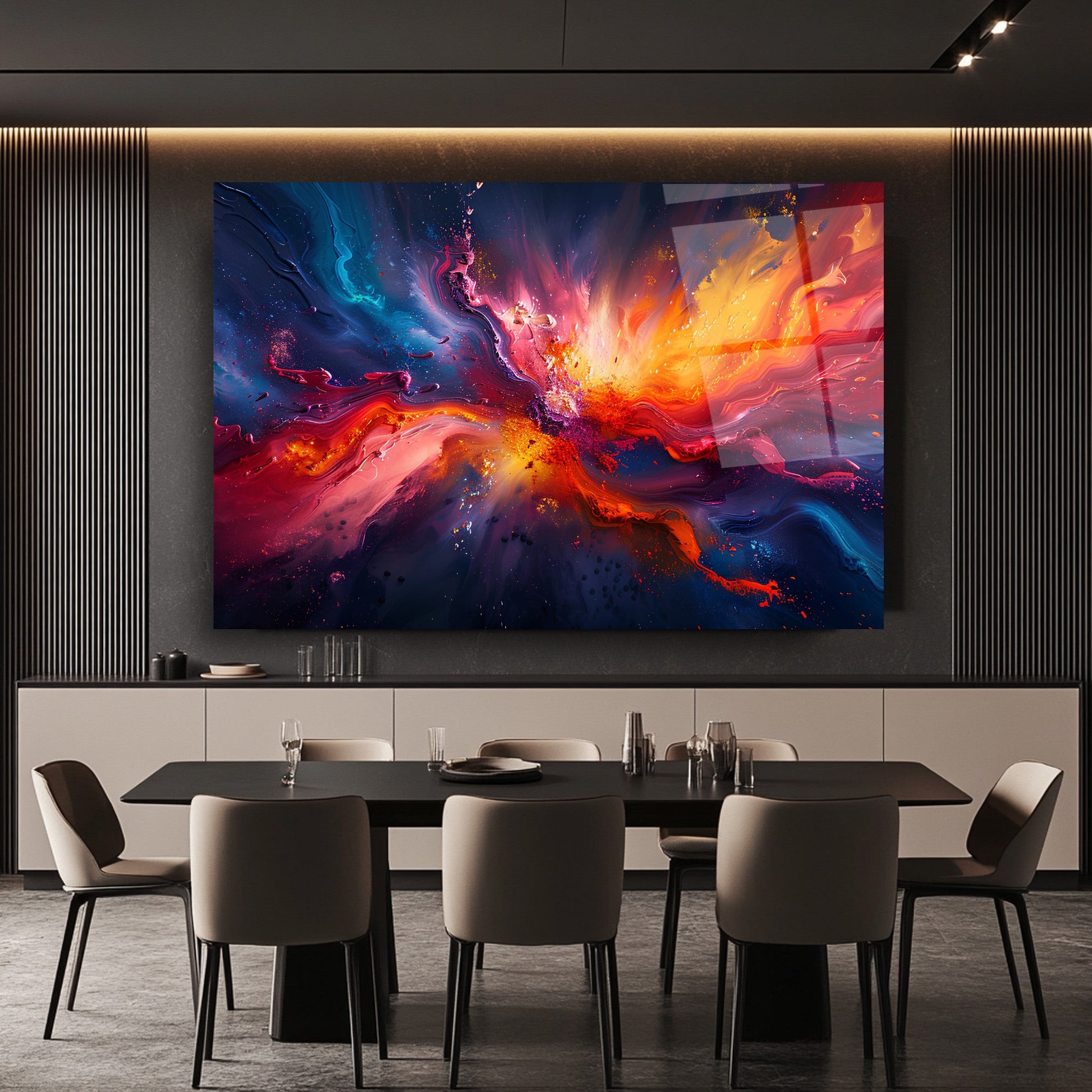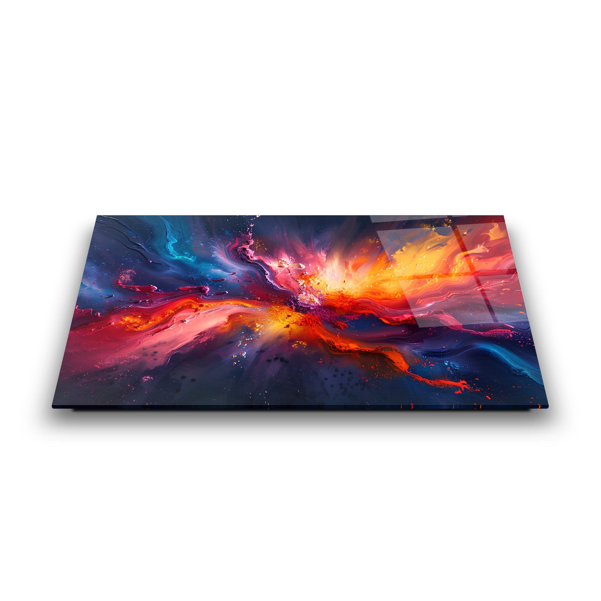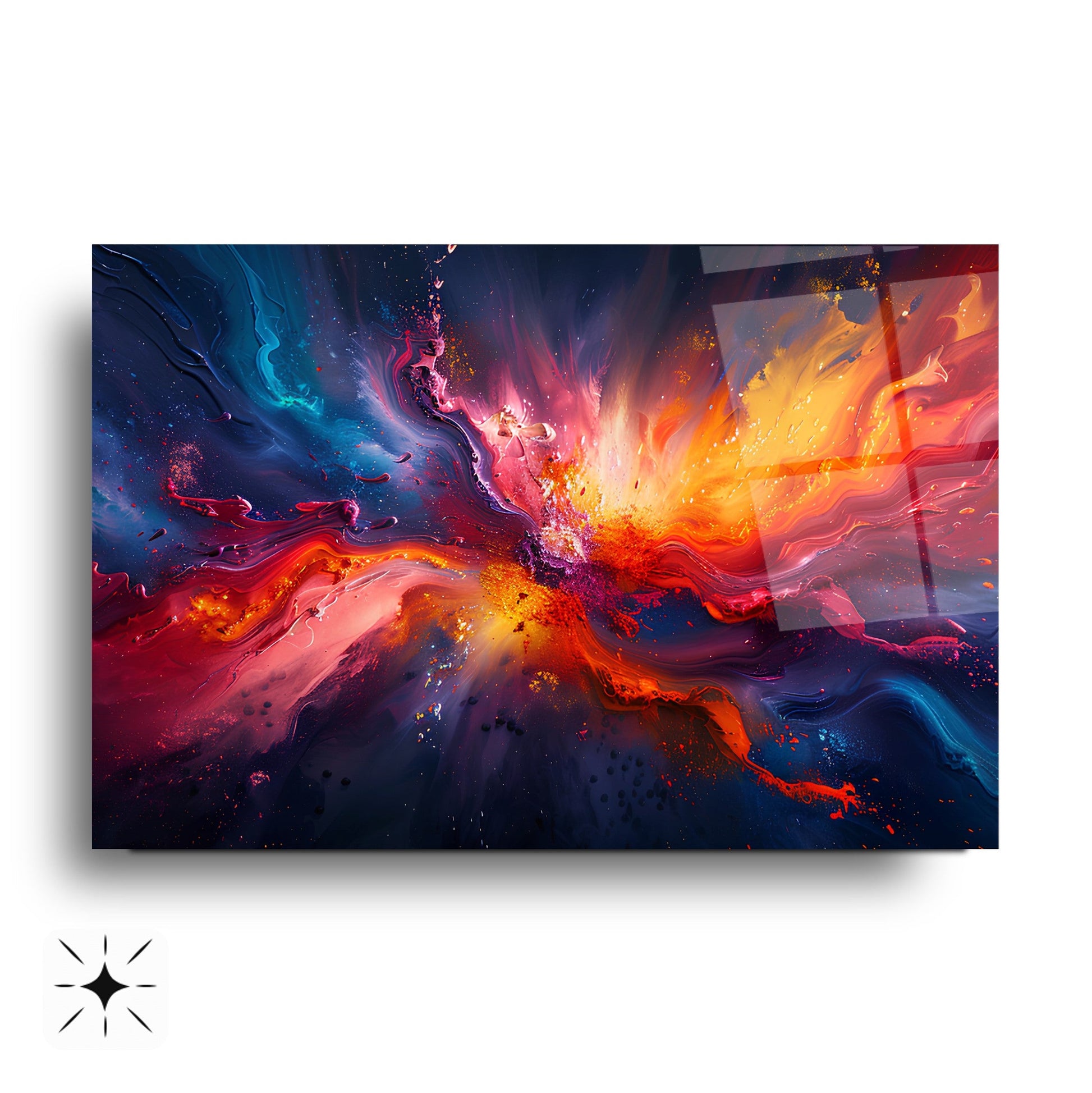 Canlı mor, sarı ve turuncu renklerin harmanlandığı soyut mermer deseni, mekânınıza enerjik ve modern bir hava katıyor. Ultra-clear temperli cam üzerine yapılan UV baskı sayesinde renkler solmadan uzun süre canlı kalır. Rodajlı kenarları güvenli kullanım sunar, dayanıklı yüzeyi ise uzun ömürlü kullanım sağlar. Çerçevesiz modern tasarımıyla salon, yatak odası veya ofis gibi alanlarda dikkat çekici ve şık bir dekorasyon seçeneğidir.
