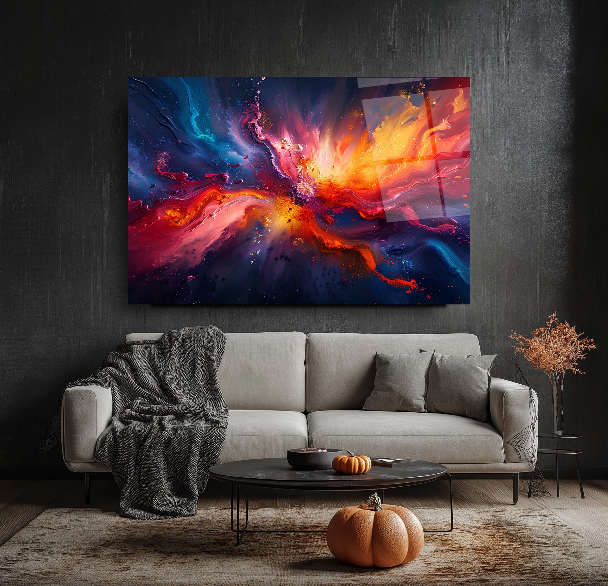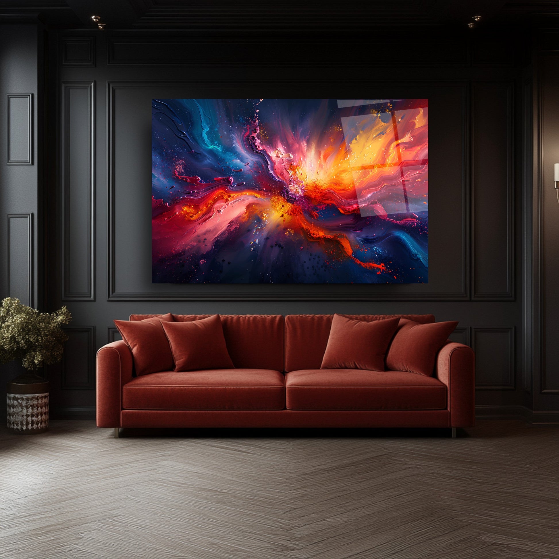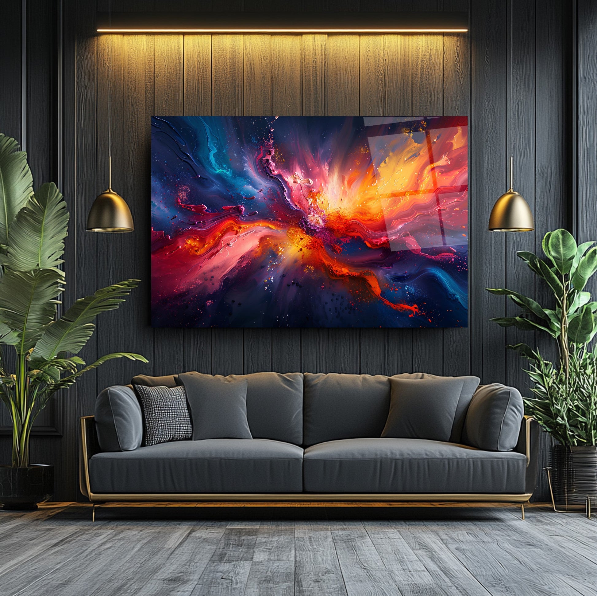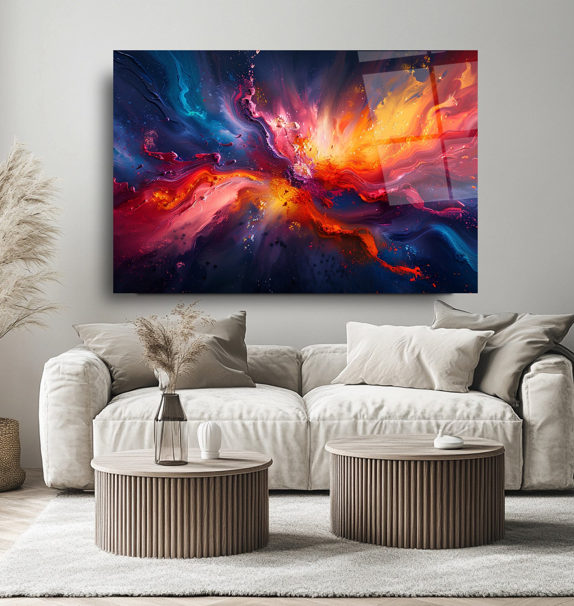 Canlı mor, sarı ve turuncu renklerin harmanlandığı soyut mermer deseni, mekânınıza enerjik ve modern bir hava katıyor. Ultra-clear temperli cam üzerine yapılan UV baskı sayesinde renkler solmadan uzun süre canlı kalır. Rodajlı kenarları güvenli kullanım sunar, dayanıklı yüzeyi ise uzun ömürlü kullanım sağlar. Çerçevesiz modern tasarımıyla salon, yatak odası veya ofis gibi alanlarda dikkat çekici ve şık bir dekorasyon seçeneğidir.