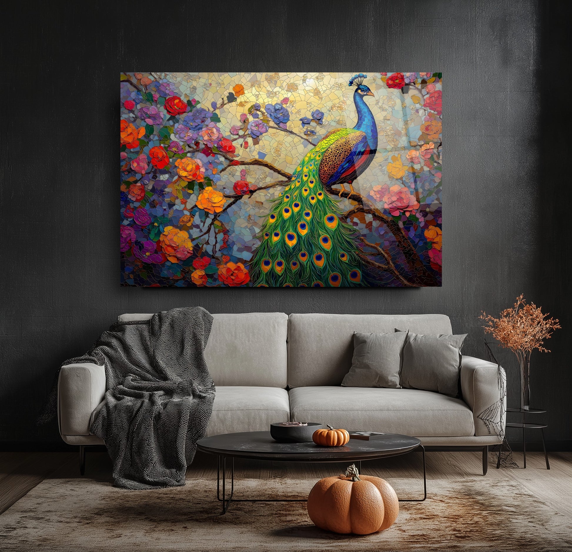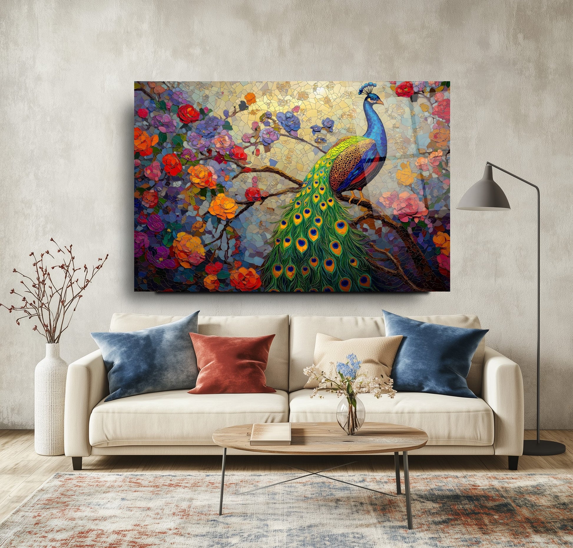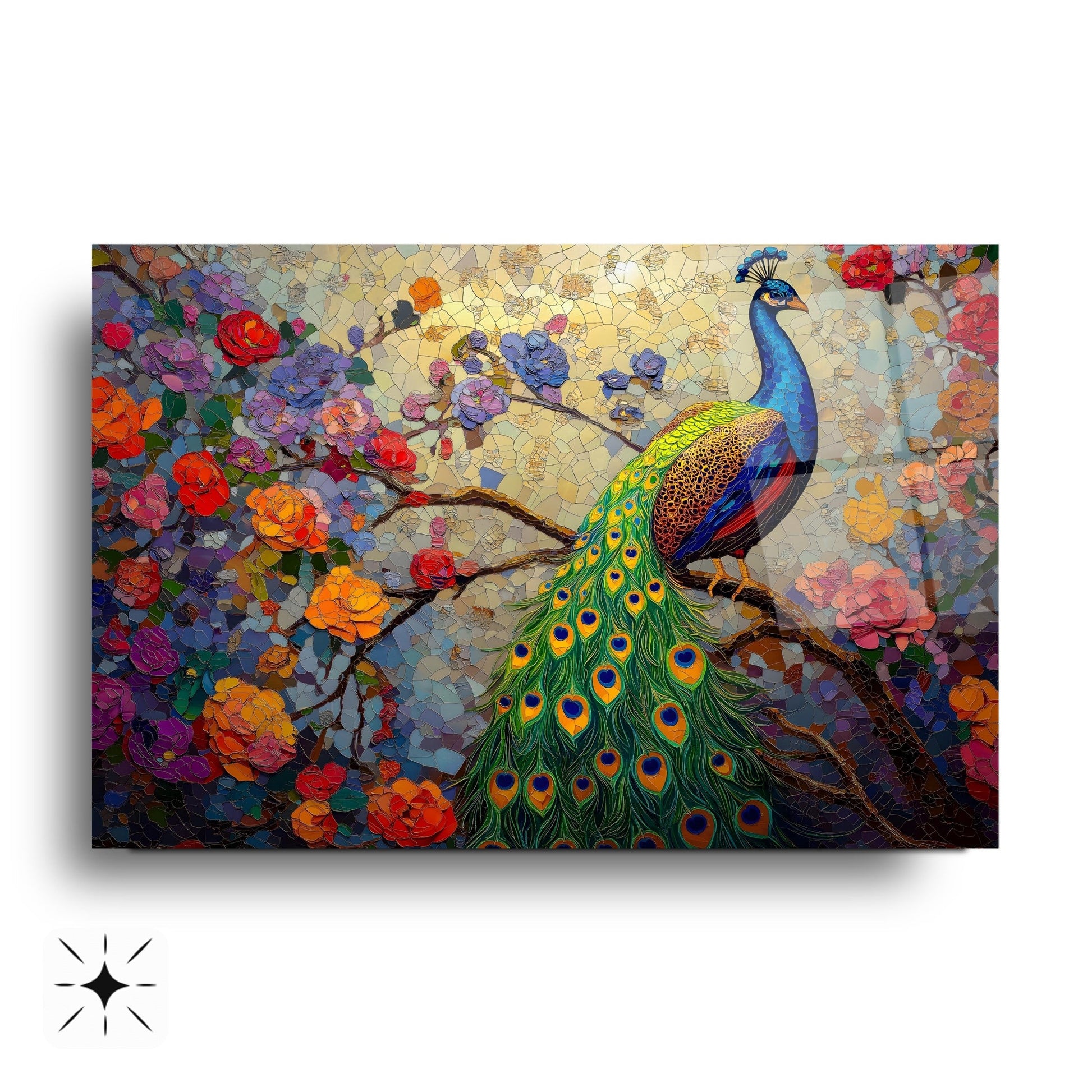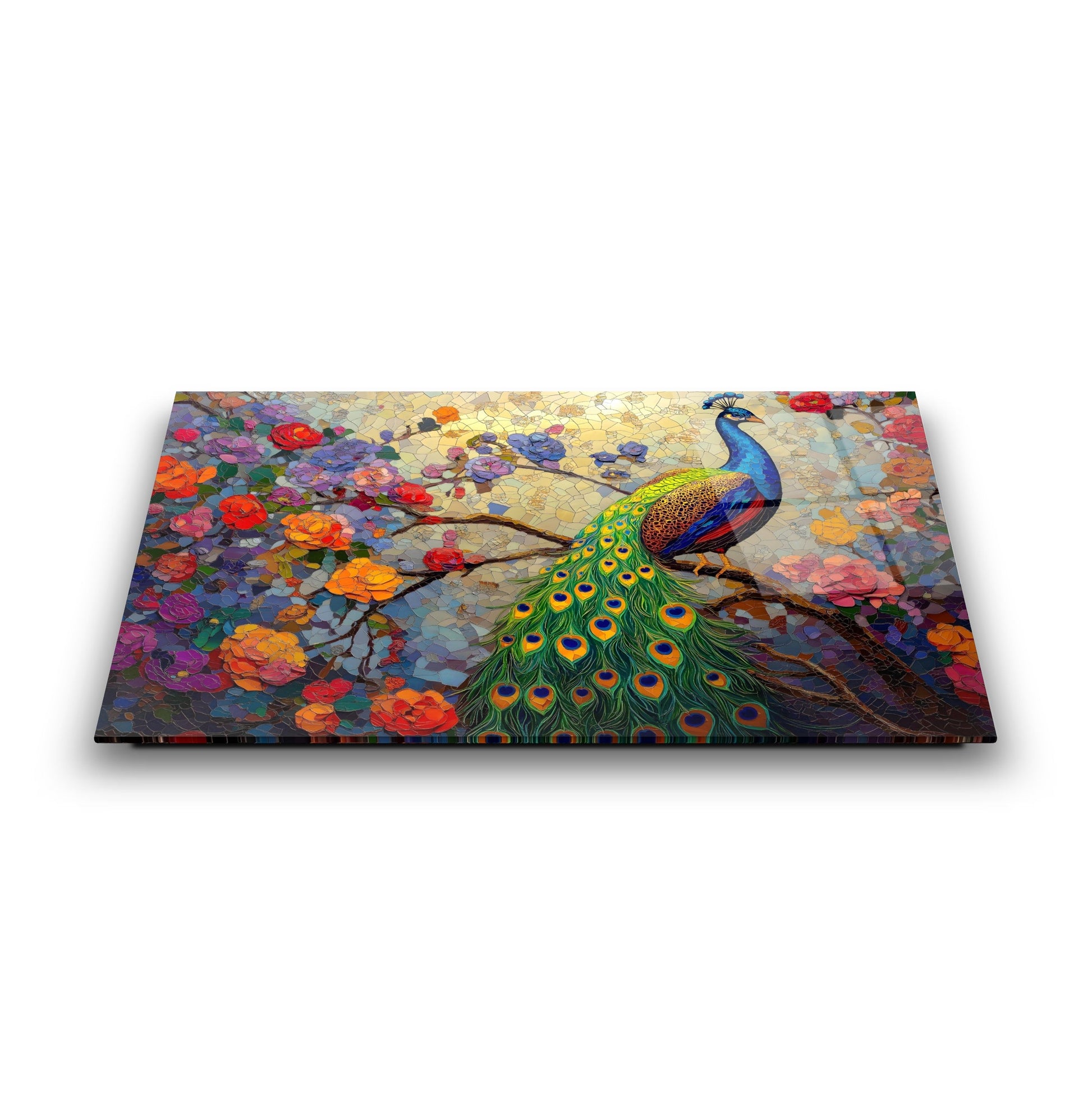 Zarif çiçek dalları ve etkileyici tavus kuşu figürünün mozaik desenle birleşimiyle tasarlanmış bu tablo, mekânınıza sanatsal bir dokunuş katıyor. Canlı renkler ve detaylı işçilik, özellikle oturma odası, salon veya ofis gibi alanlarda dikkat çekici bir atmosfer yaratır. UV baskı teknolojisi sayesinde renkler uzun süre canlı kalır, temperli cam ise hem estetik hem de güvenlik açısından üstün bir kalite sunar. Çerçevesiz tasarımıyla her dekor stiline uyum sağlar, montajı ise oldukça kolaydır. Bu tablo, mozaik desenli cam tablo, tavus kuşu figürlü duvar dekoru ve modern cam baskı arayanlar için ideal bir tercihtir.