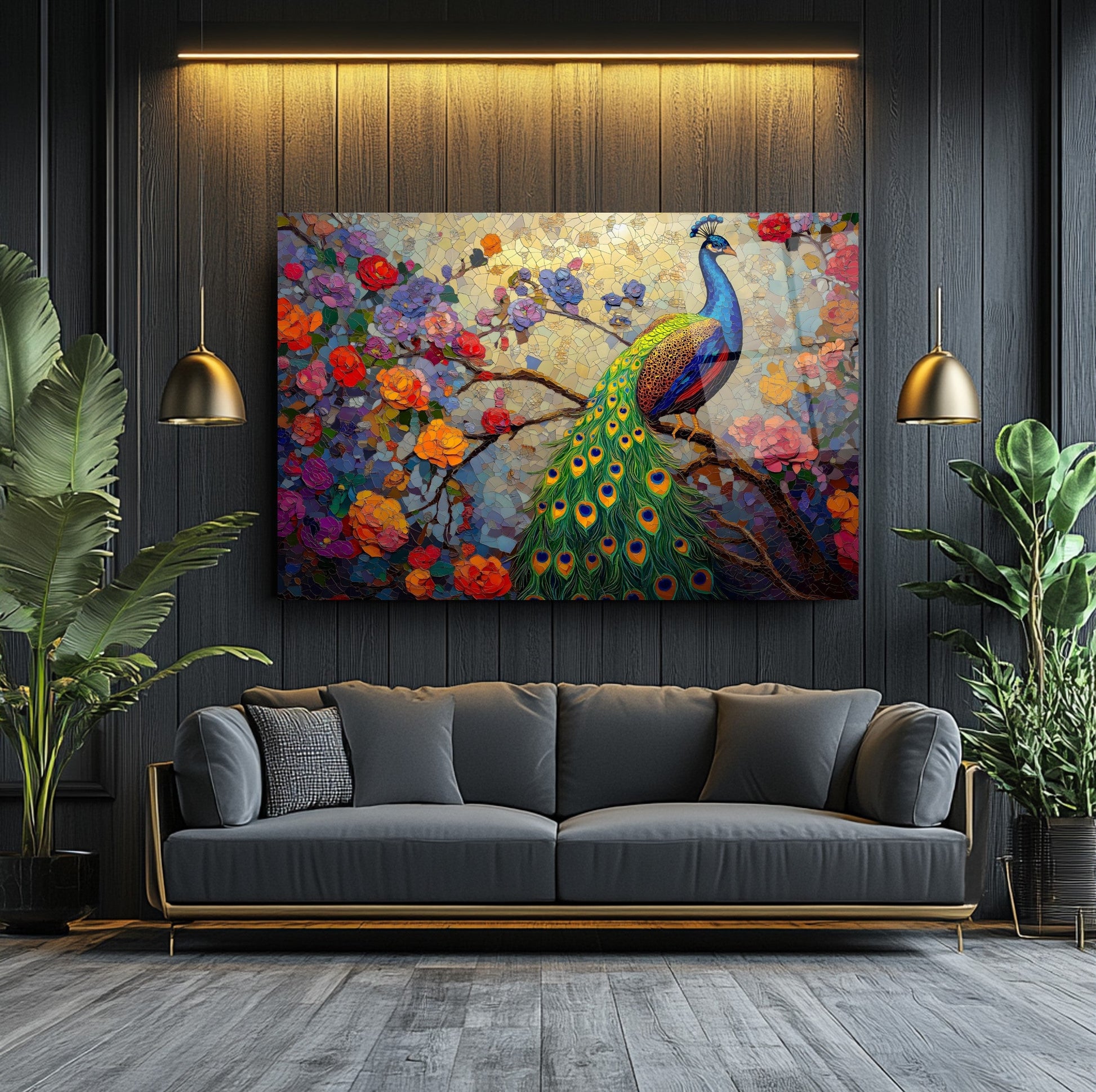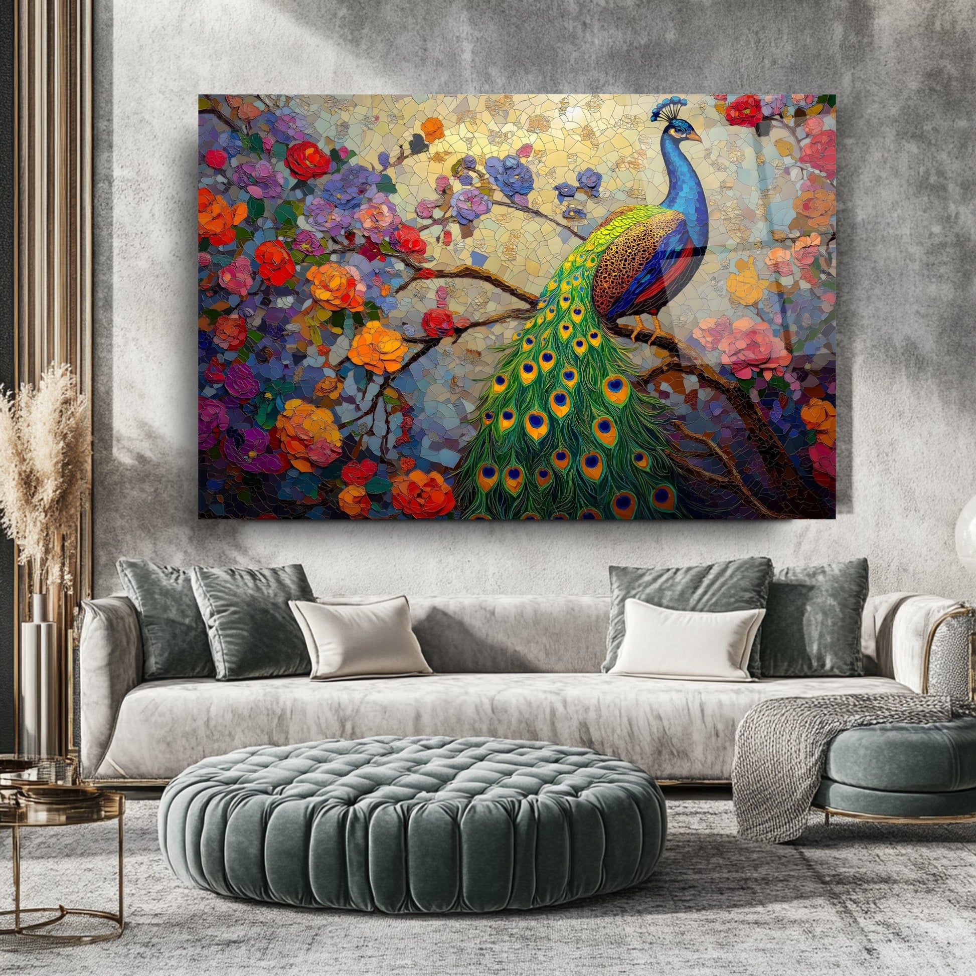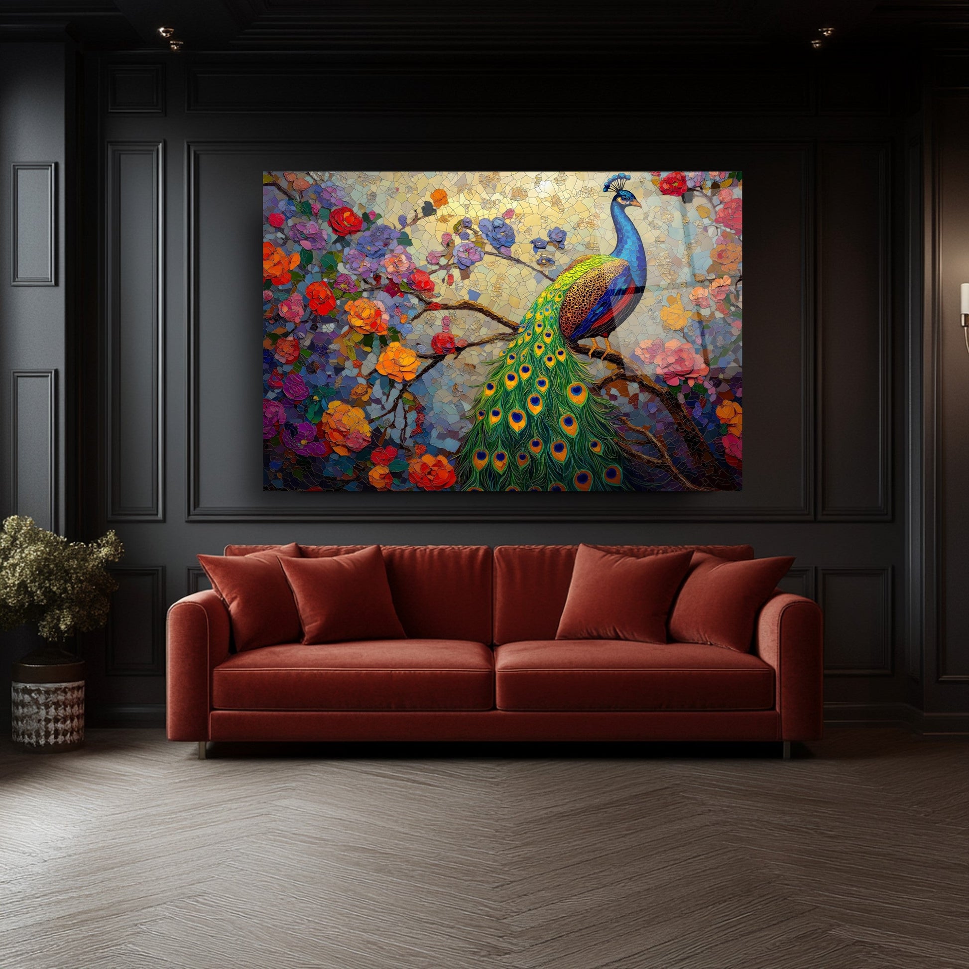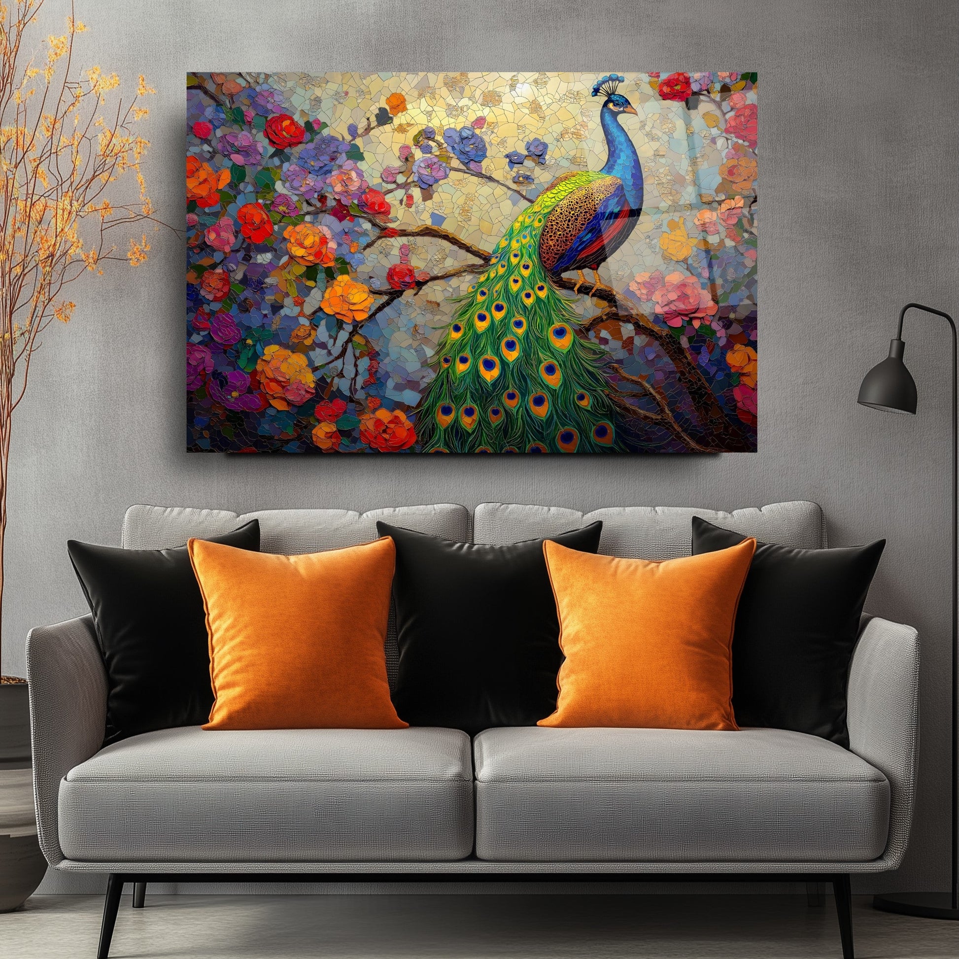 Zarif çiçek dalları ve etkileyici tavus kuşu figürünün mozaik desenle birleşimiyle tasarlanmış bu tablo, mekânınıza sanatsal bir dokunuş katıyor. Canlı renkler ve detaylı işçilik, özellikle oturma odası, salon veya ofis gibi alanlarda dikkat çekici bir atmosfer yaratır. UV baskı teknolojisi sayesinde renkler uzun süre canlı kalır, temperli cam ise hem estetik hem de güvenlik açısından üstün bir kalite sunar. Çerçevesiz tasarımıyla her dekor stiline uyum sağlar, montajı ise oldukça kolaydır. Bu tablo, mozaik desenli cam tablo, tavus kuşu figürlü duvar dekoru ve modern cam baskı arayanlar için ideal bir tercihtir.