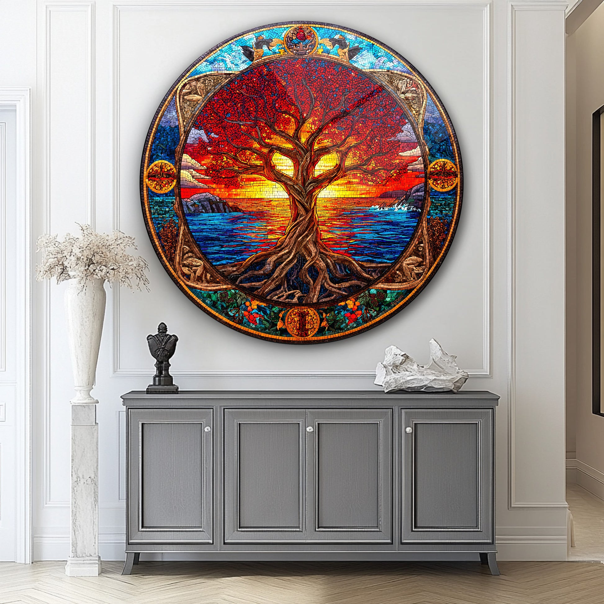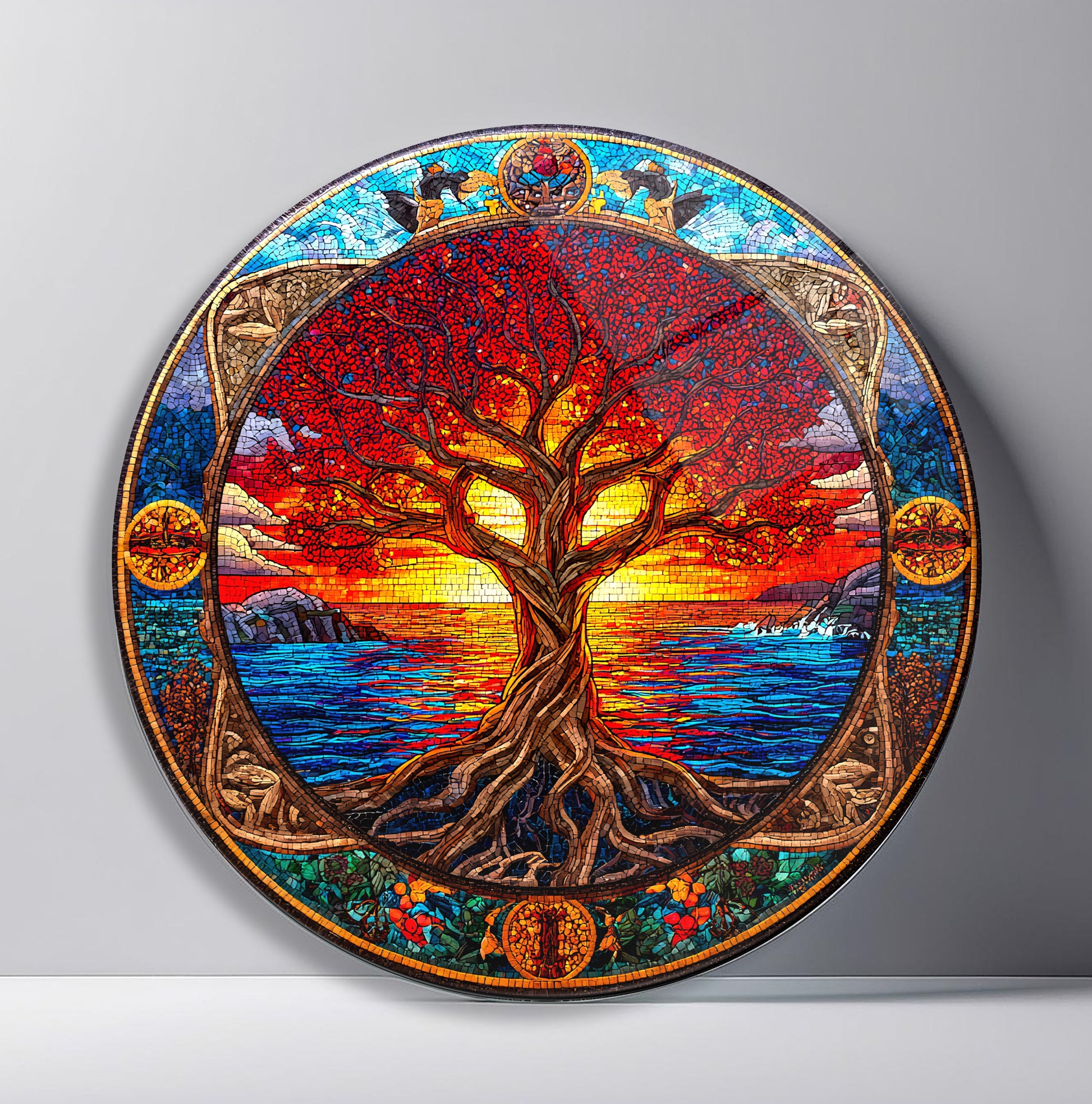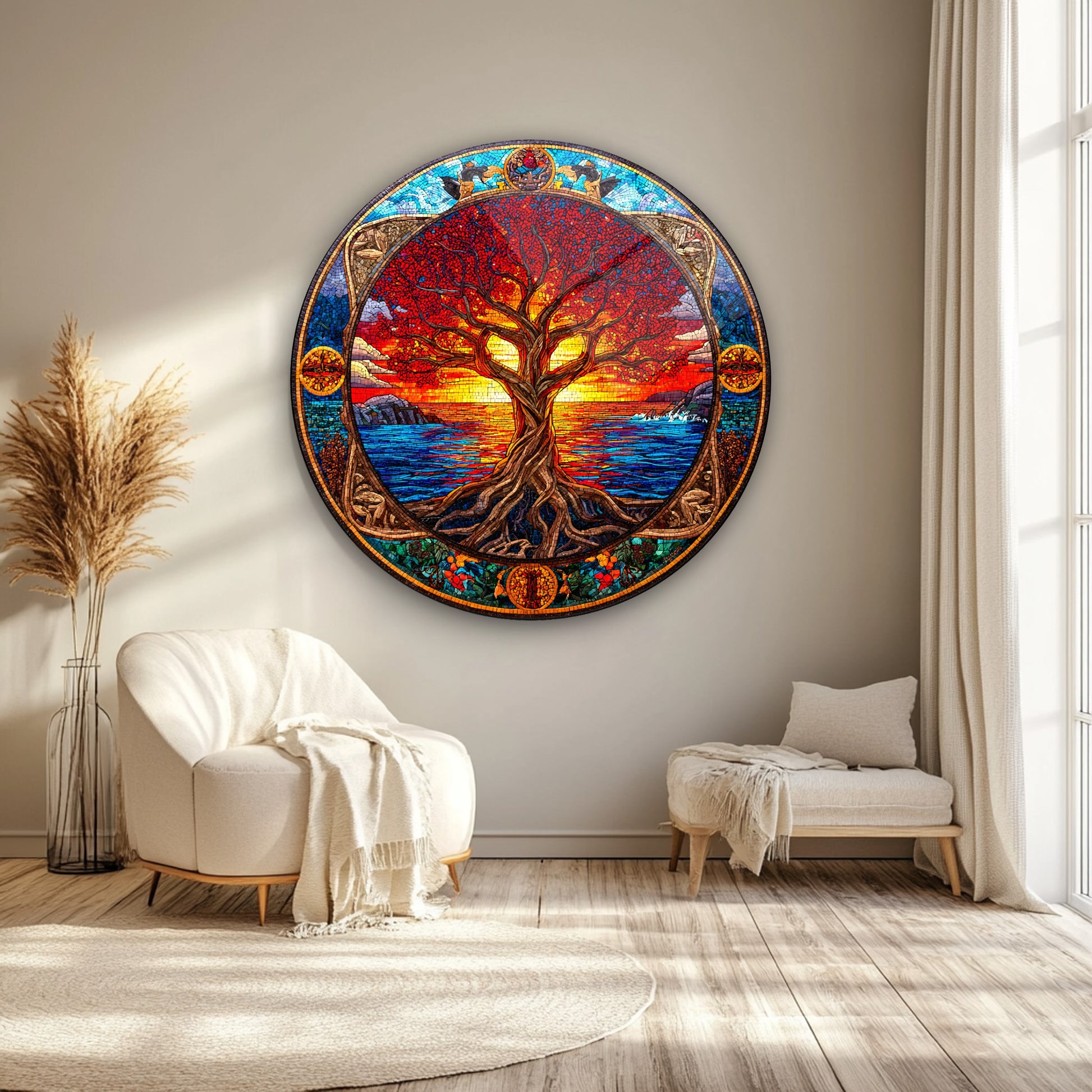 Mozaik Desen Renkli Hayat Ağacı Yuvarlak Cam Tablo