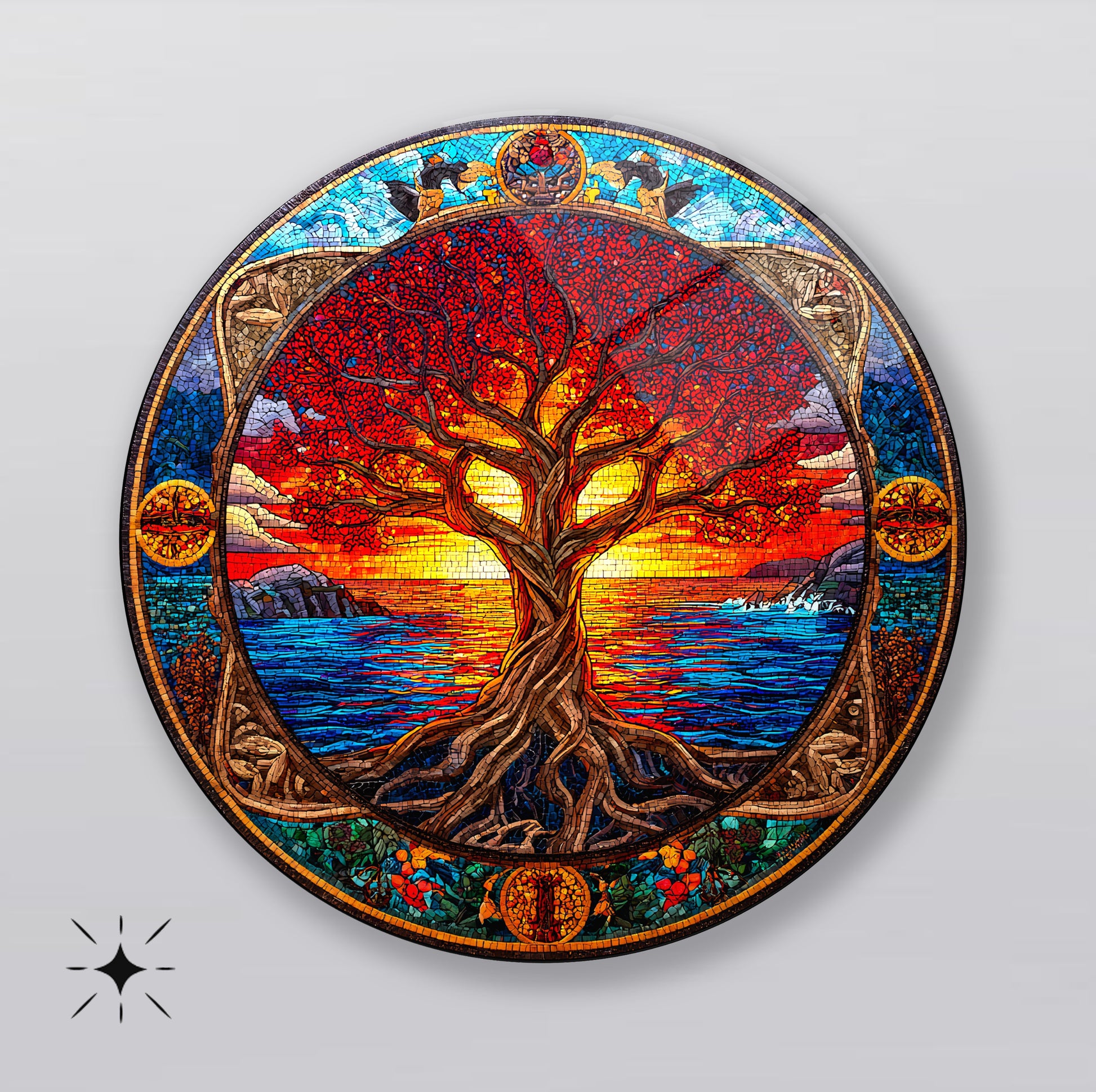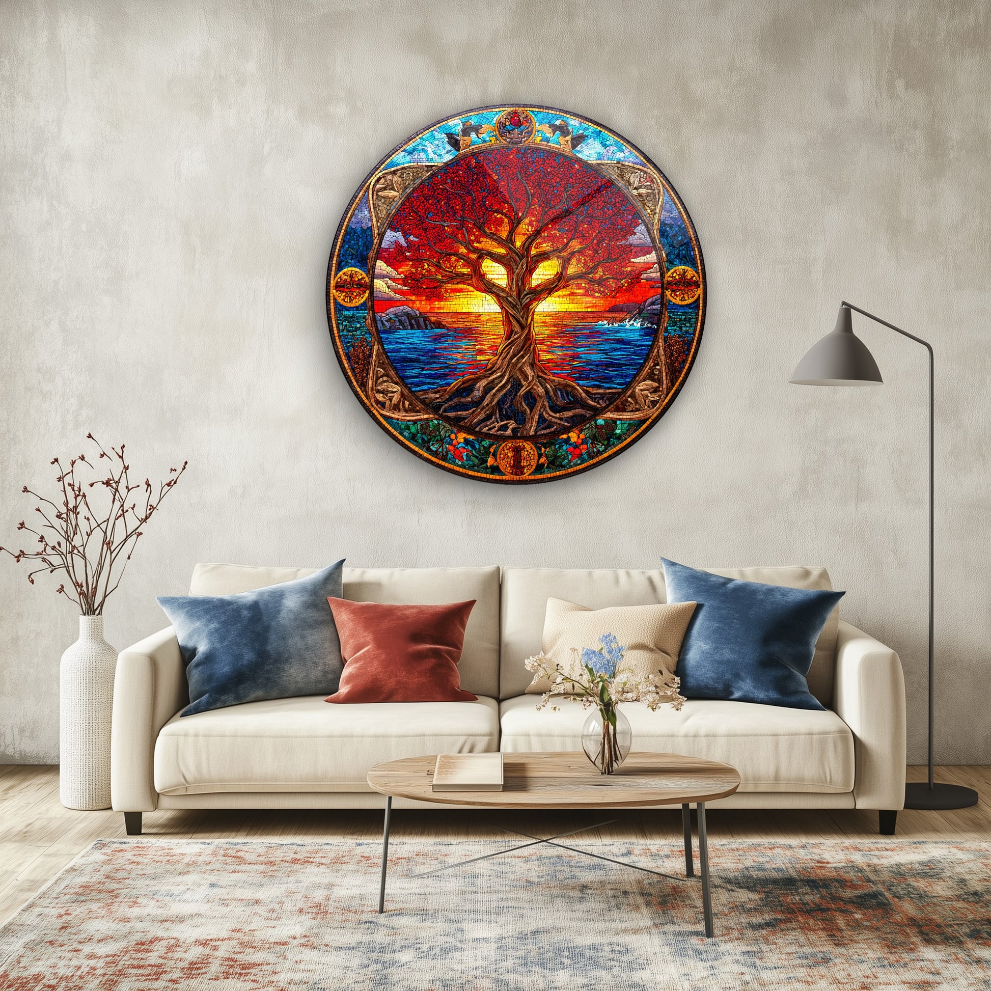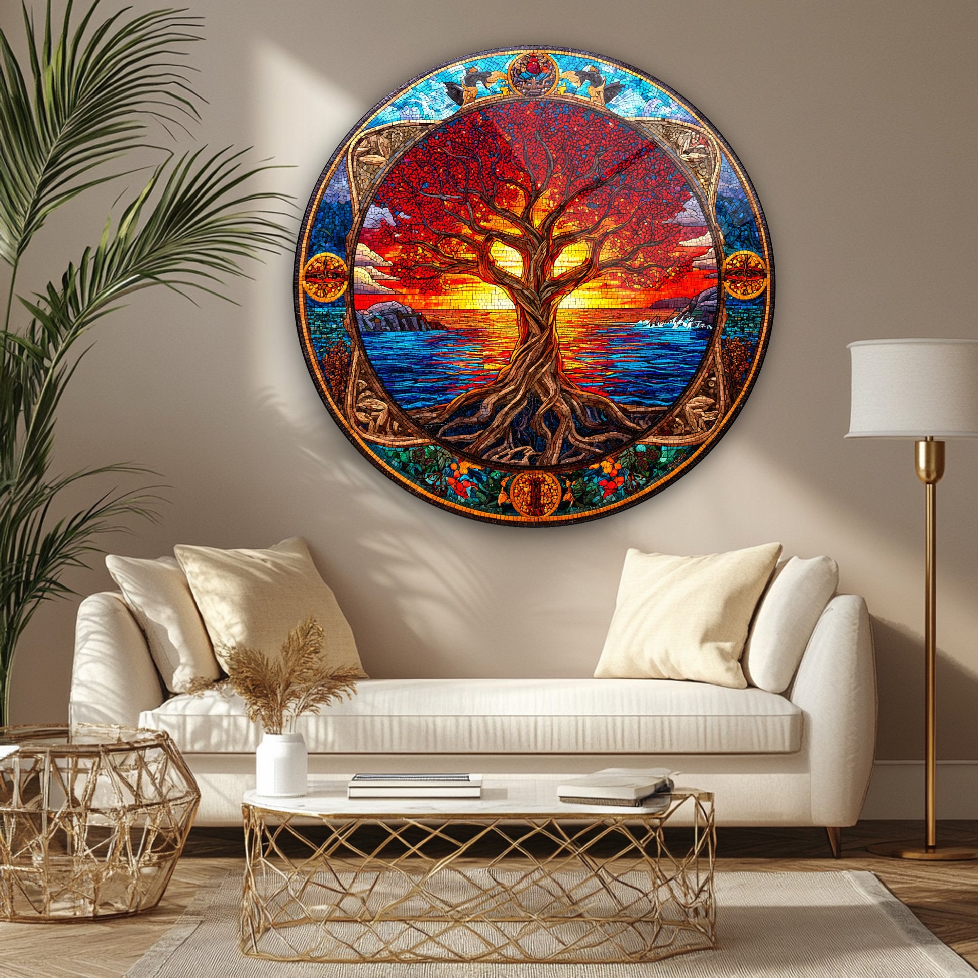 Mozaik Desen Renkli Hayat Ağacı Yuvarlak Cam Tablo