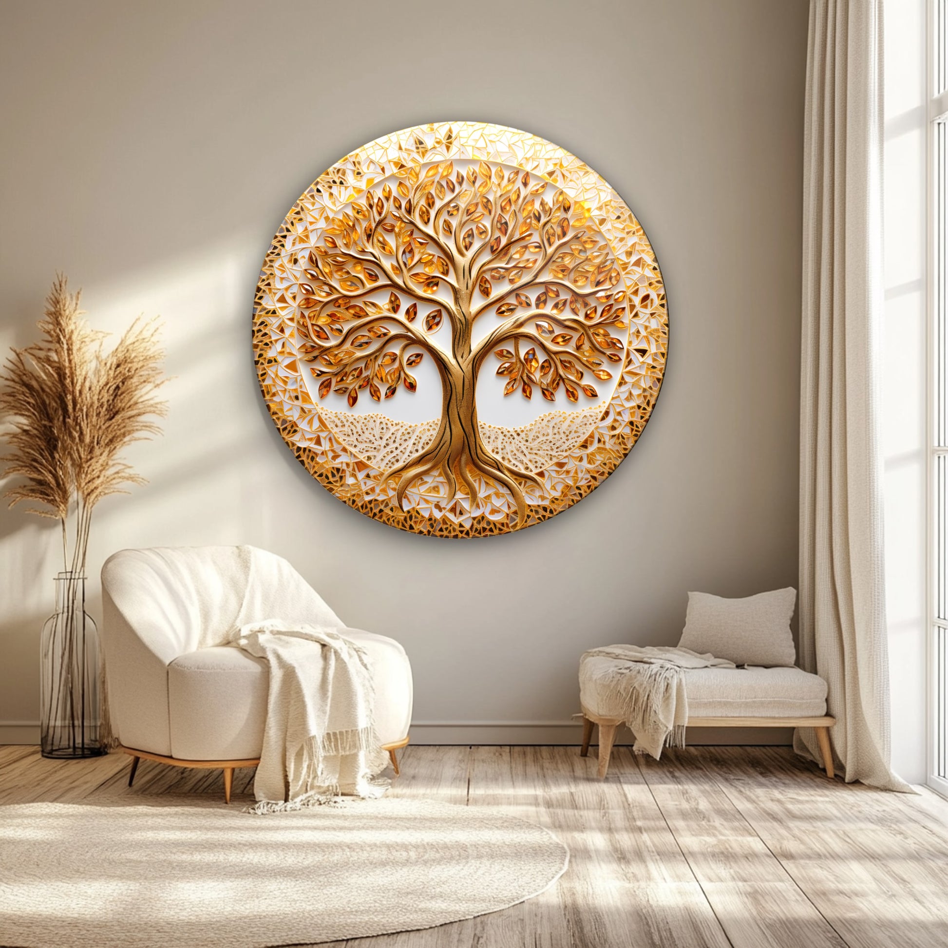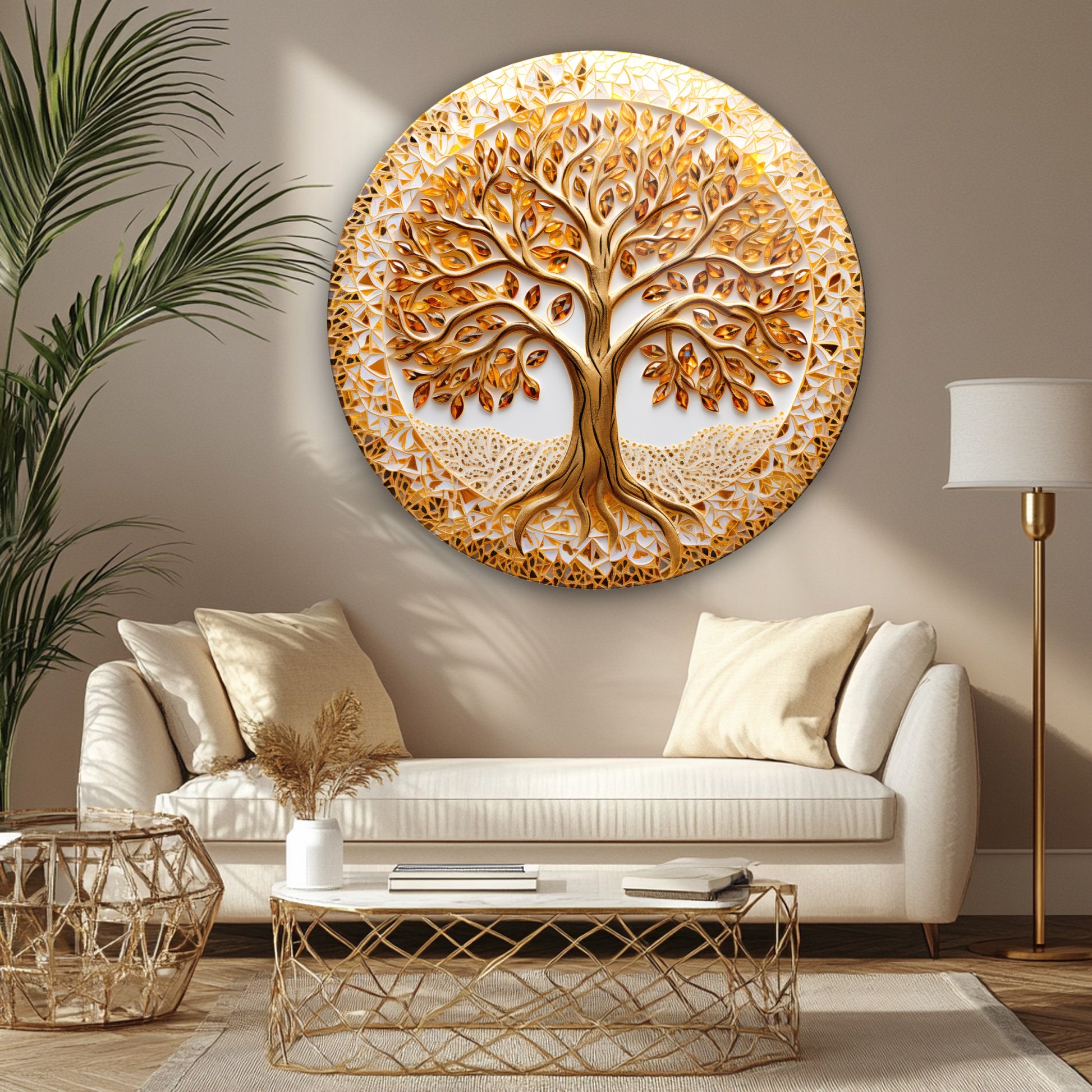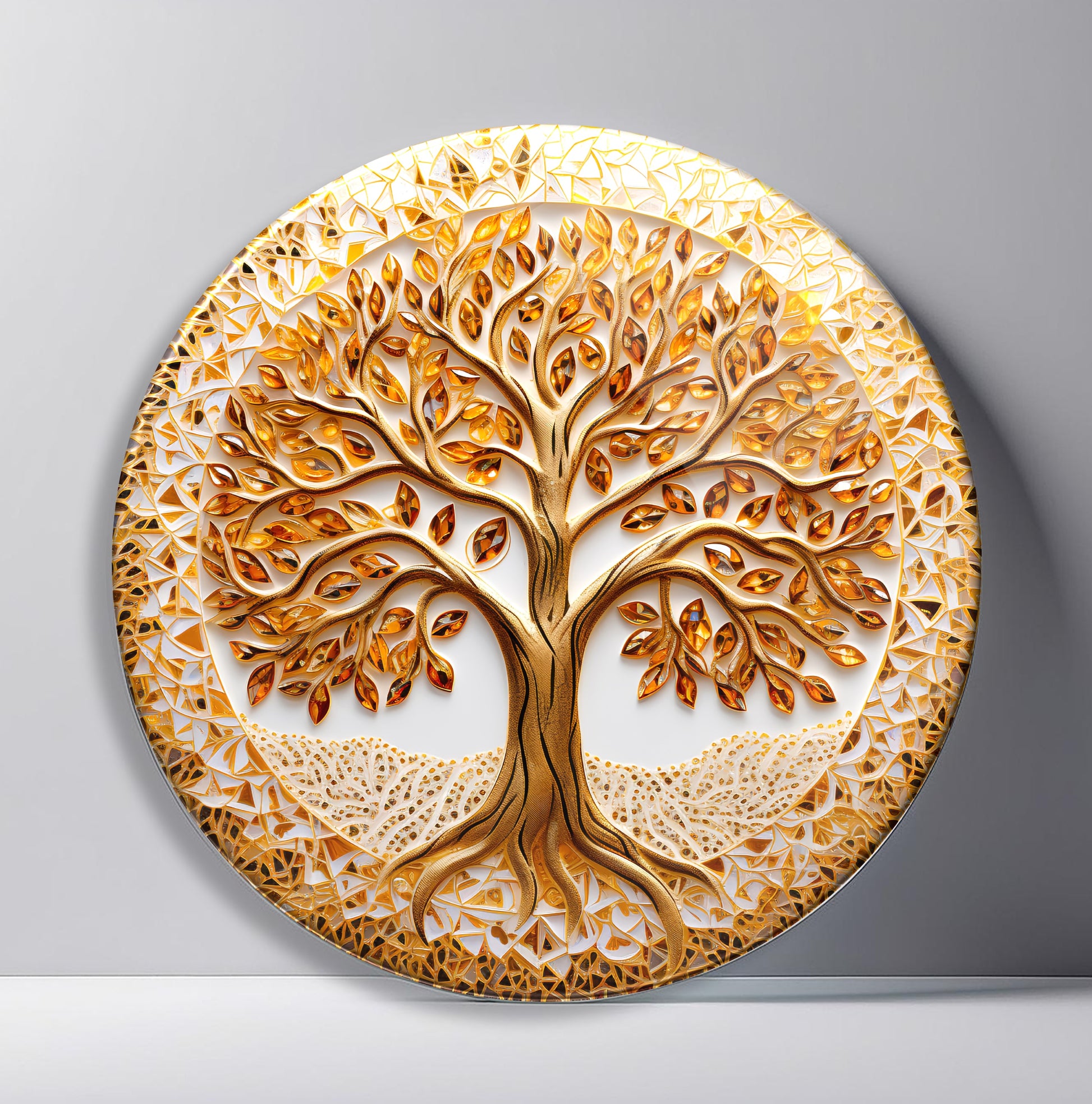 Gold Hayat Ağacı Yuvarlak Cam Tablo