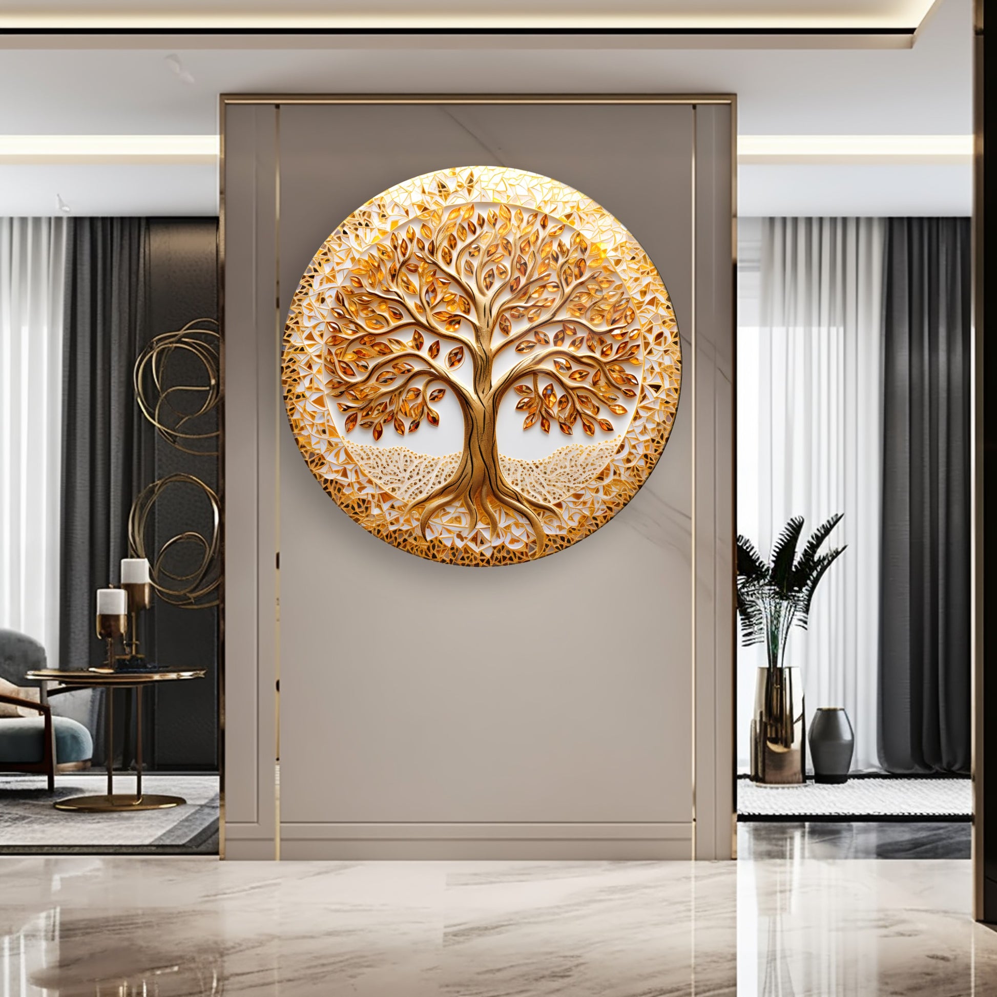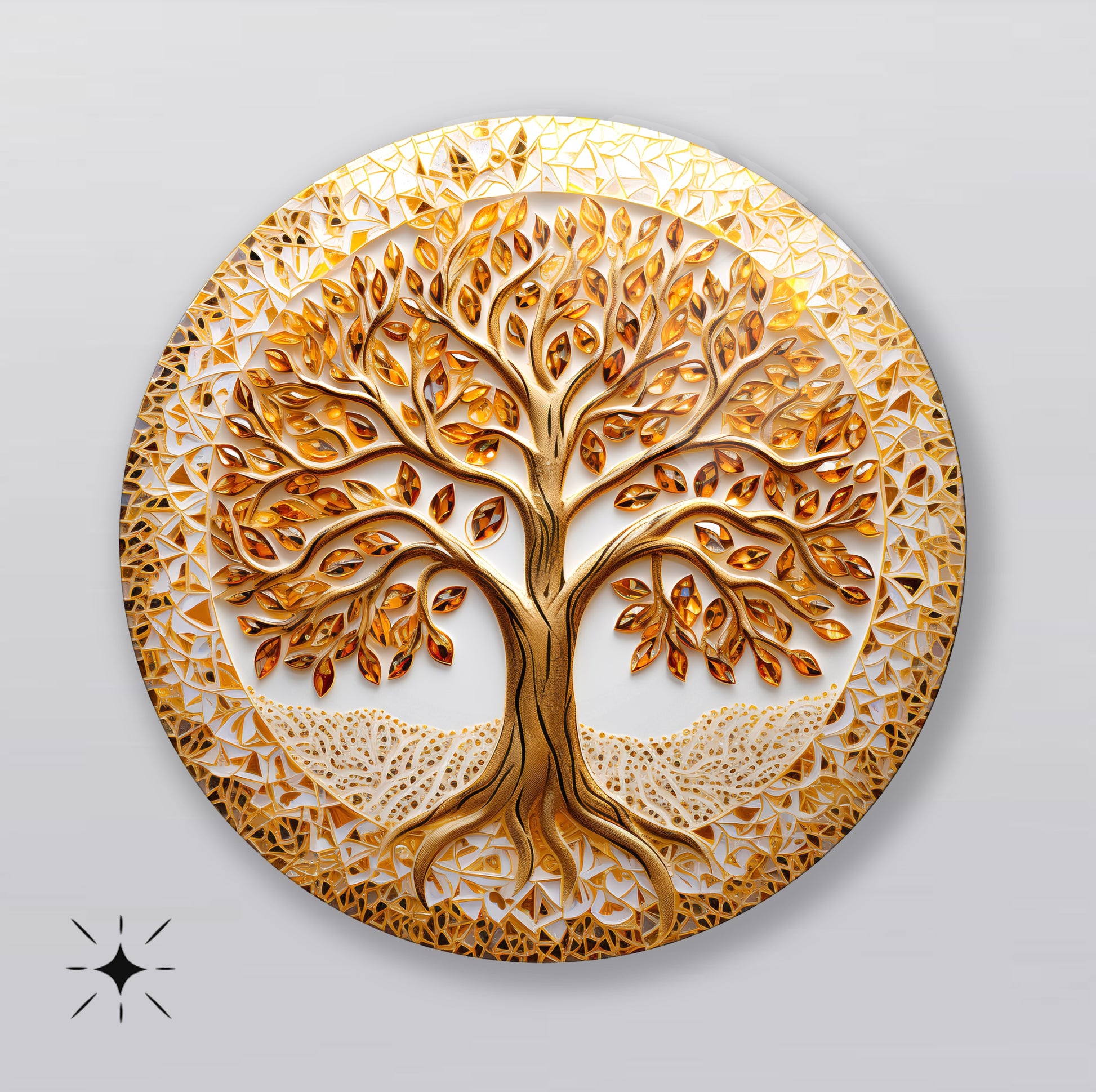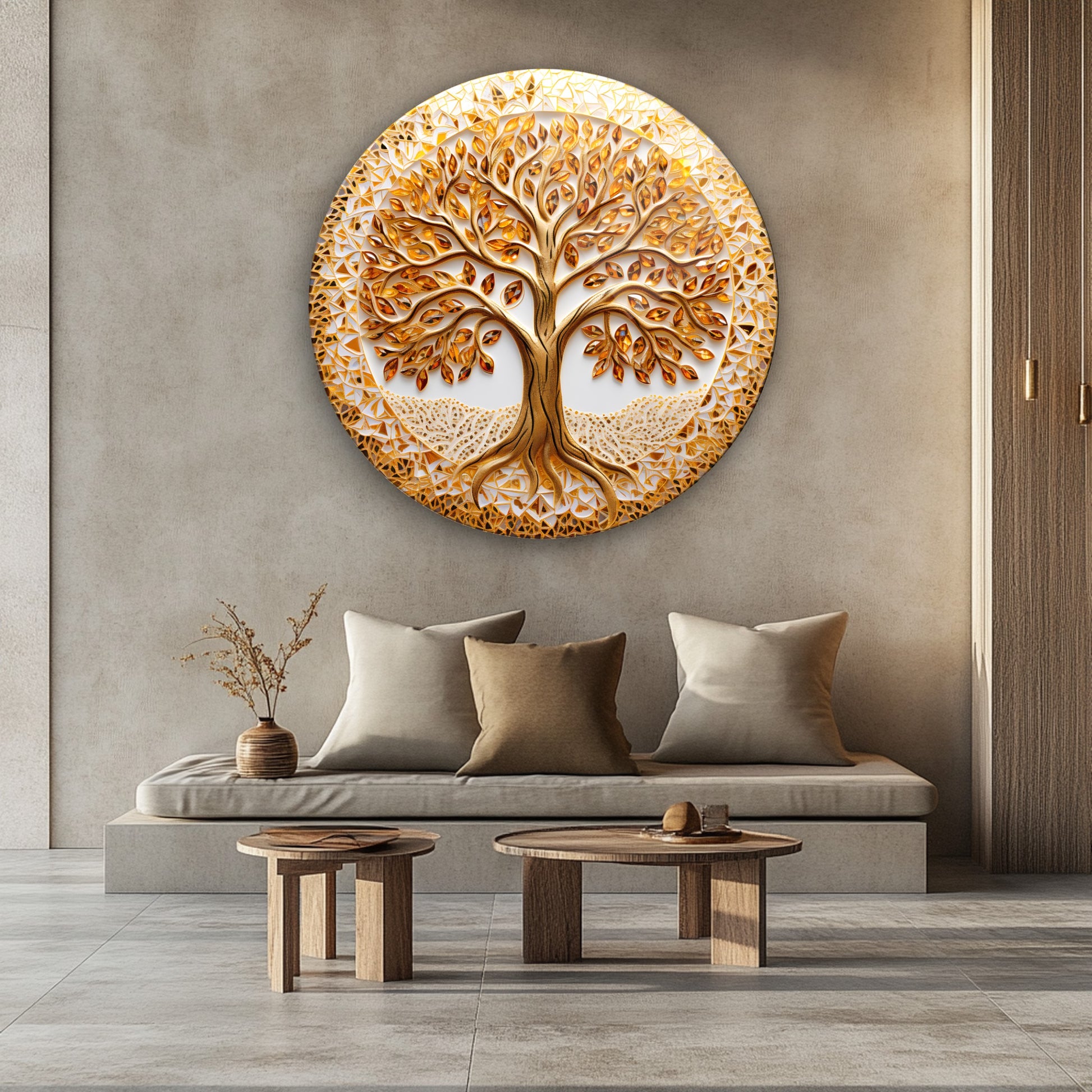 Gold Hayat Ağacı Yuvarlak Cam Tablo