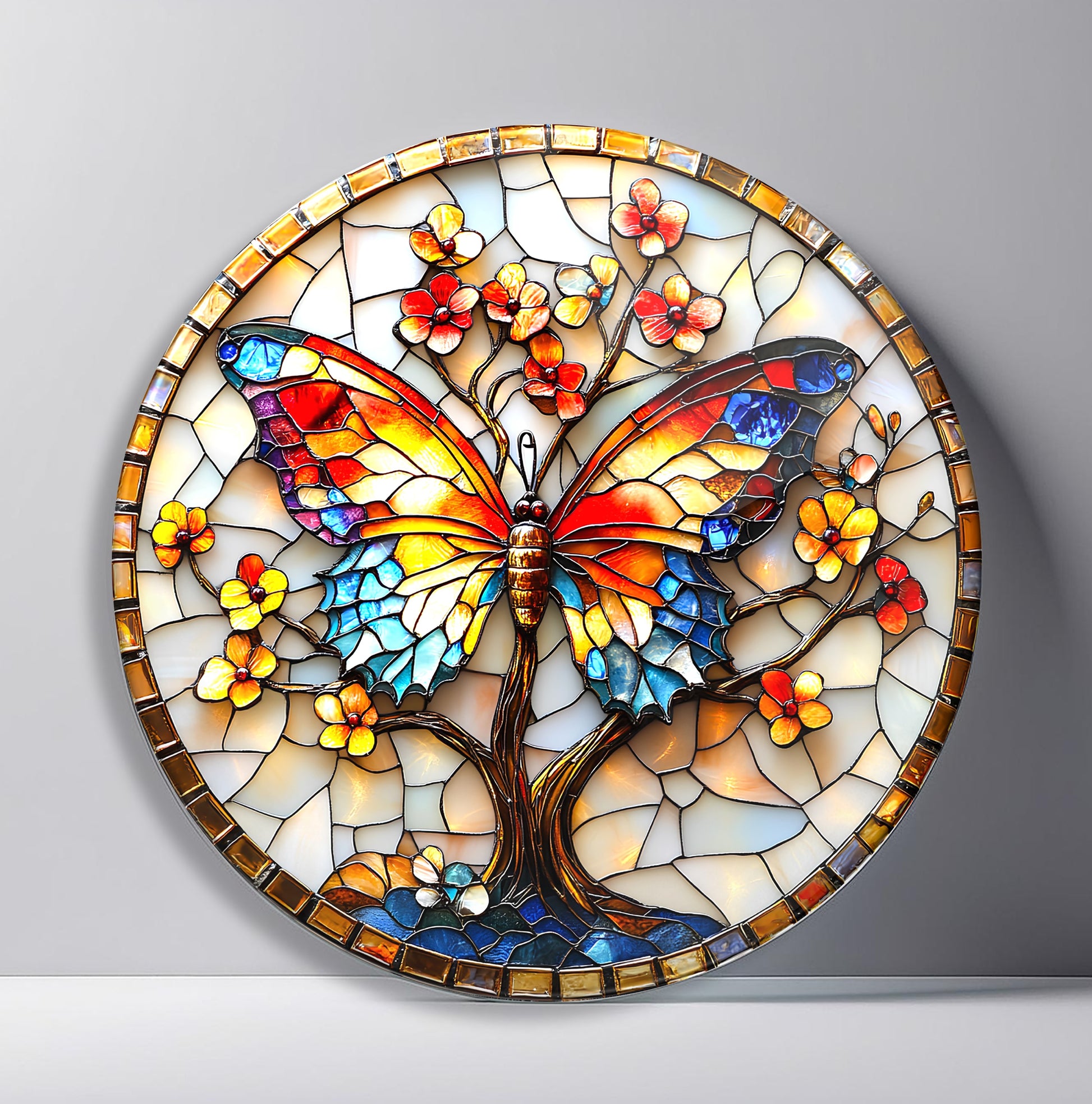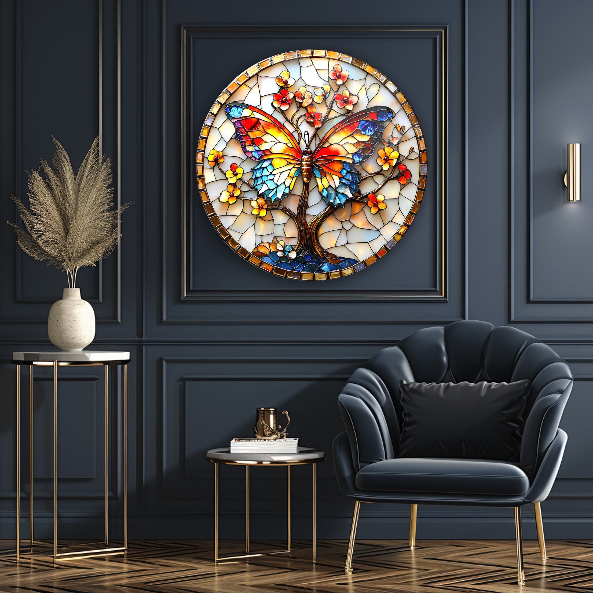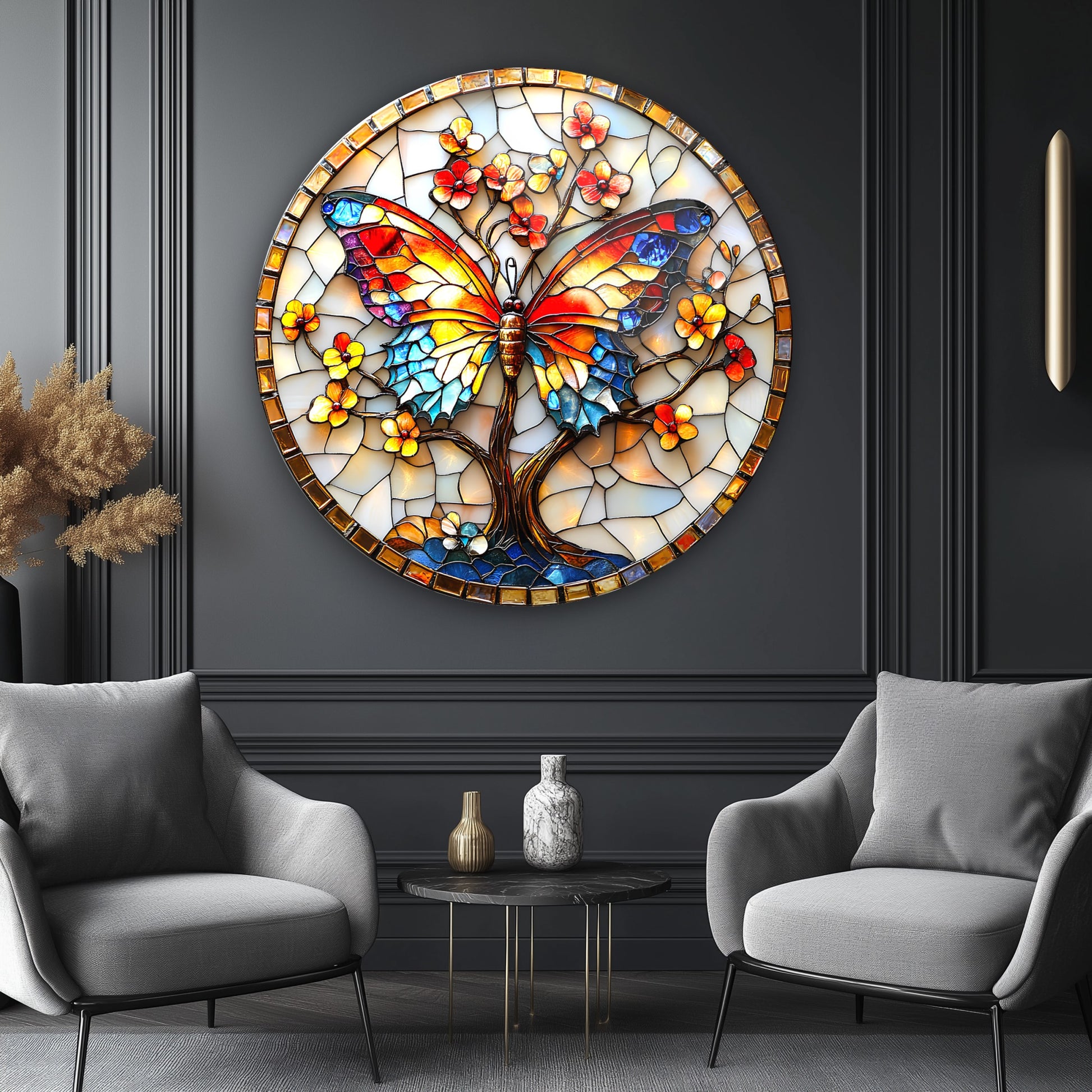 Mozaik Desen Renkli Kelebek Yuvarlak Cam Tablo