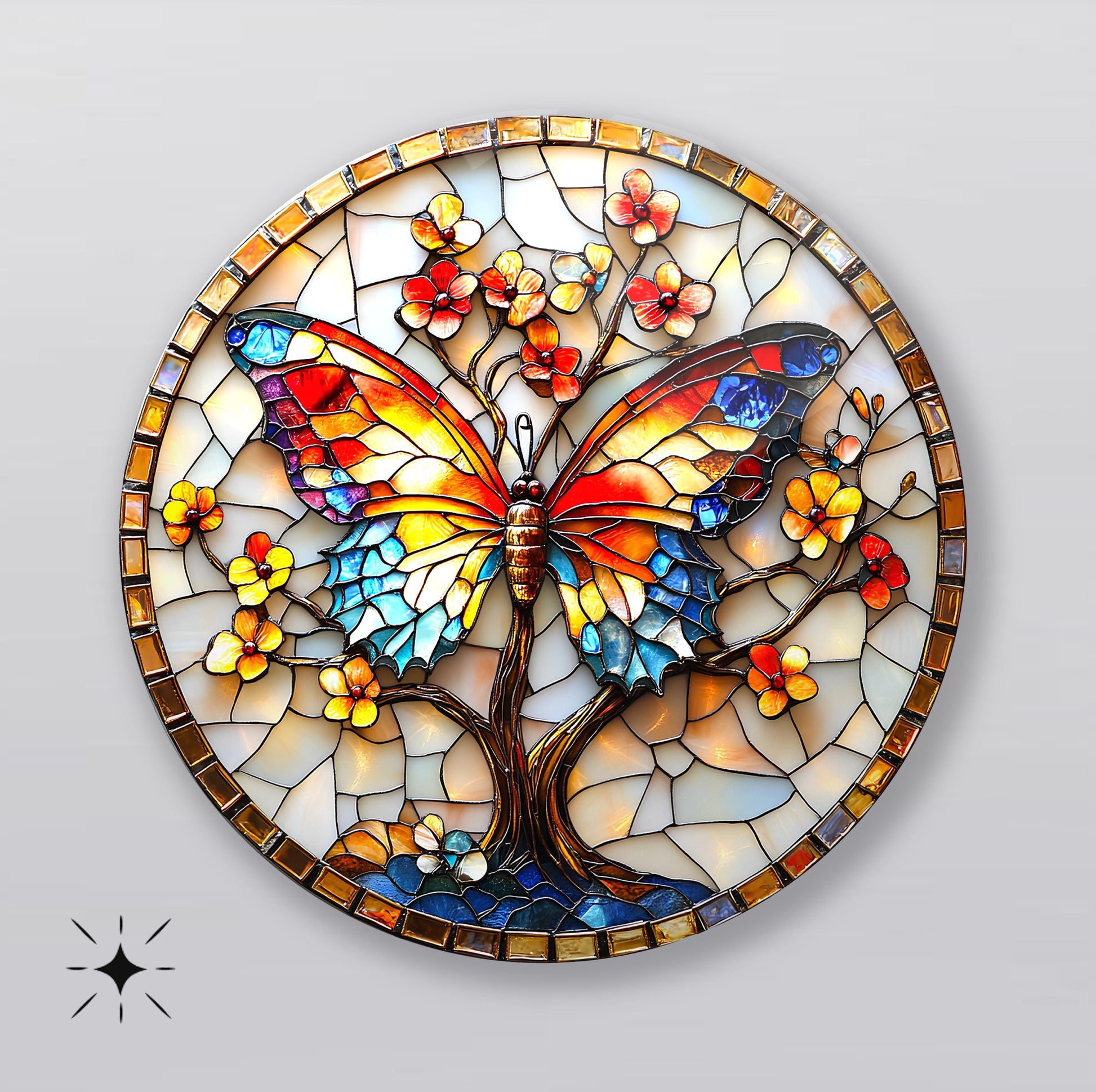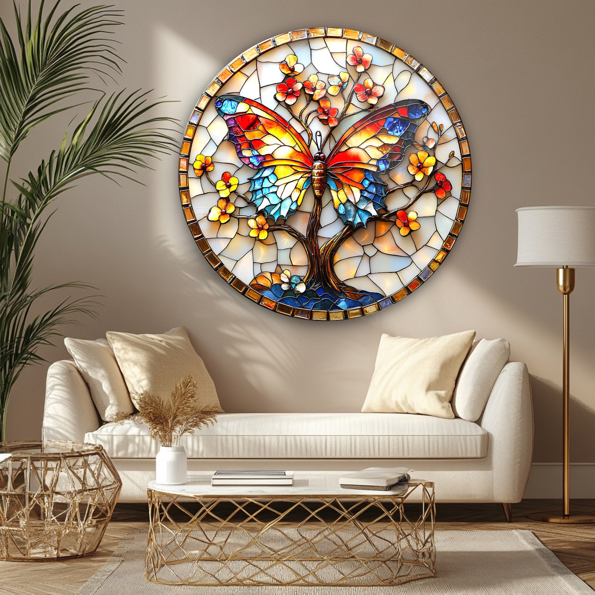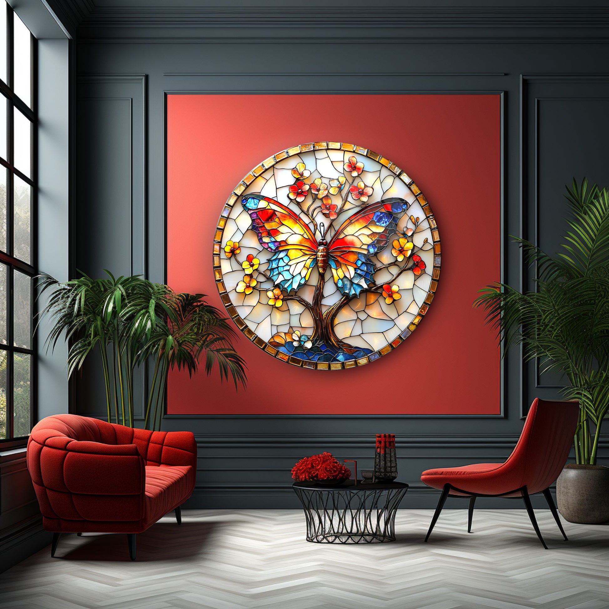 Mozaik Desen Renkli Kelebek Yuvarlak Cam Tablo