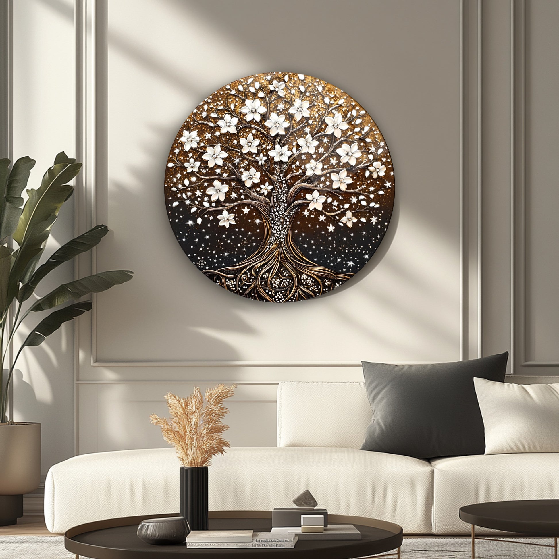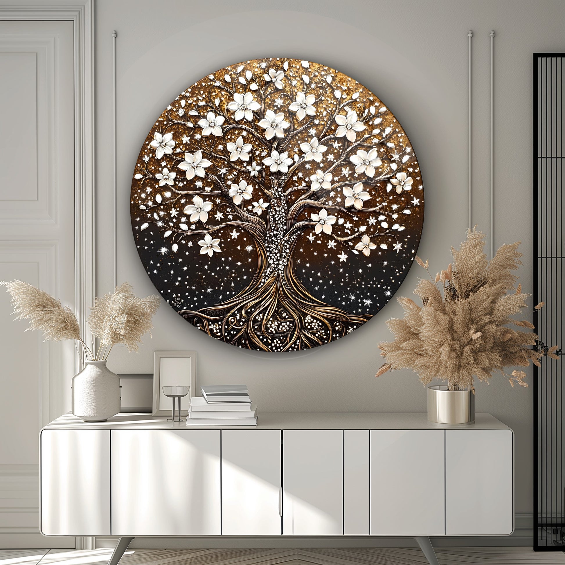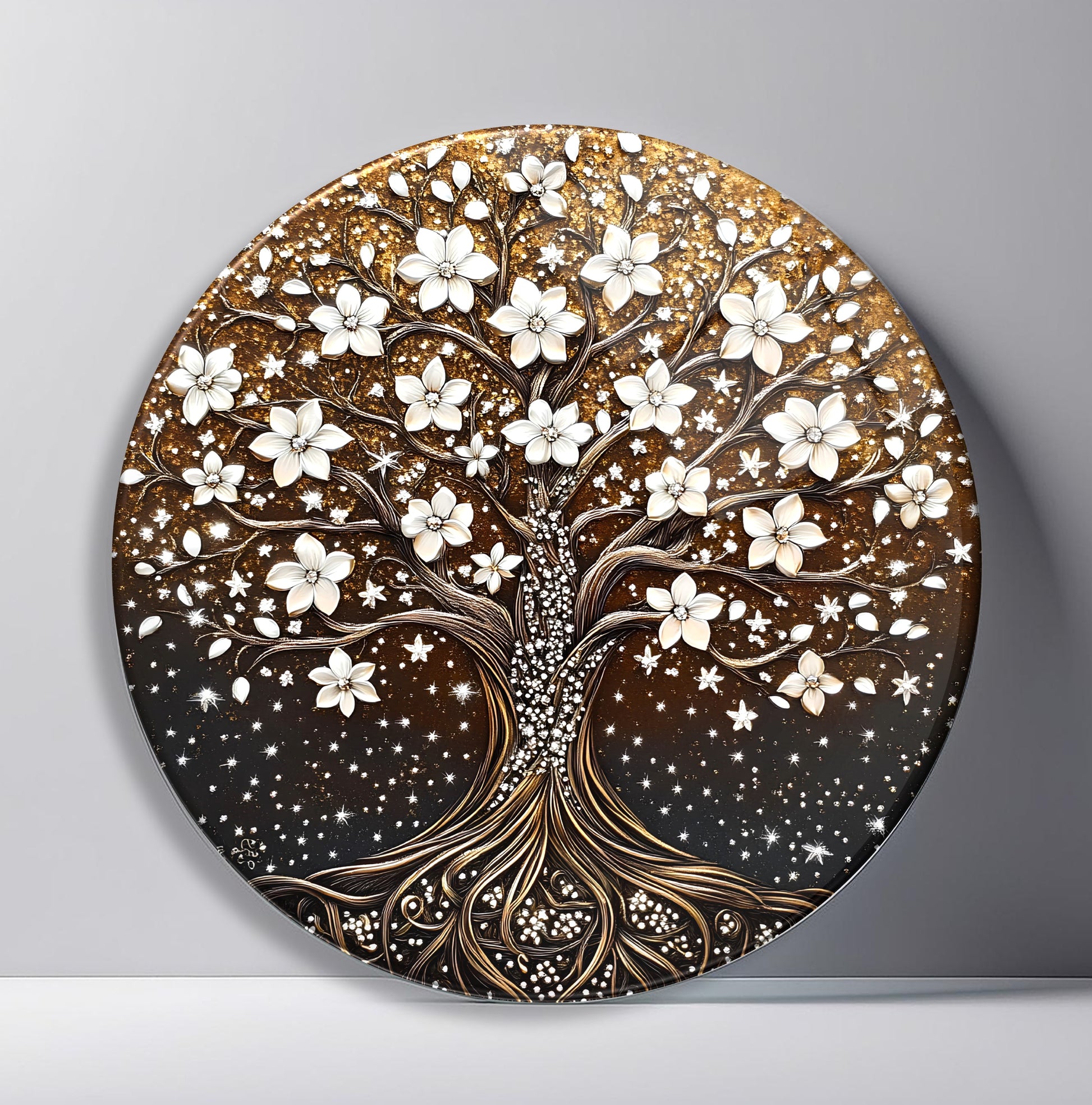 Çiçekli Hayat Ağacı Yuvarlak Cam Tablo