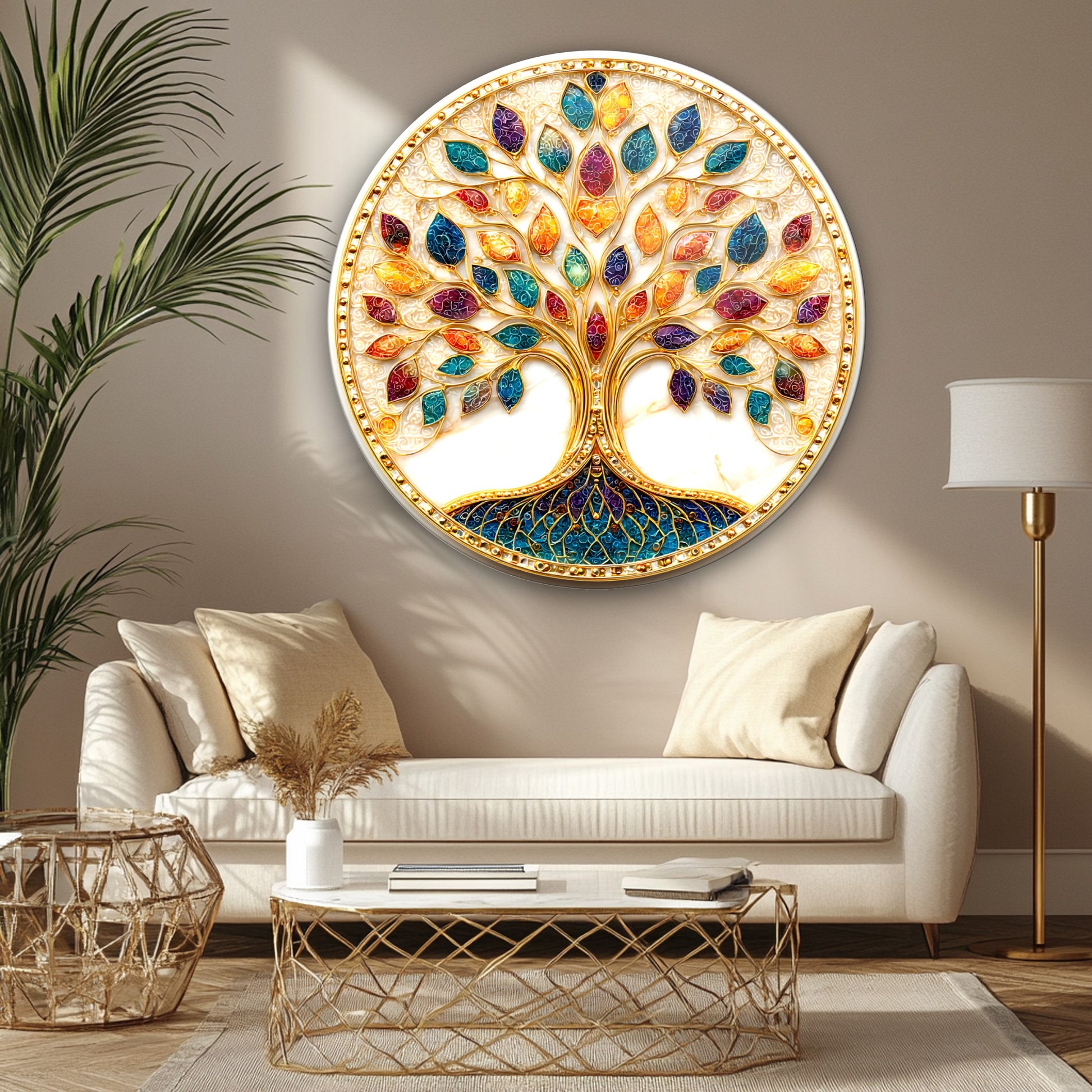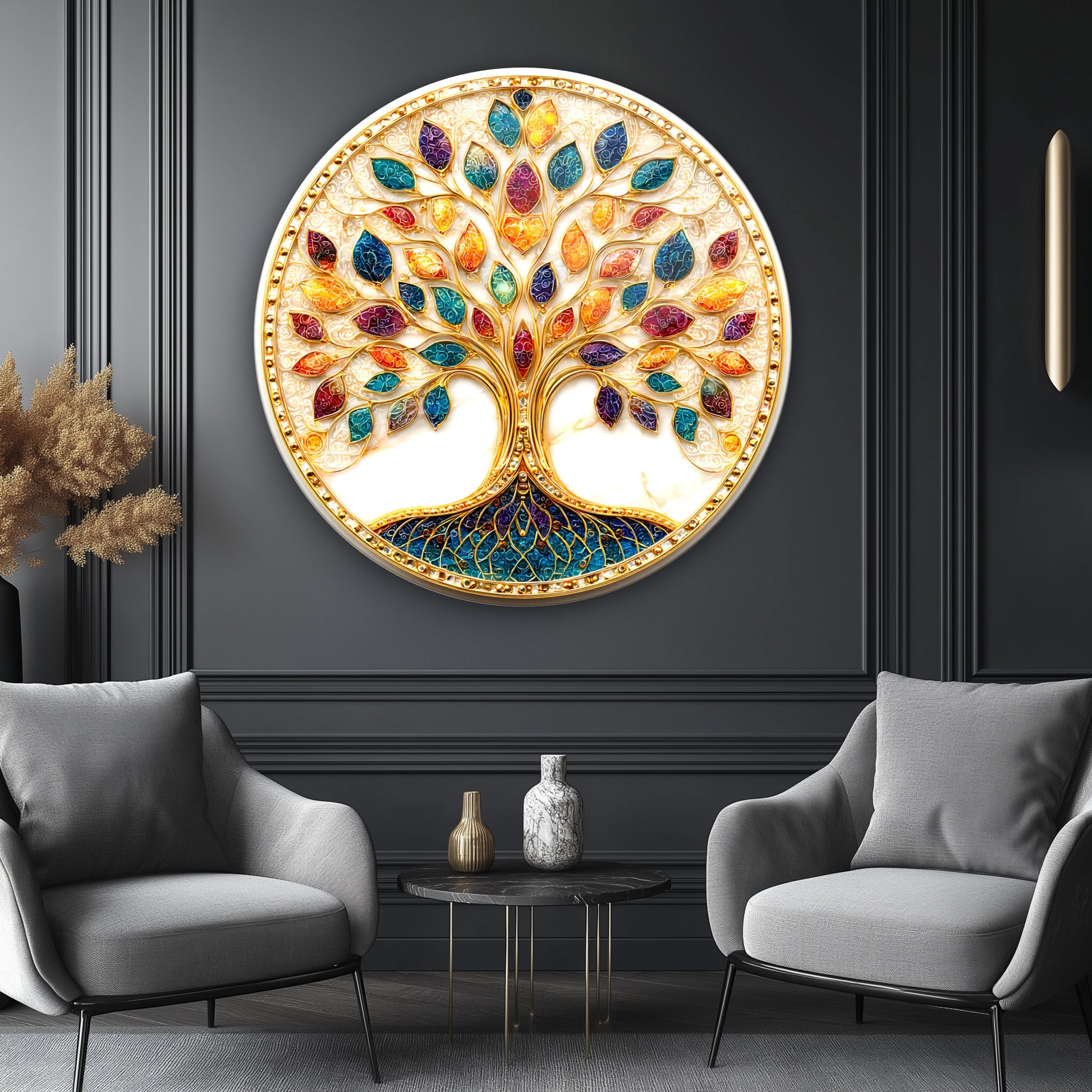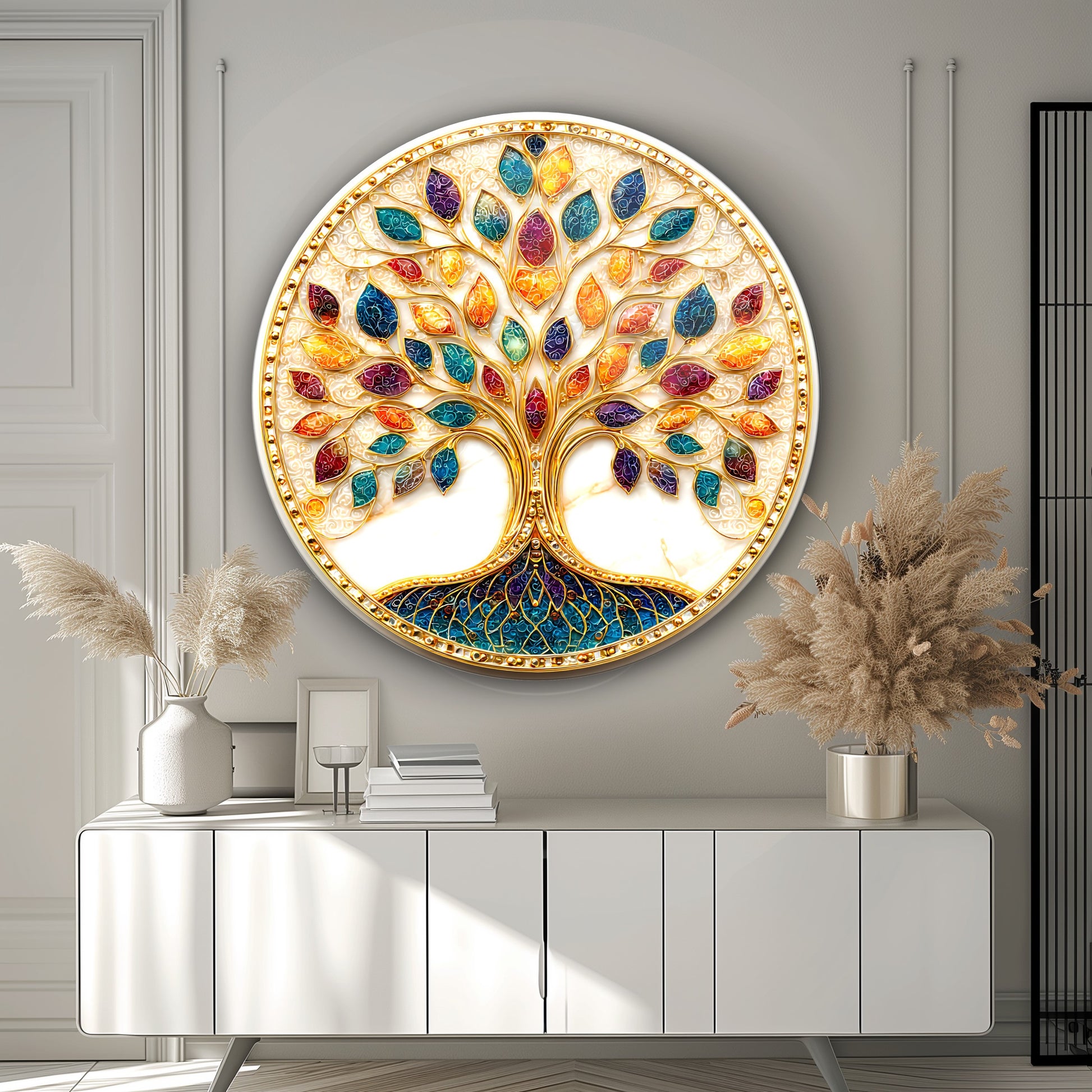 Mücevher Taşlı Gold Hayat Ağacı Yuvarlak Cam Tablo