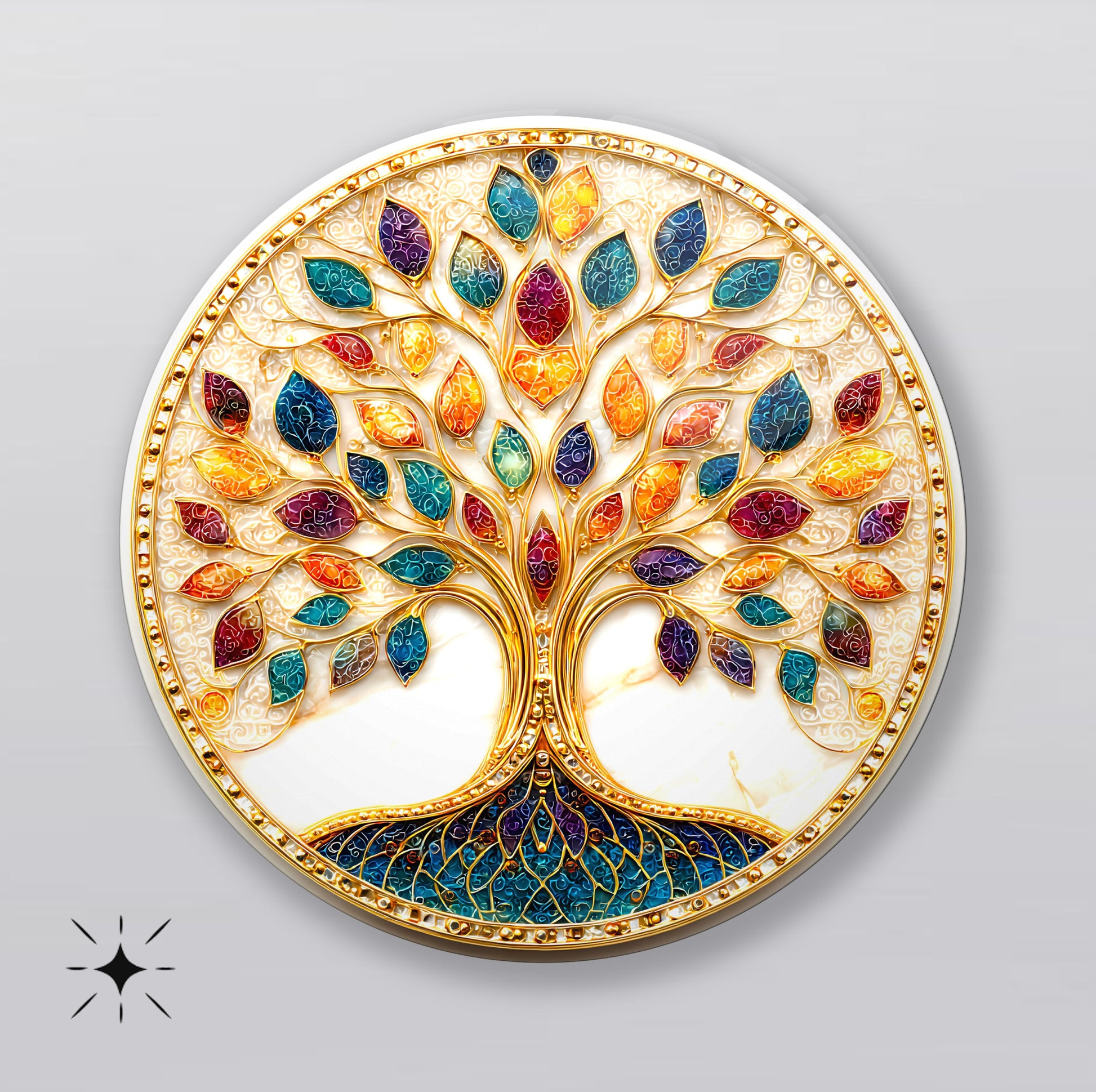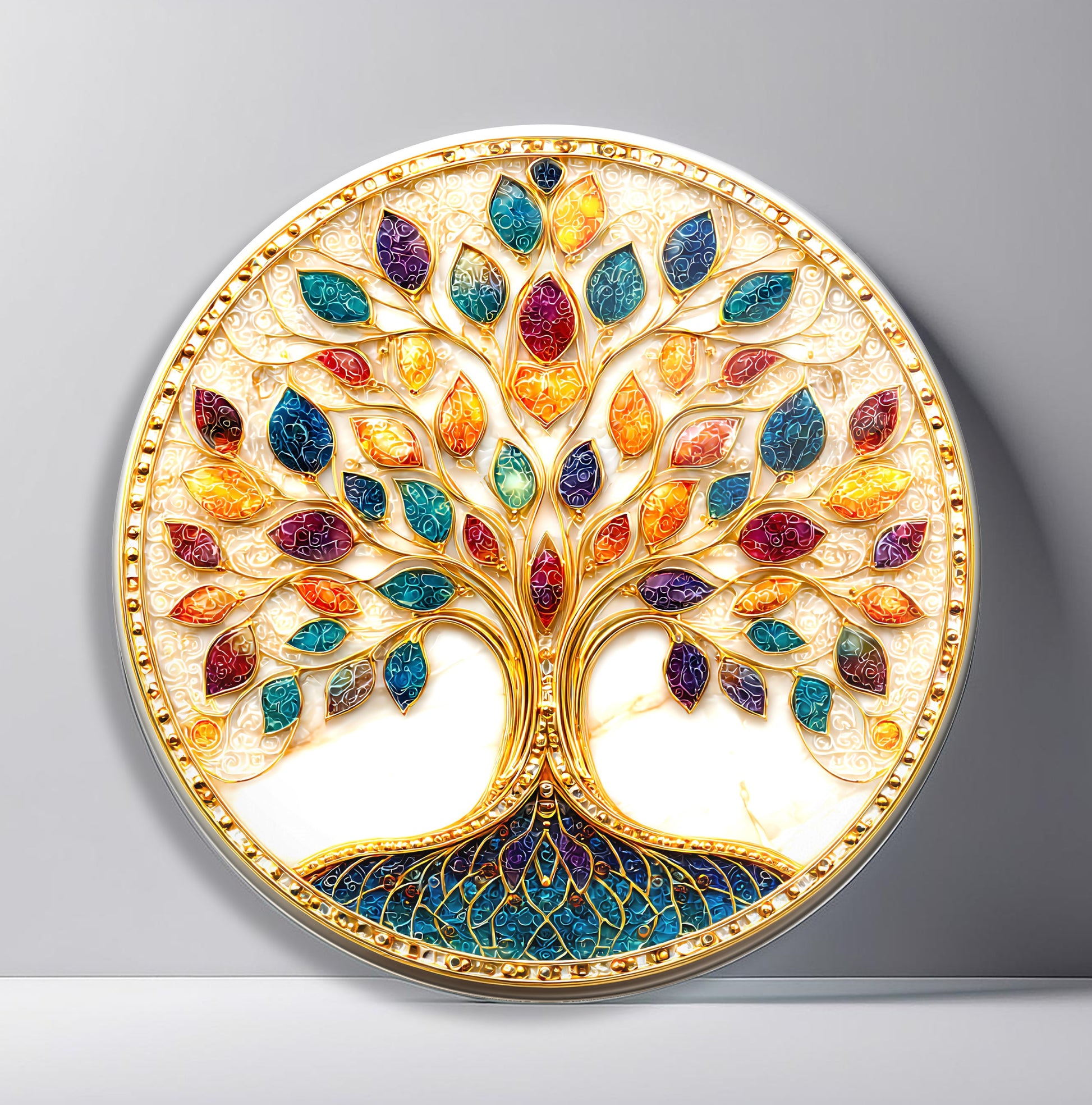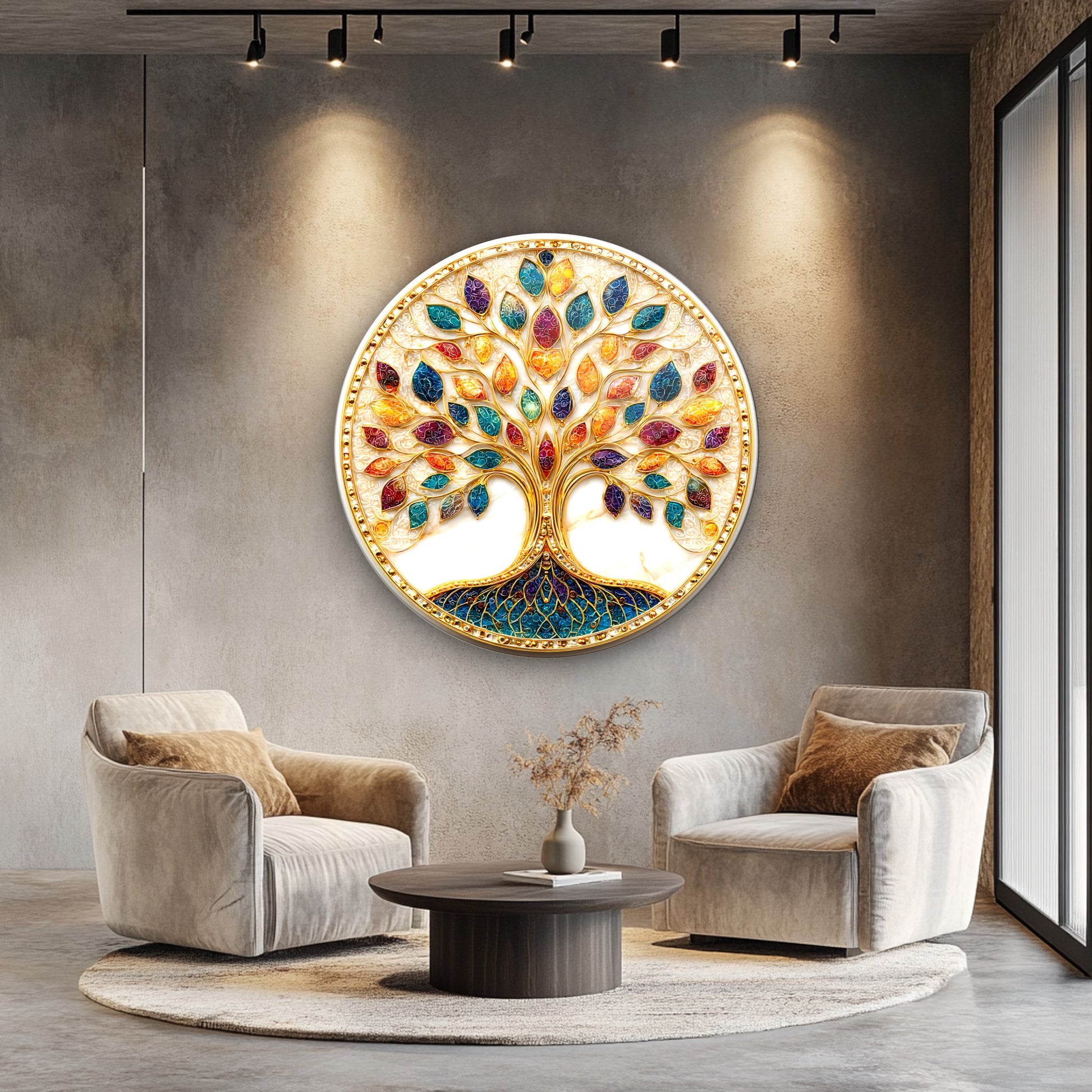 Mücevher Taşlı Gold Hayat Ağacı Yuvarlak Cam Tablo