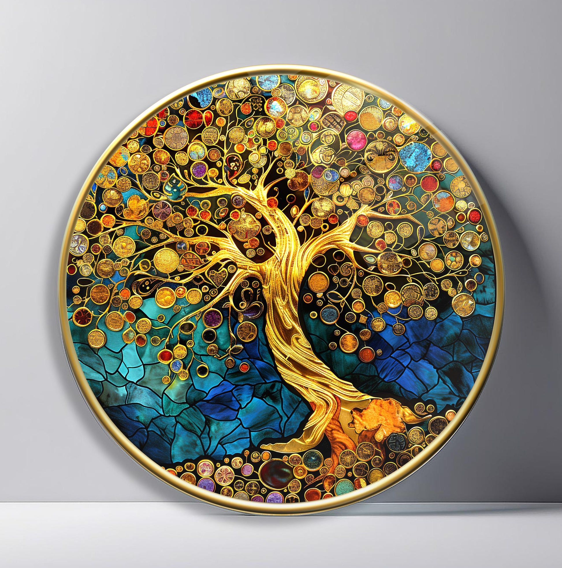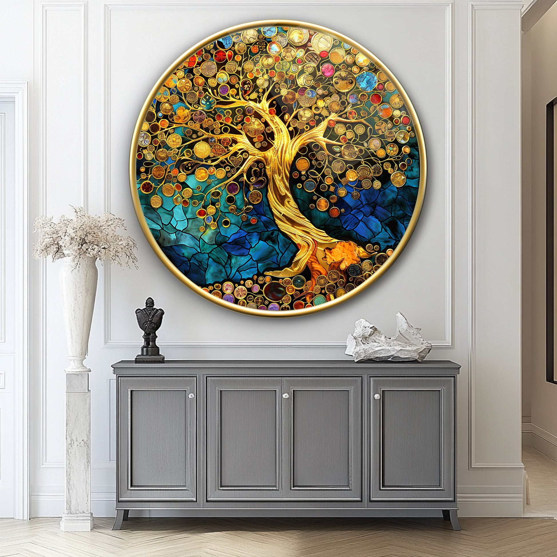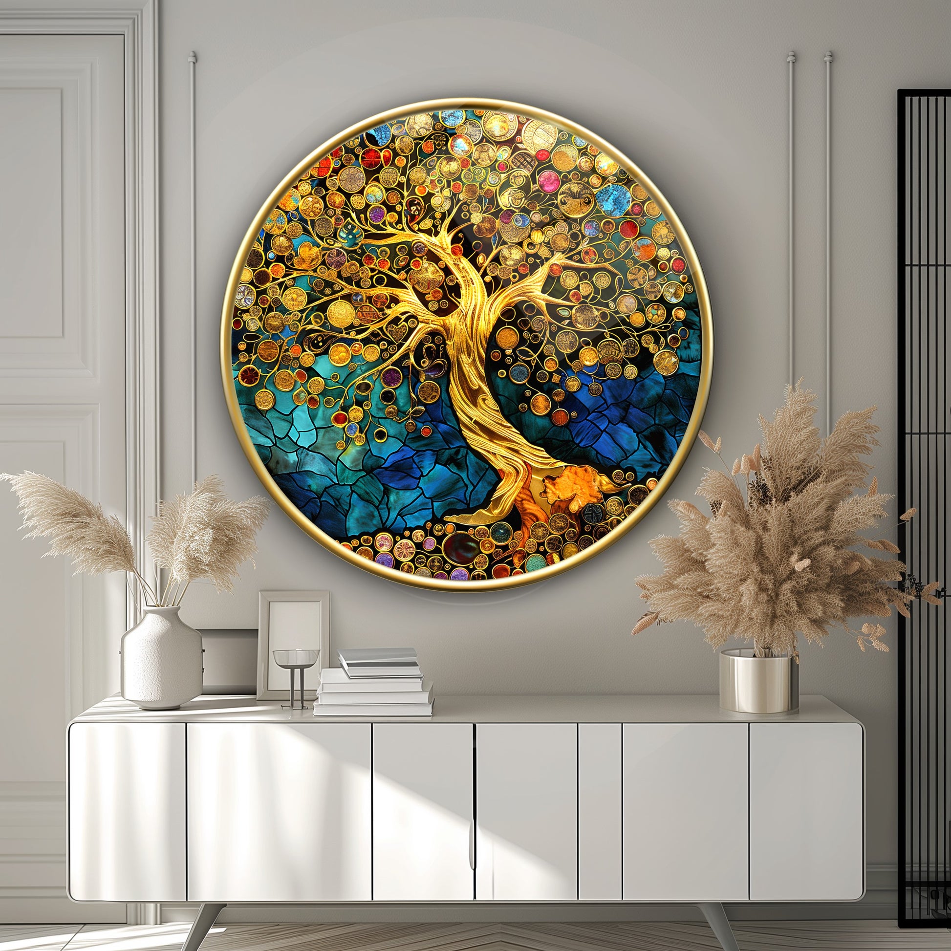 Mücevherli Gold Hayat Ağacı Yuvarlak Cam Tablo