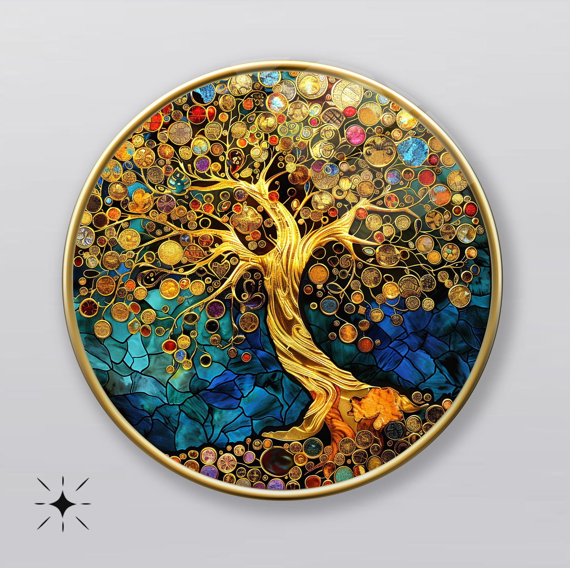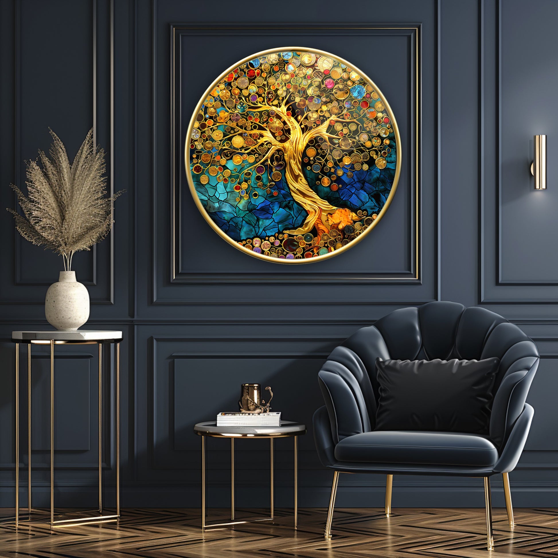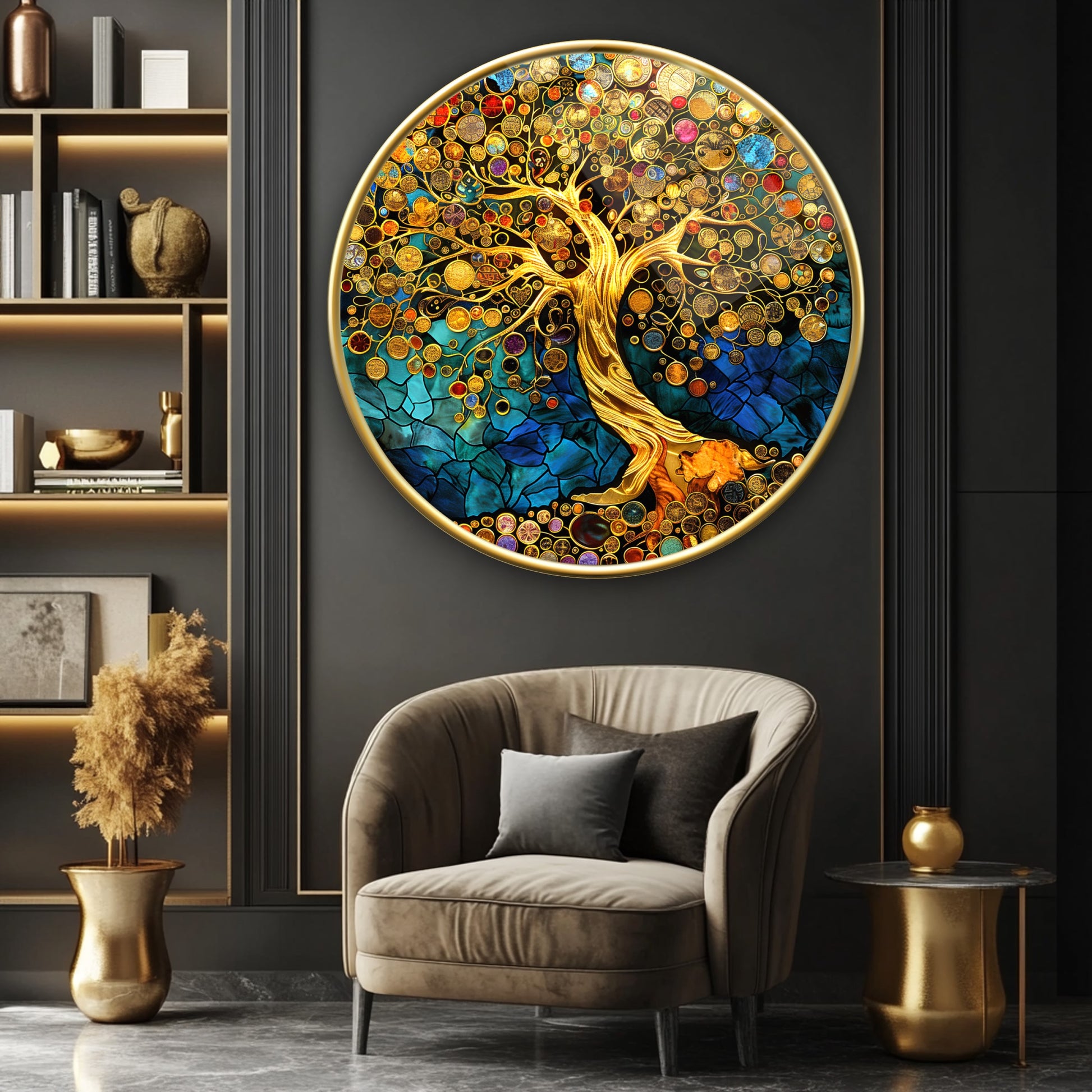 Mücevherli Gold Hayat Ağacı Yuvarlak Cam Tablo