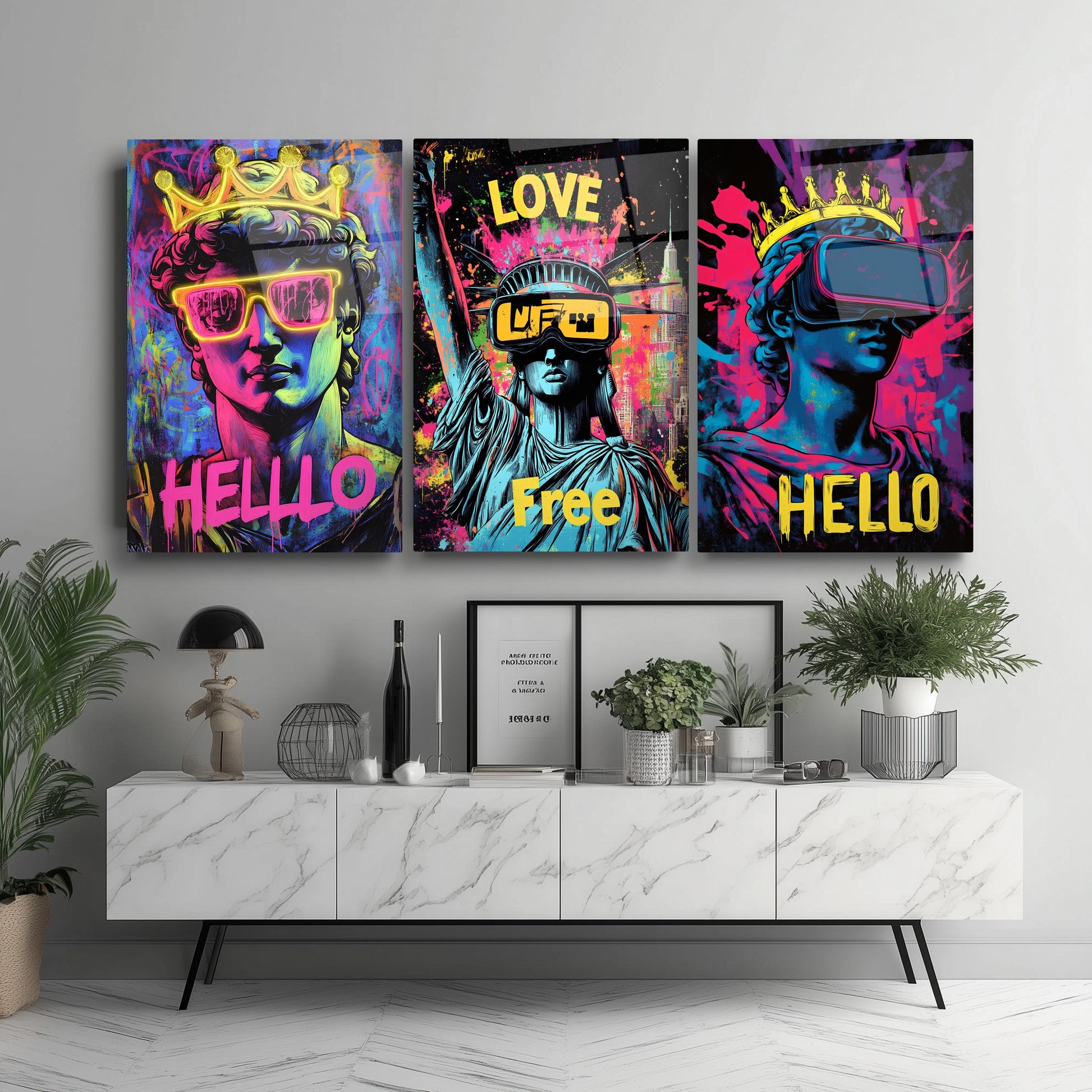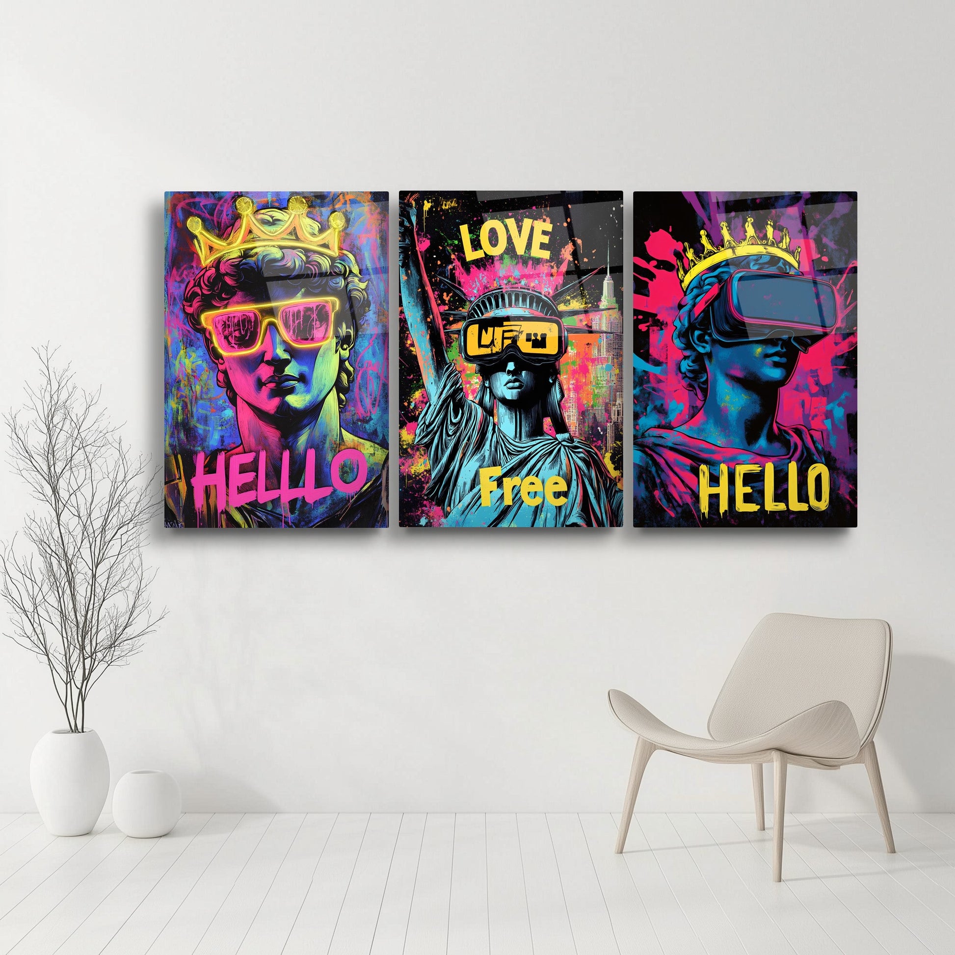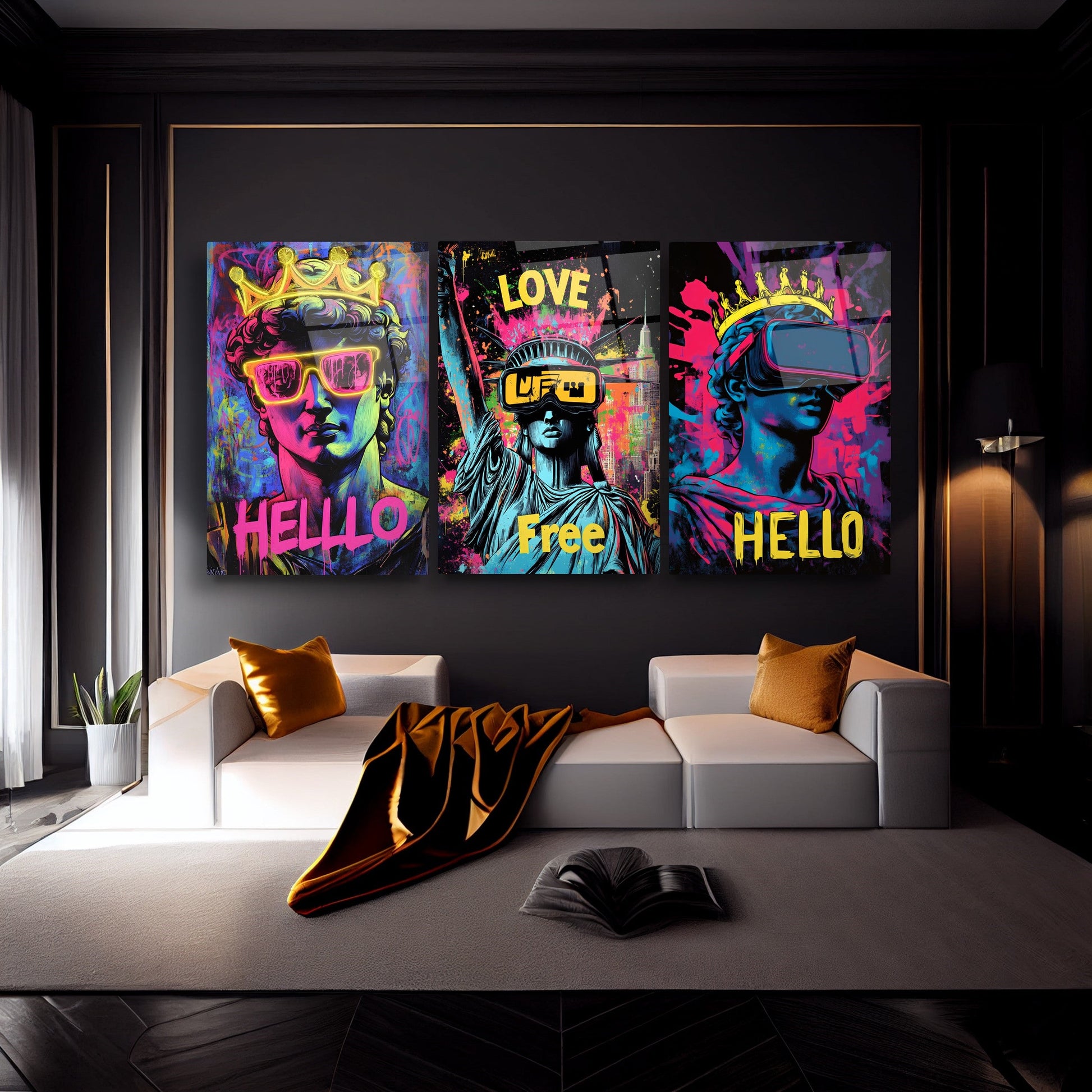 Neon Görünümlü Heykeller Üçlü Set Cam Tablo
