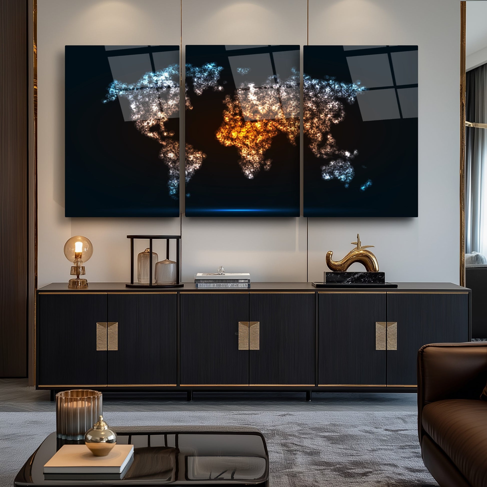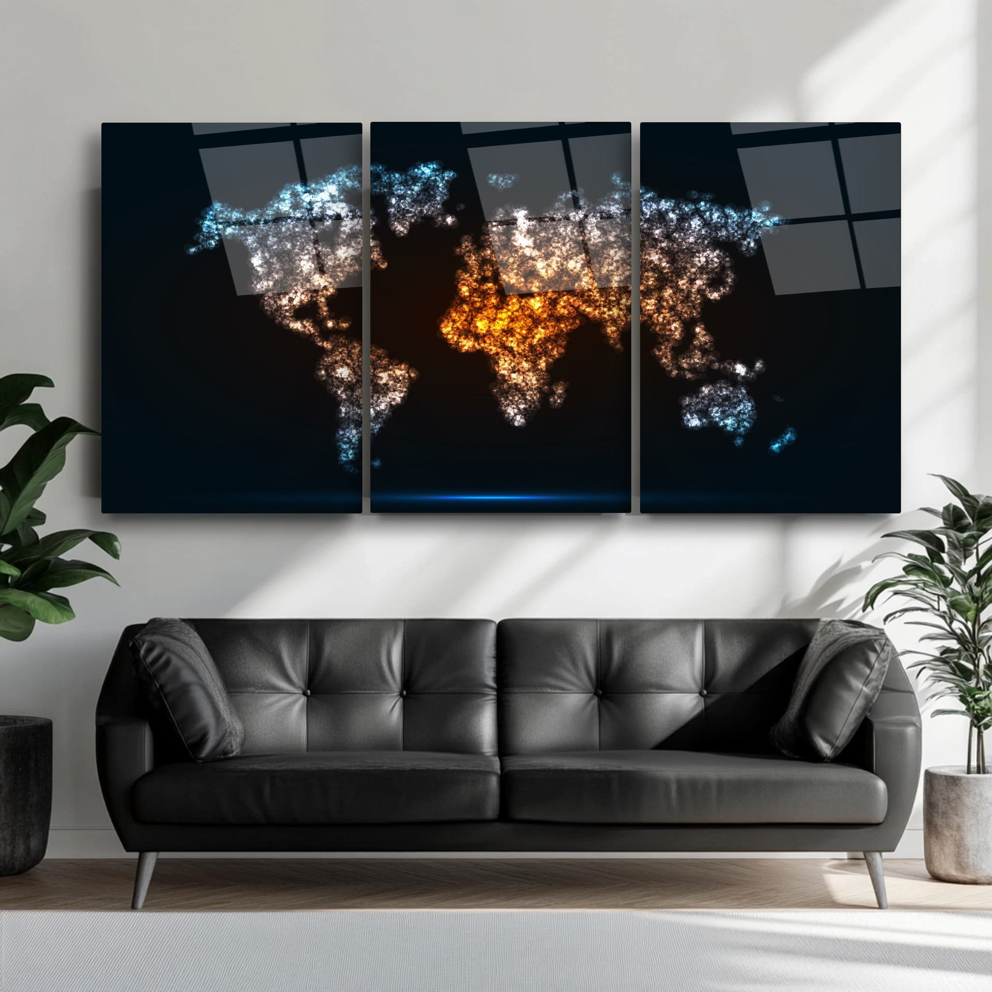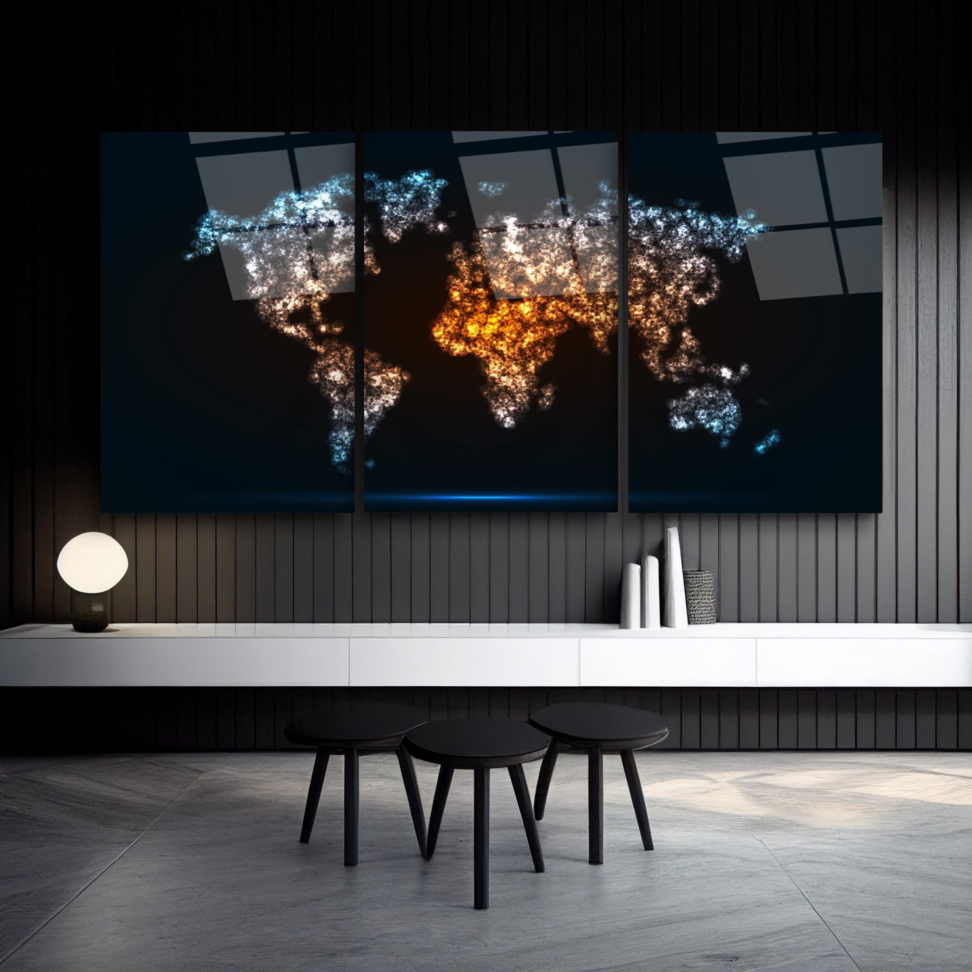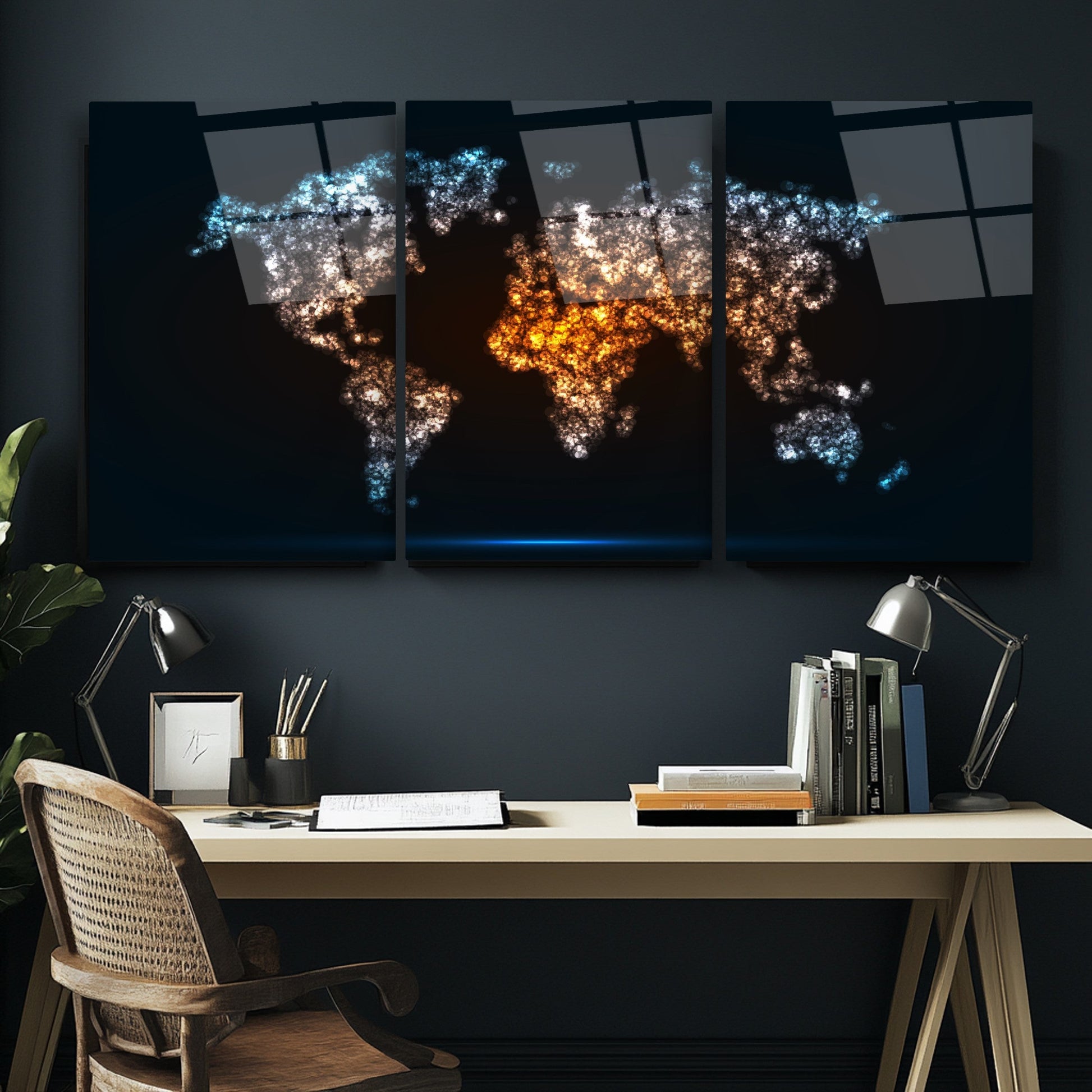 Neon efektli siyah arka plan üzerinde dünya haritası temalı bu üçlü cam tablo seti, modern ofis ve makam odalarına dinamik ve şık bir atmosfer kazandırır. Kırılmaz temperli cam üzerine UV baskı tekniğiyle hazırlanan ürün, hem dayanıklı hem de estetik açıdan üstün bir görsellik sunar. CamDeko kalitesiyle, kurumsal mekanlarda profesyonel bir dokunuş sağlar. Minimalist ve çağdaş tasarımıyla, çalışma alanlarınıza enerjik ve özgün bir hava katmak için ideal bir seçim.