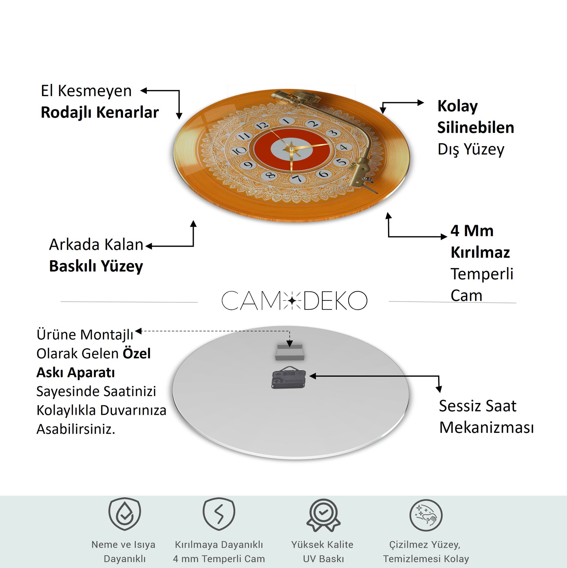 Cam saatlerimiz, son teknoloji UV baskı makineleriyle doğrudan cama uygulanır. Kağıt veya folyo yapıştırma kullanılmaz; baskılar camın arka yüzeyine işlenerek uzun ömürlü ve dayanıklı hale getirilir. Ek olarak, fırınlama boya işlemi ile güçlendirilerek solmaya ve deformasyona karşı ekstra koruma sağlanır.