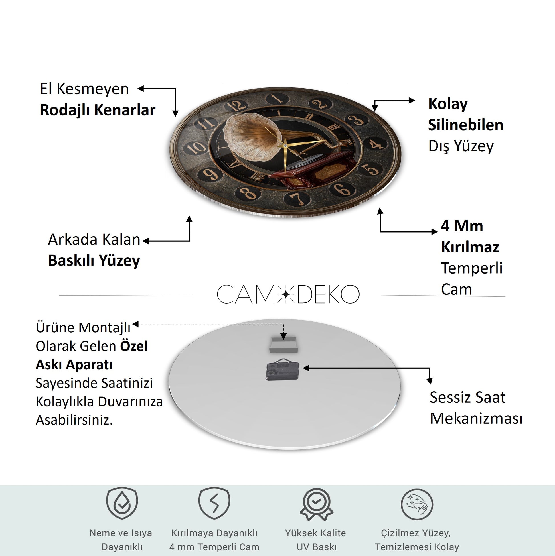 Cam saatlerimiz, son teknoloji UV baskı makineleriyle doğrudan cama uygulanır. Kağıt veya folyo yapıştırma kullanılmaz; baskılar camın arka yüzeyine işlenerek uzun ömürlü ve dayanıklı hale getirilir. Ek olarak, fırınlama boya işlemi ile güçlendirilerek solmaya ve deformasyona karşı ekstra koruma sağlanır.