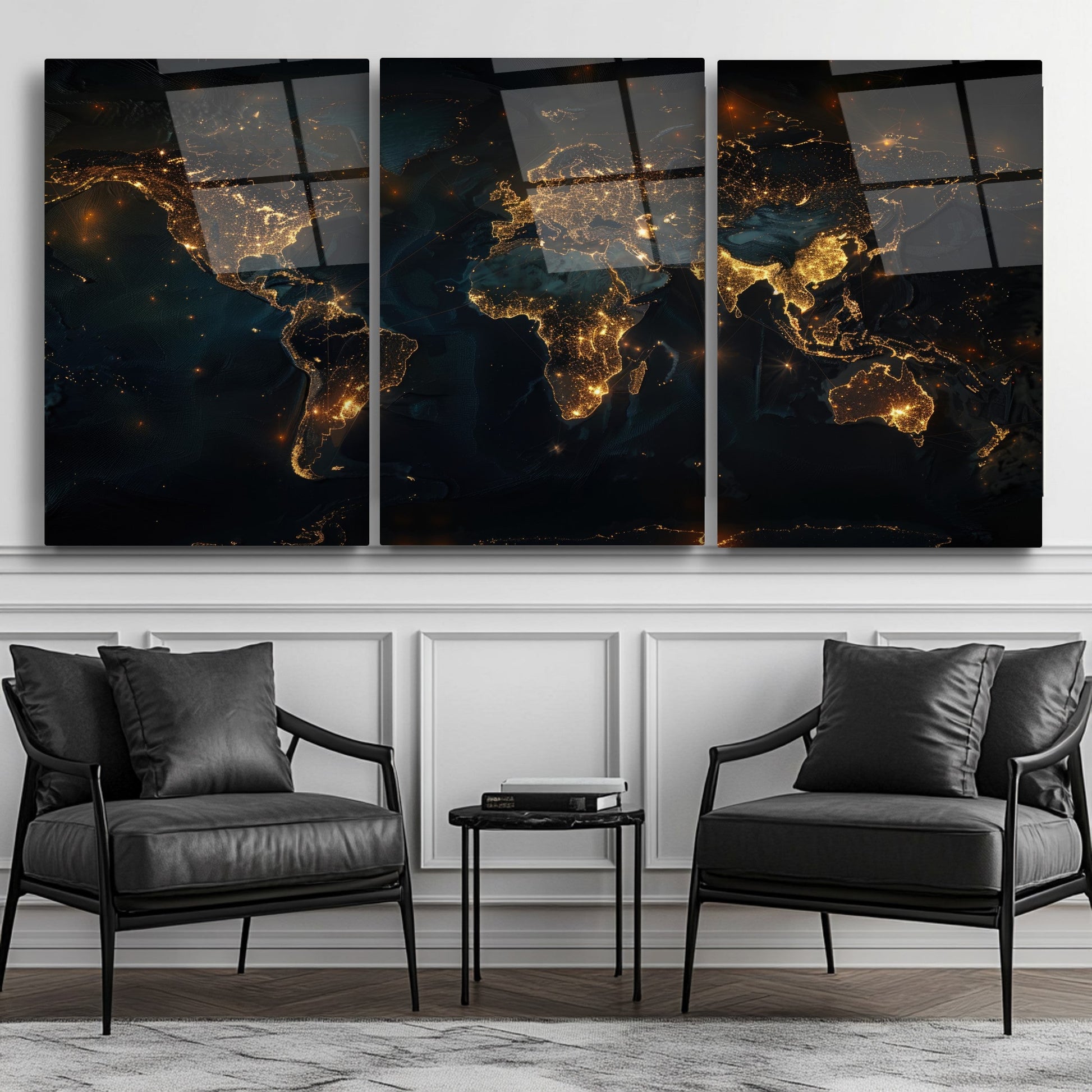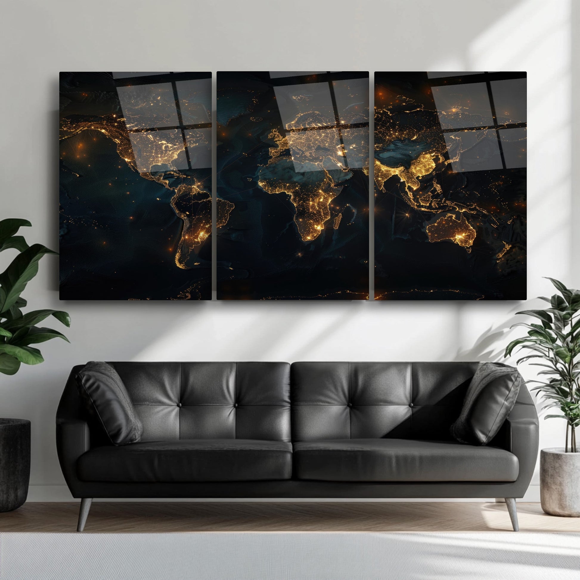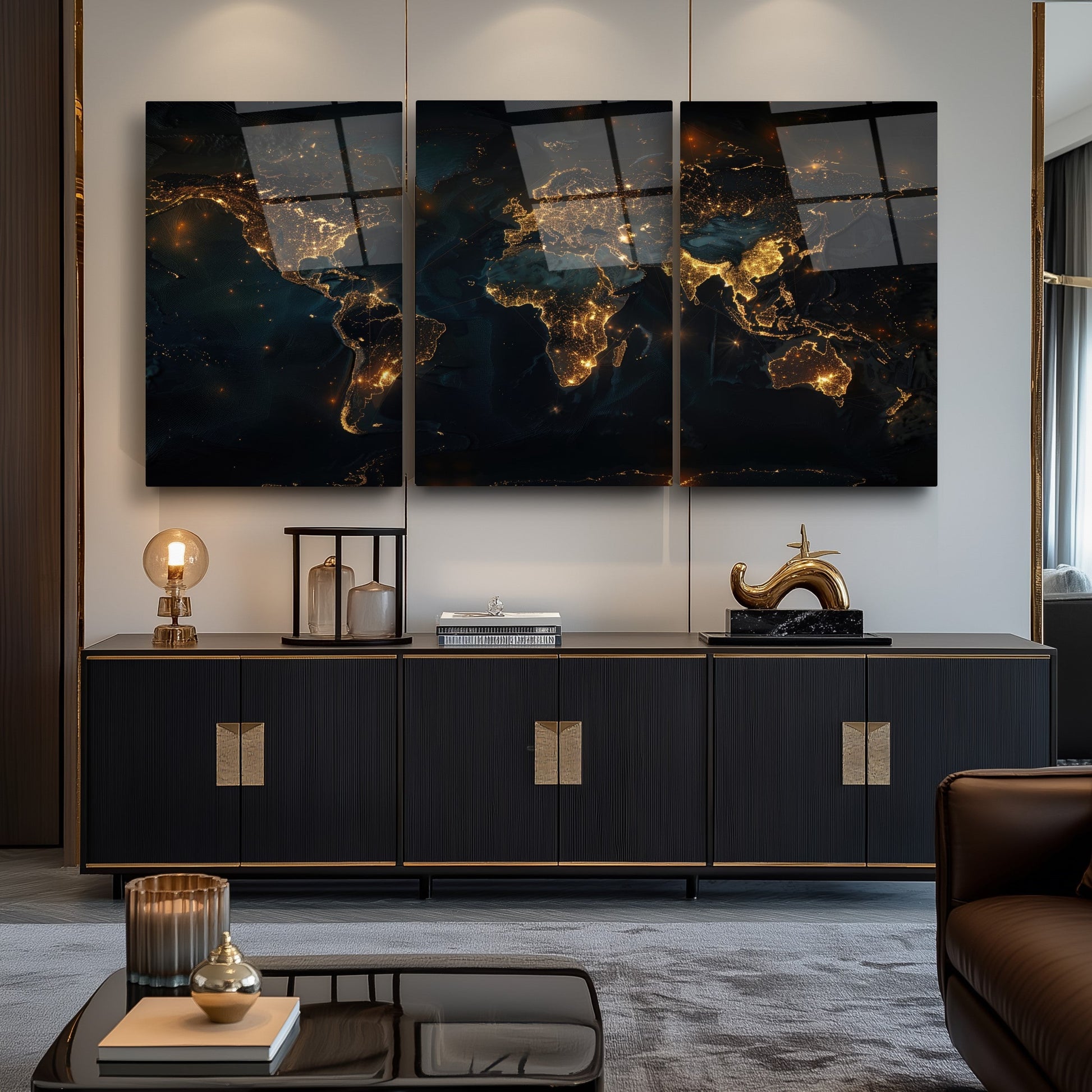 Siyah Gold Dünya Haritası Üçlü Set Cam Tablo
