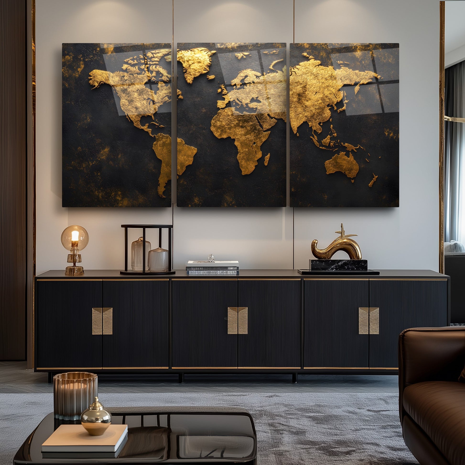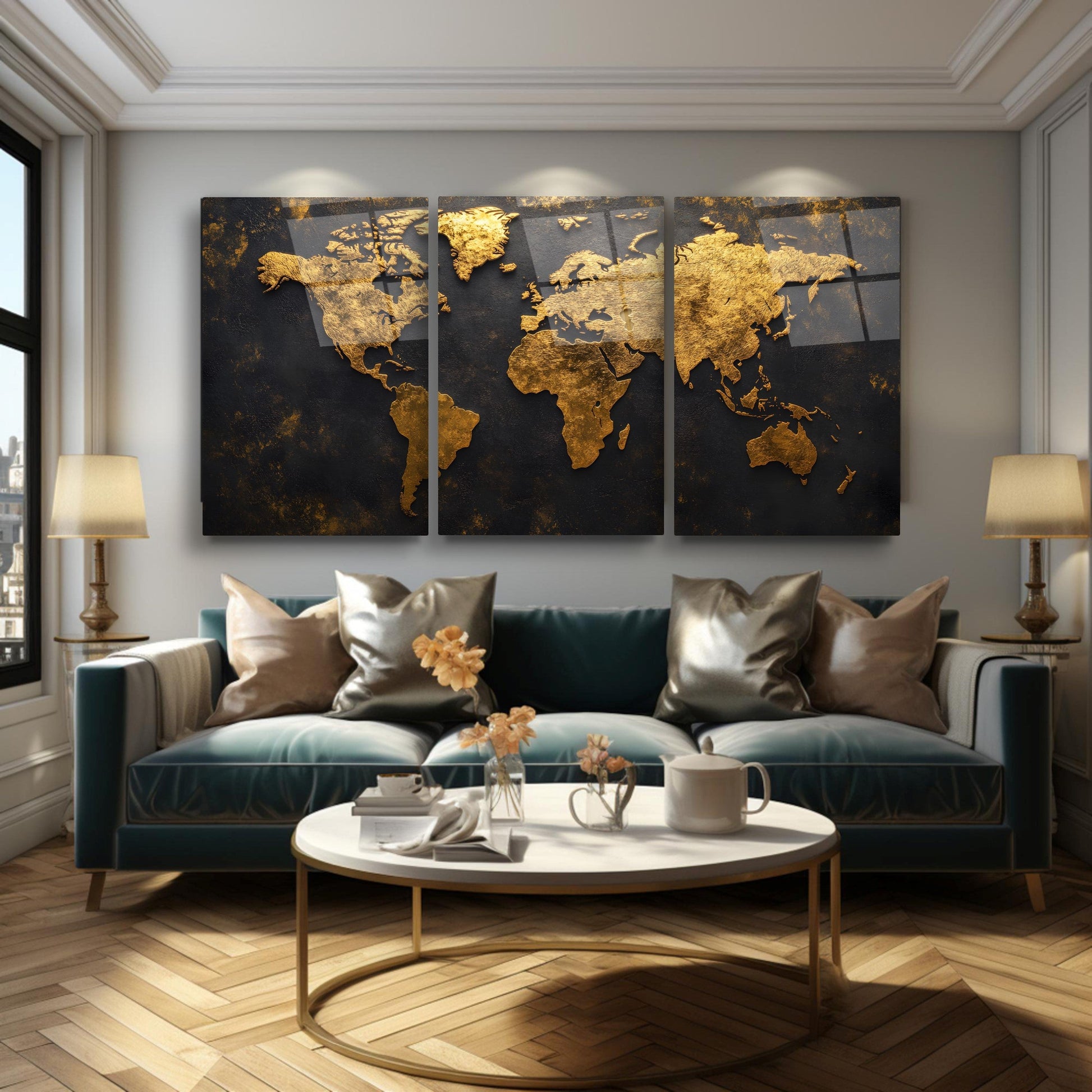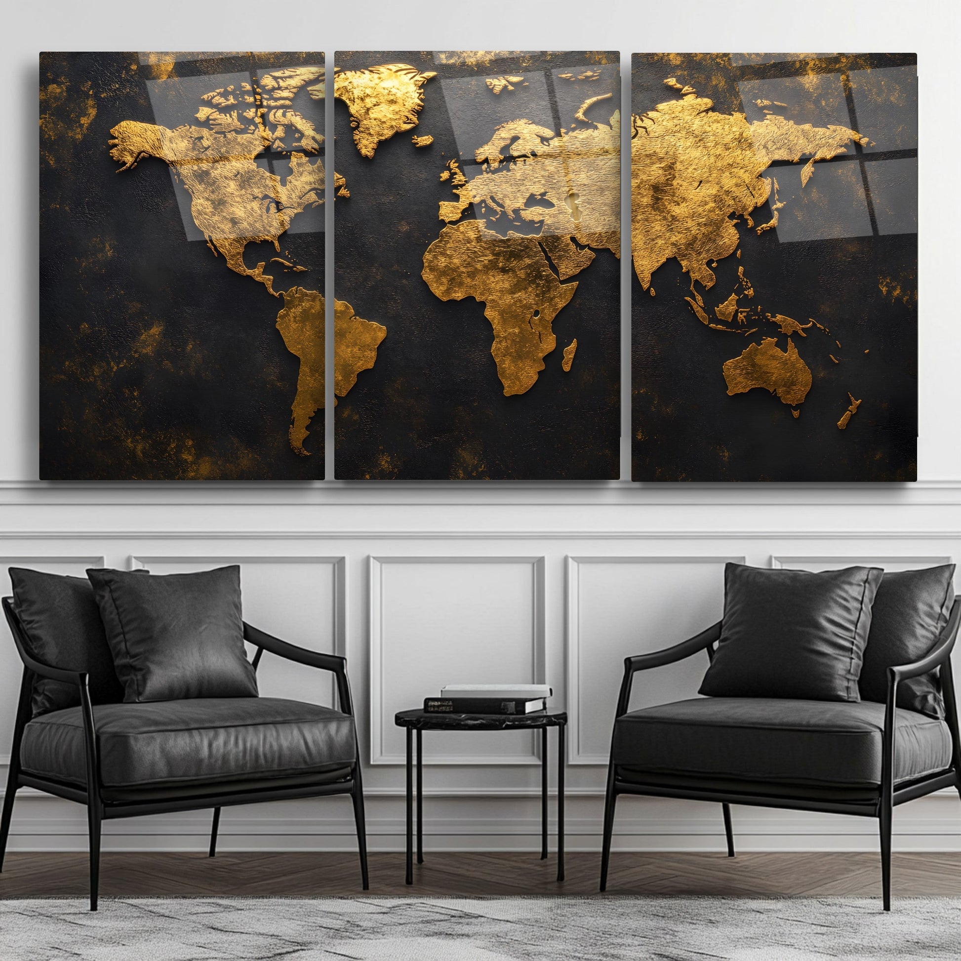 Kabartma Desenli Gold Dünya Haritası Üçlü Set Cam Tablo